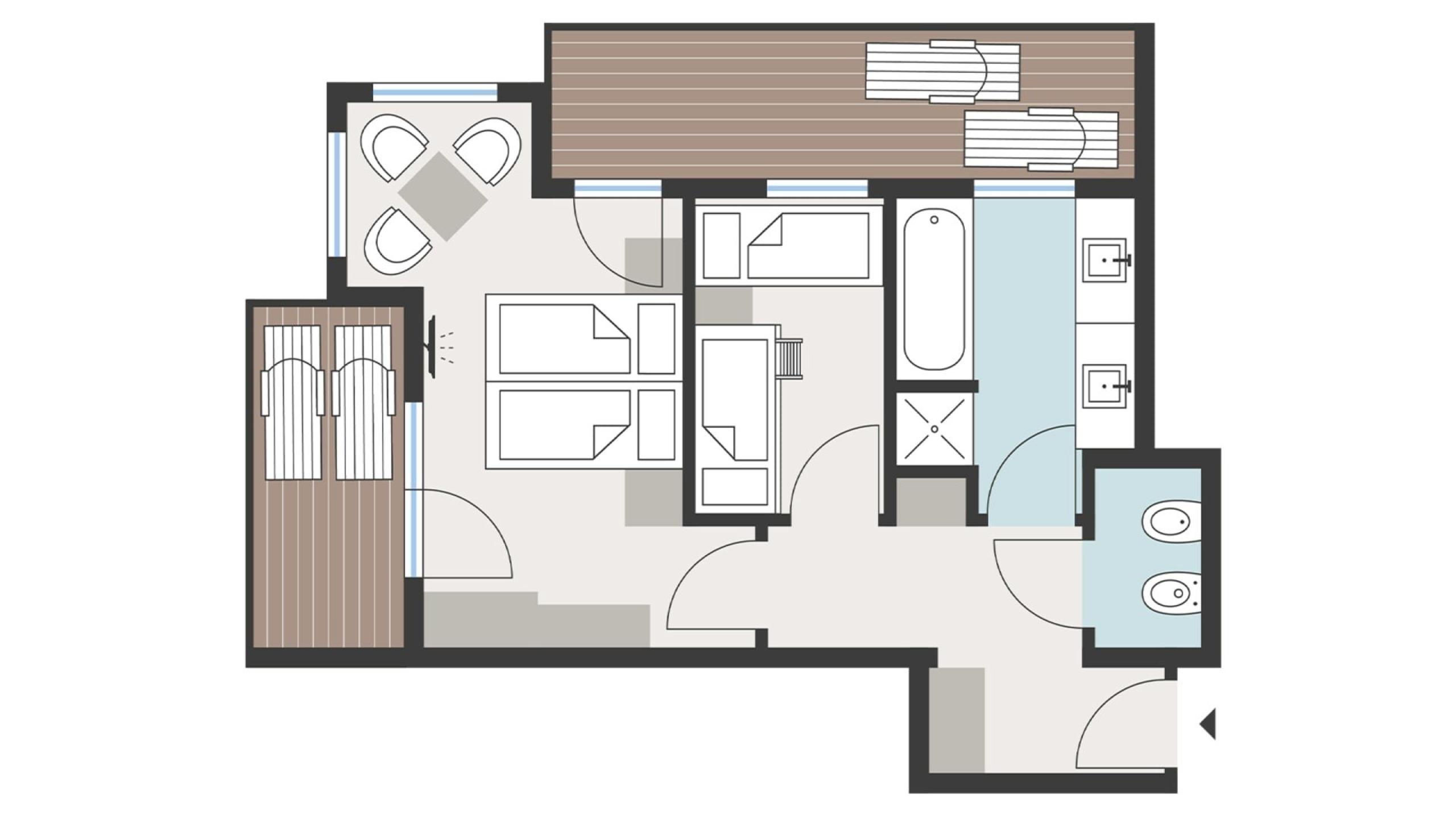 Large family suite with panorama bay window in living / sleeping area, separate children's bedroom with bunk beds, bathroom with twin basins, bathtub and bidet, separate WC; two large balconies with southern / southwestern exposure