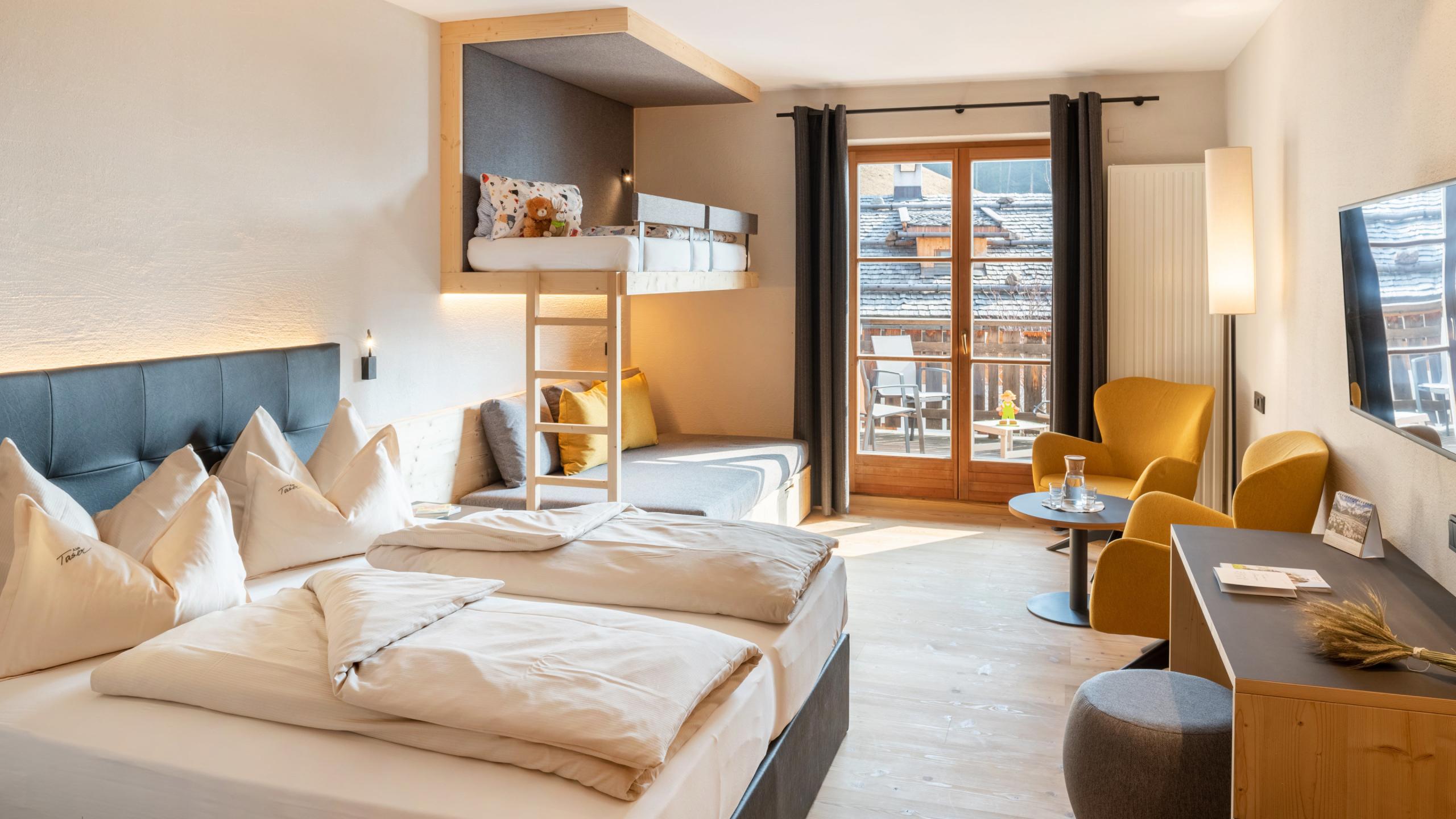 Double room Laugenspitze, with a size of 28-30 m², in typical South Tyrolean style with a large balcony, shower, WC, hair dryer, refrigerator, WLAN, telephone, safe, tv and facilities for babies and children