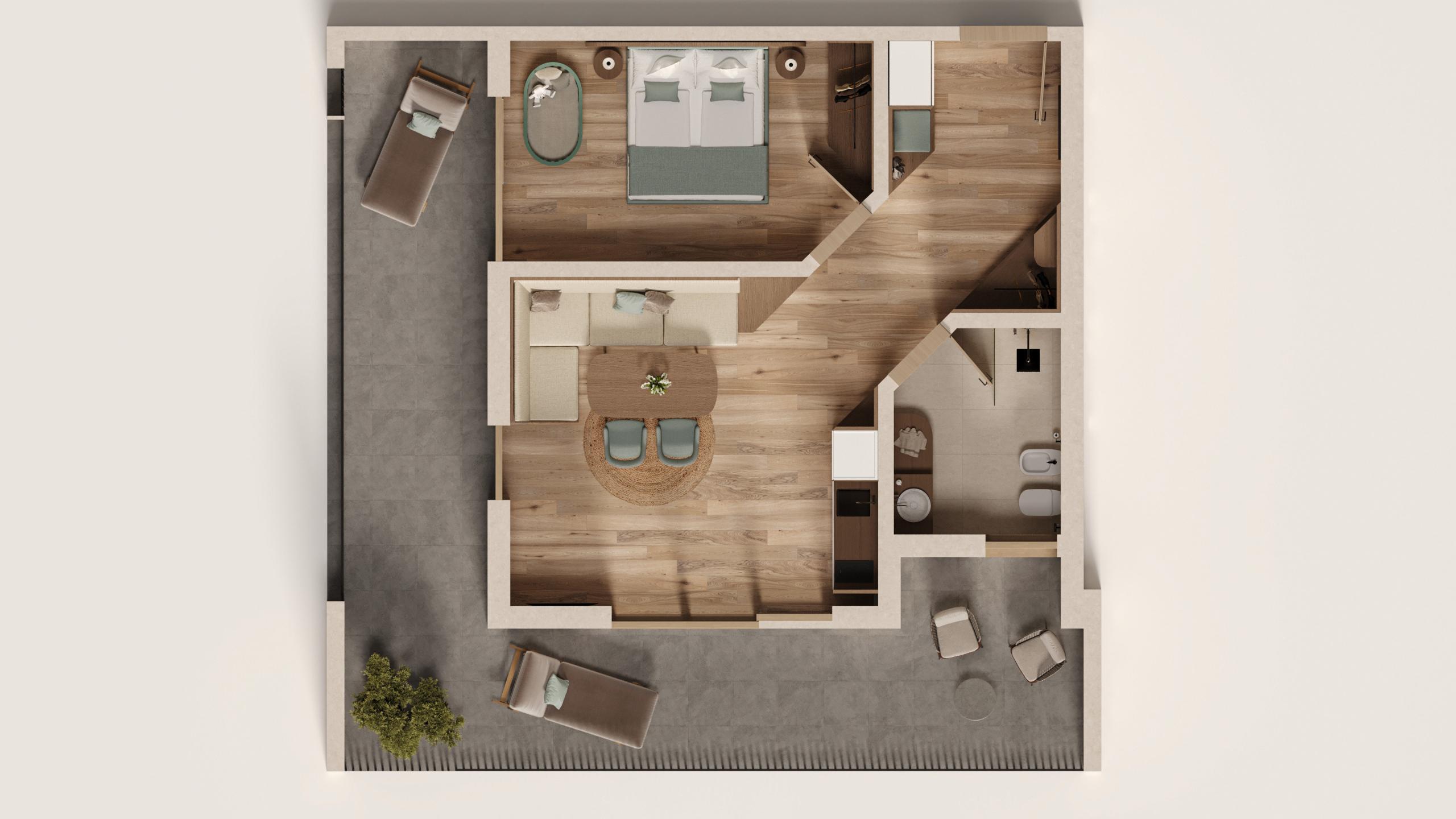 Kitchen with dining area and table, microwave, Nespresso machine, kettle, dishwasher, sofa, safe, 1 satellite TV, free Wi-Fi, bathrobes, towels, wellness bag with bath towels, bathroom with shower, toilet, bidet, hairdryer, bedroom with double bed with space for an additional bed, spacious balcony with sun loungers.