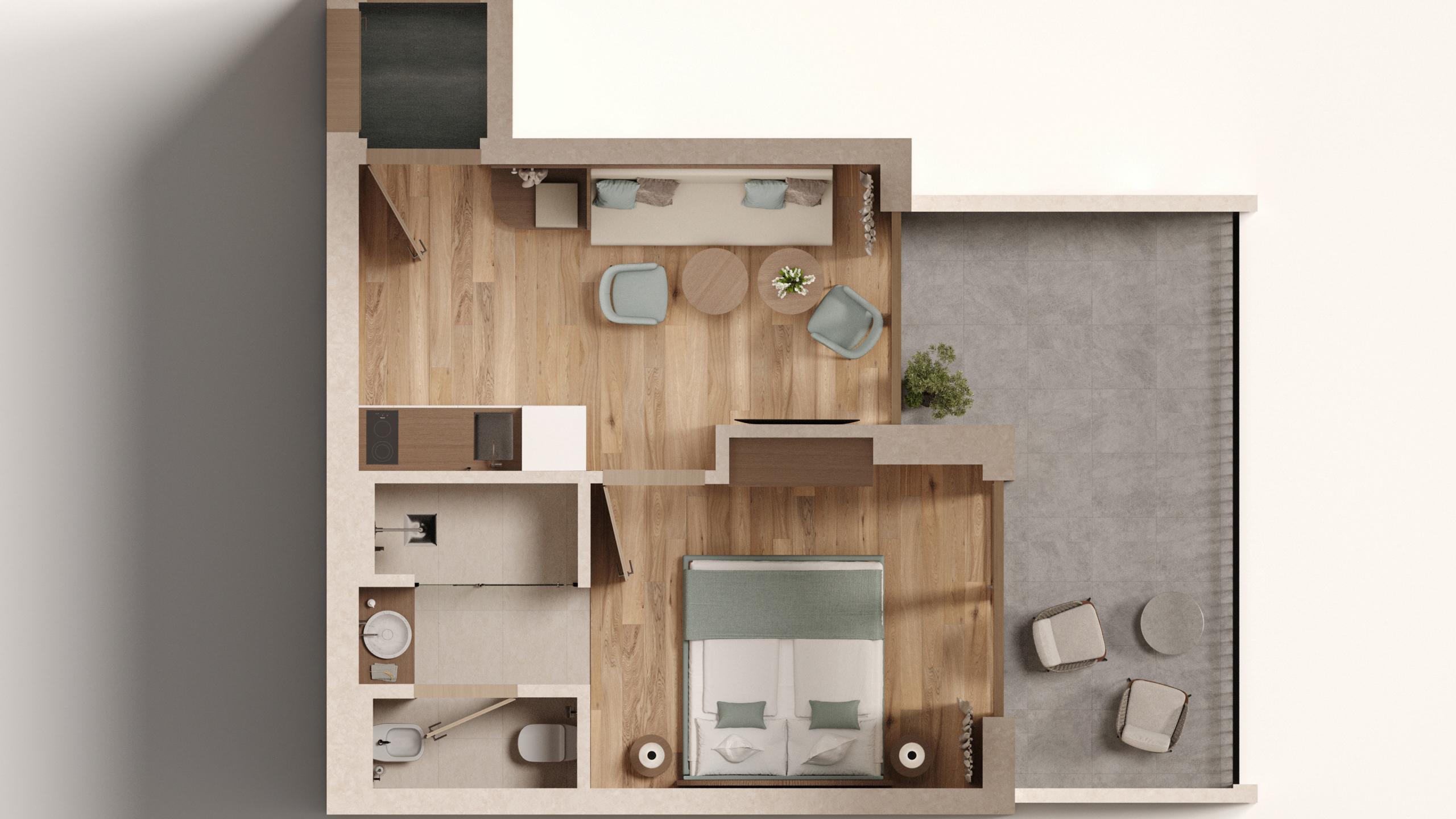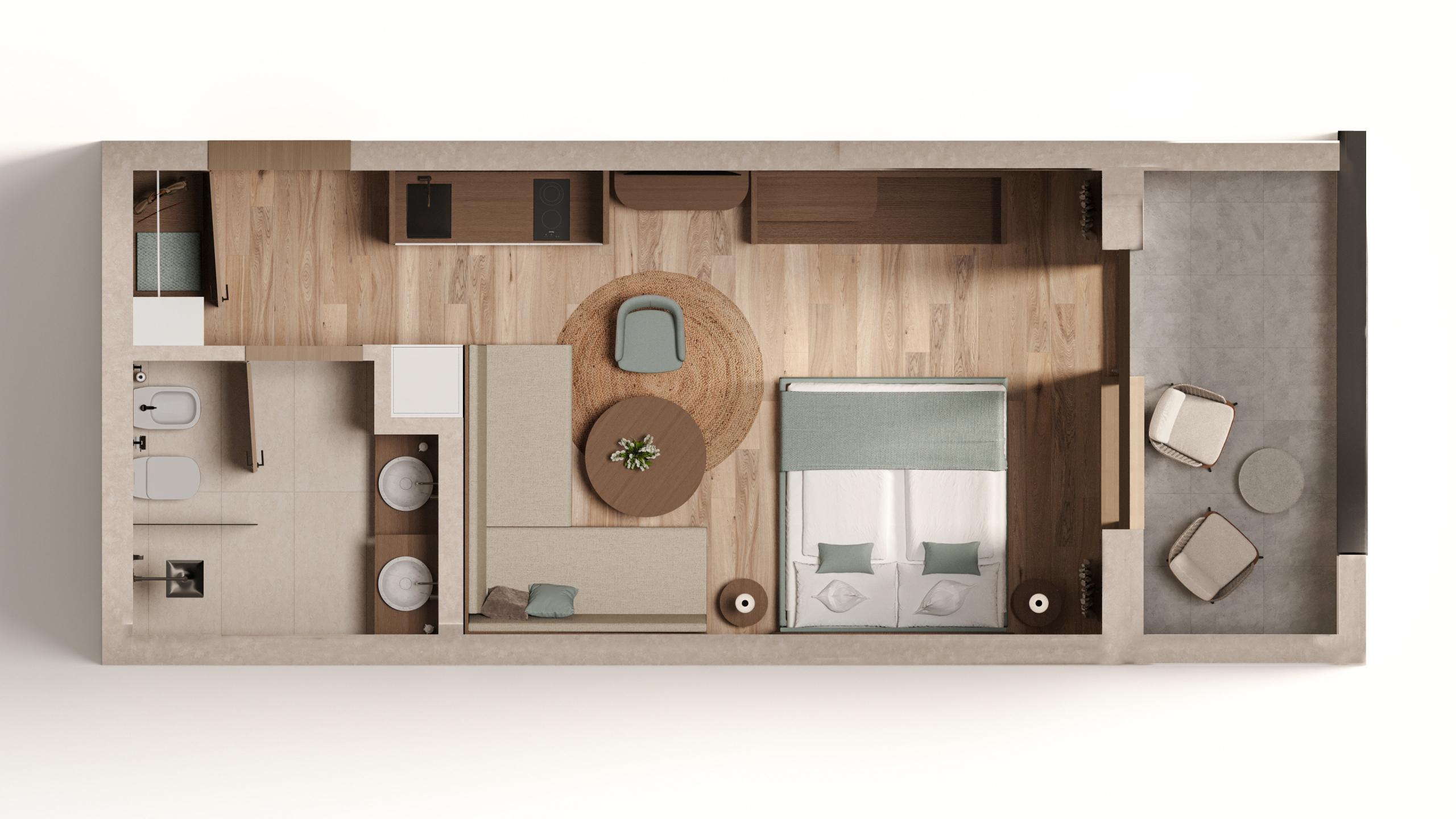 Small kitchen with dining area and table, microwave, Nespresso machine, kettle, dishwasher, sofa, safe, 1 satellite TV, free Wi-Fi, bathrobes, towels, wellness bag with bath towels, bathroom with shower, toilet, bidet, hairdryer, double bed and the option of an additional bed, balcony.
