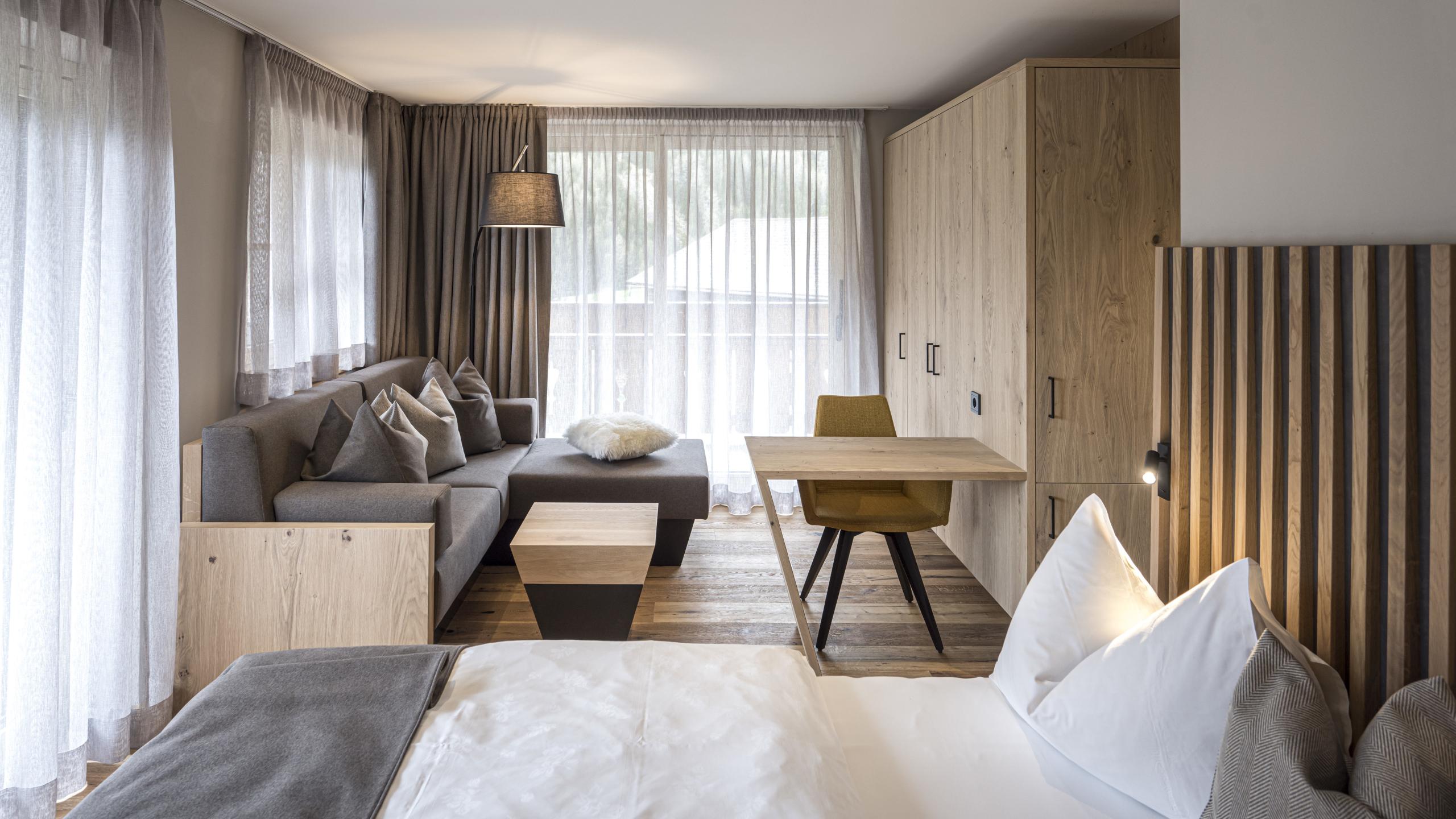 Suite with separated children's room, faces south, approx. 36 m², wooden floor, bunk bed, big bathroom with bath tub, WC, bidet, Flat-TV, W-LAN, safe, hair dryer, make-up mirror, telephone, balcony, cosy bath robe and slippers.