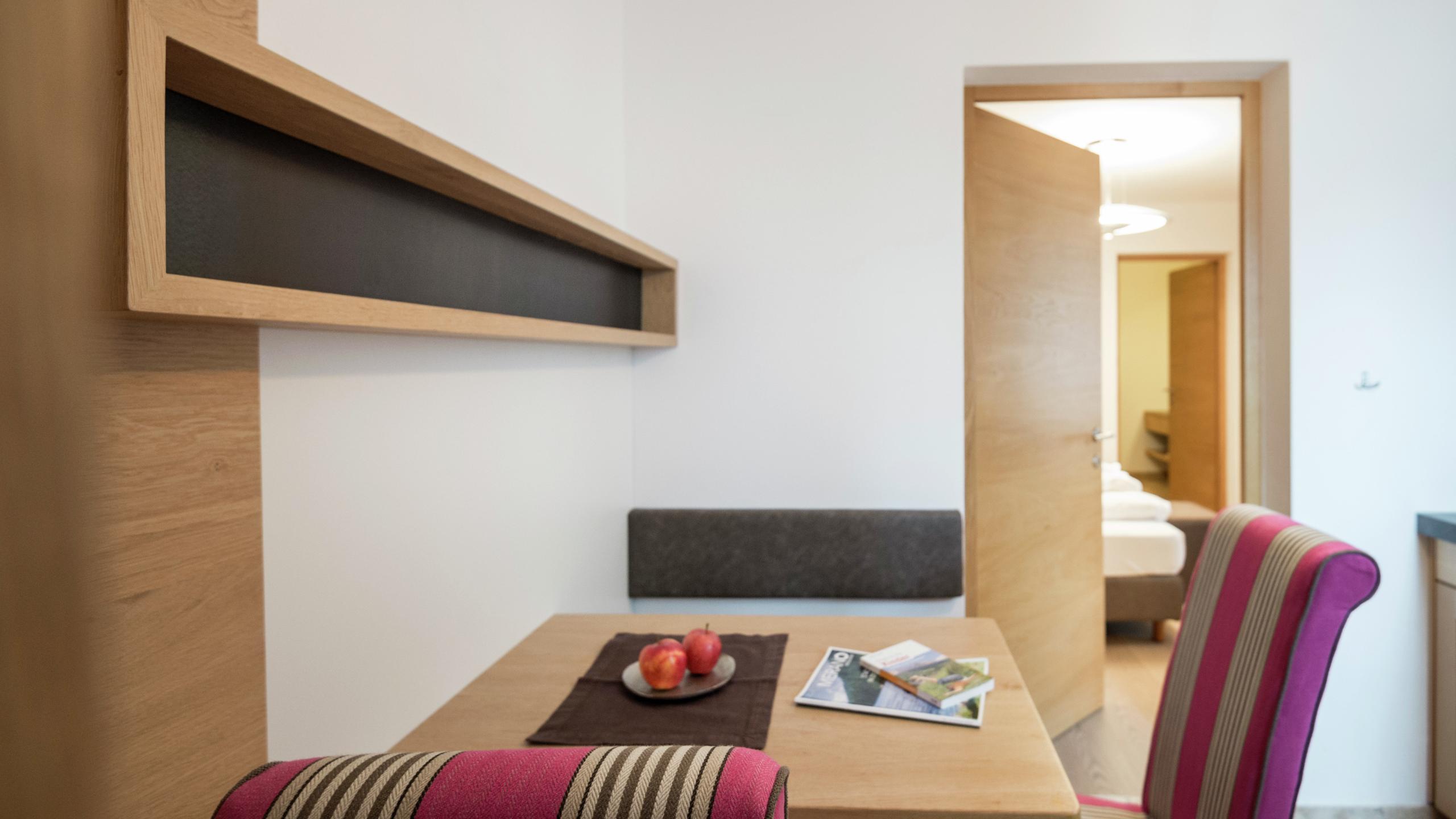 One-room apartment, east side in the annex with small garden terrace facing Merano, bedroom with single sofa or space for a baby cot, kitchenette with seating area and dishwasher, bathroom with shower, toilet, cosy bathrobes and bath bag, hairdryer, free WiFi, satellite TV, approx. 25 m²