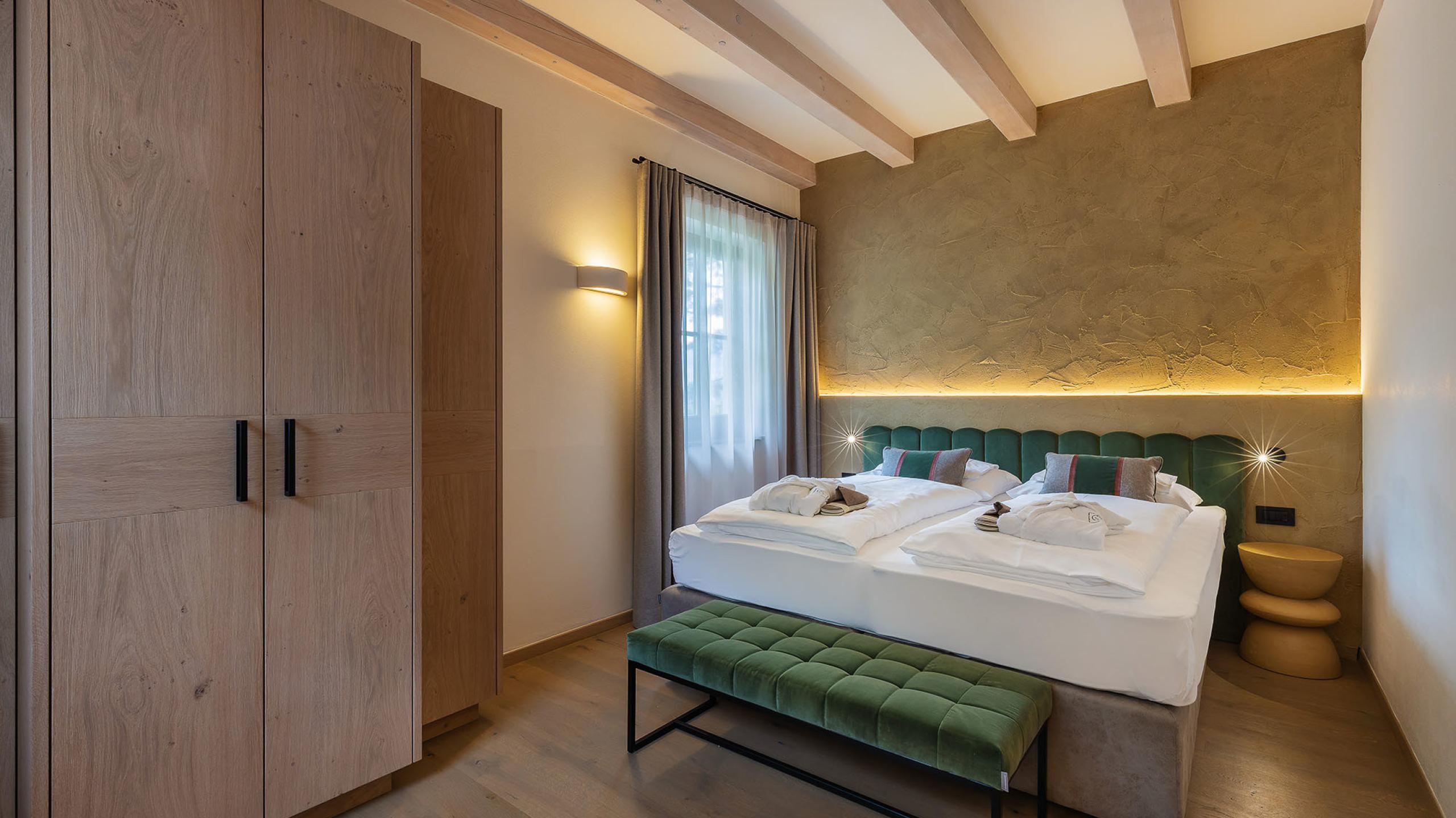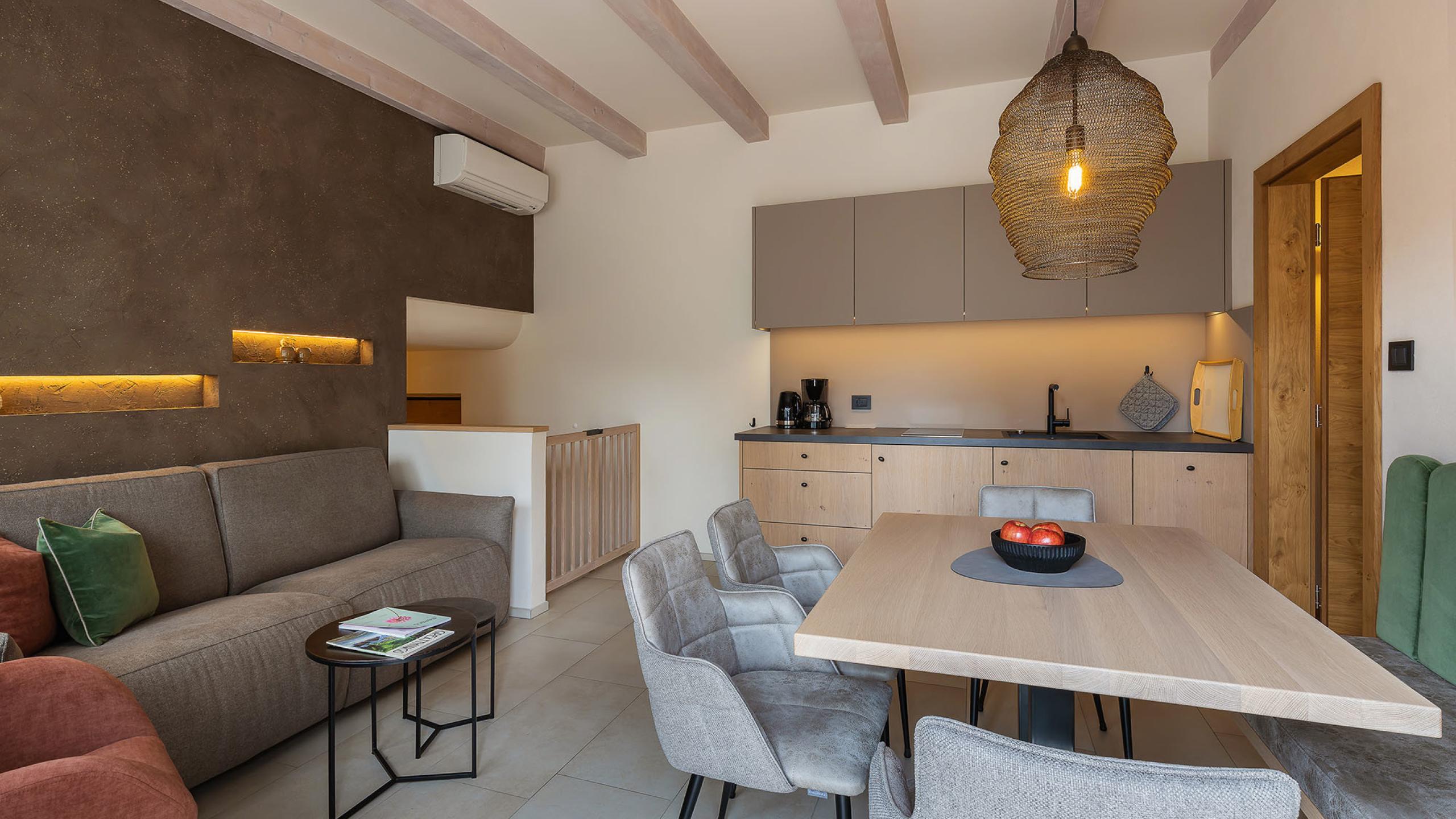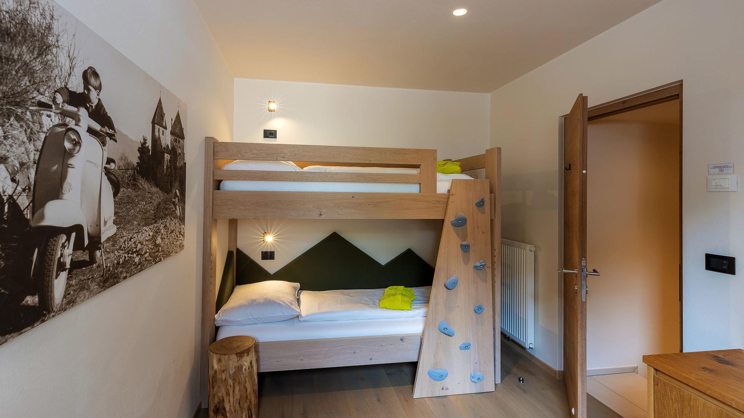 Three-room suite, north side with large panoramic terrace, apartment on two levels with master bedroom, living room with pull-out couch, kitchenette with dishwasher, children's room with bunk beds (space for extra bed), shower, separate toilet, cosy bathrobes and bath bag, hairdryer, free WiFi, satellite TV, air conditioning, approx. 65 m²