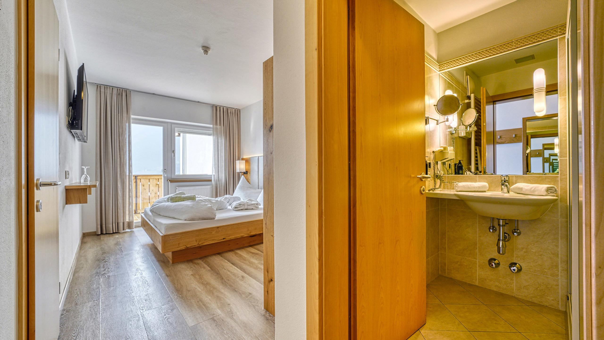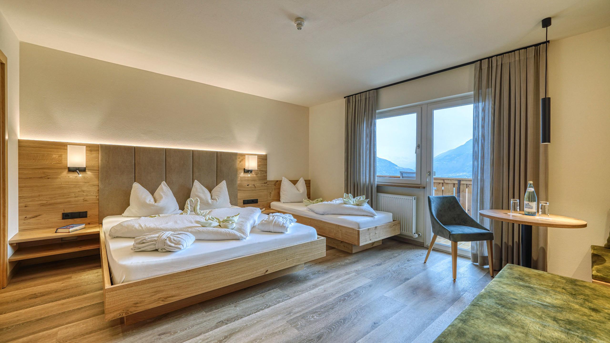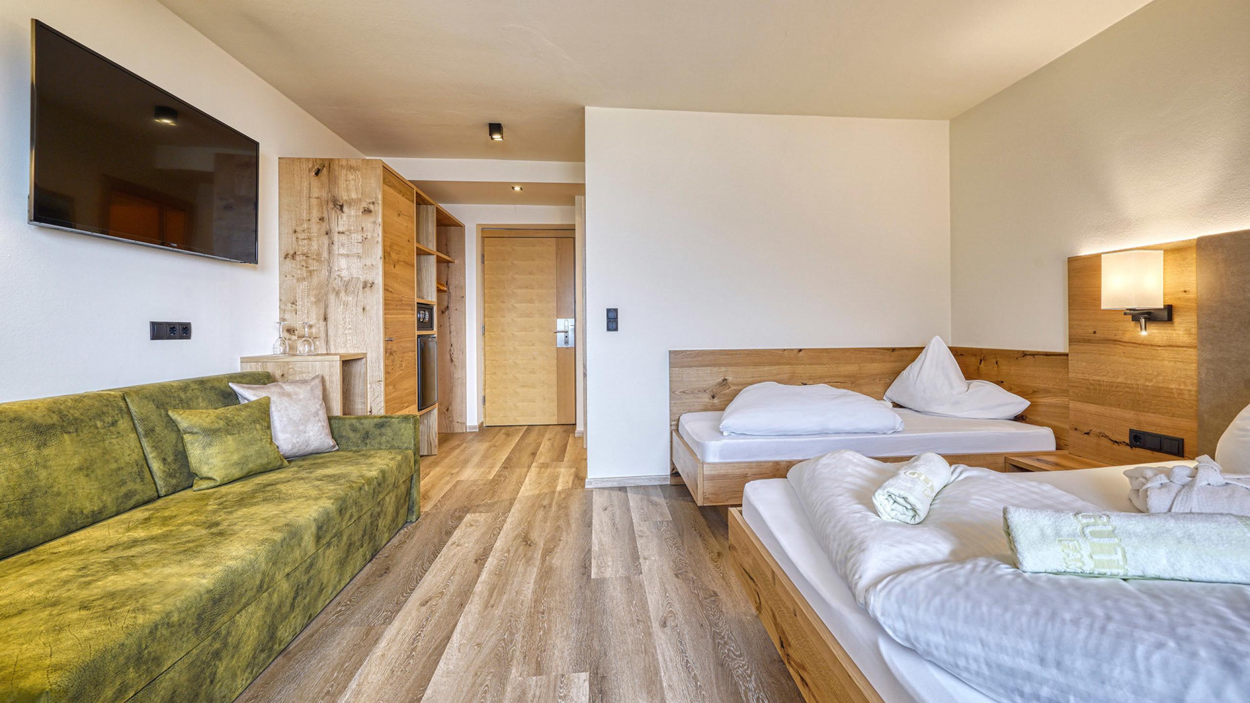 Family Suite Fox, new - approx. 44 sqm. Double bedroom couch and triple room, 2 TVs, safe, sitting area, fridge and WiFi. Bathroom with shower, hairdryer, separate WC, bidet and bathrobes. East balcony with panoramic view.
