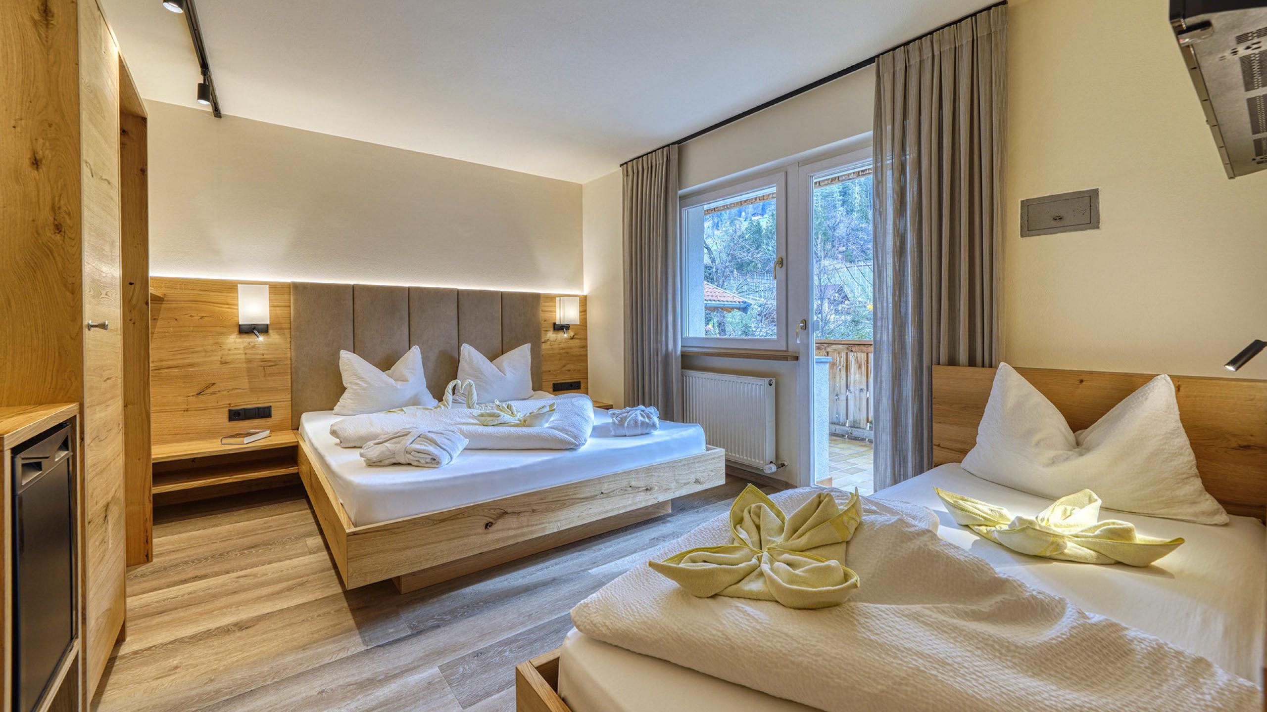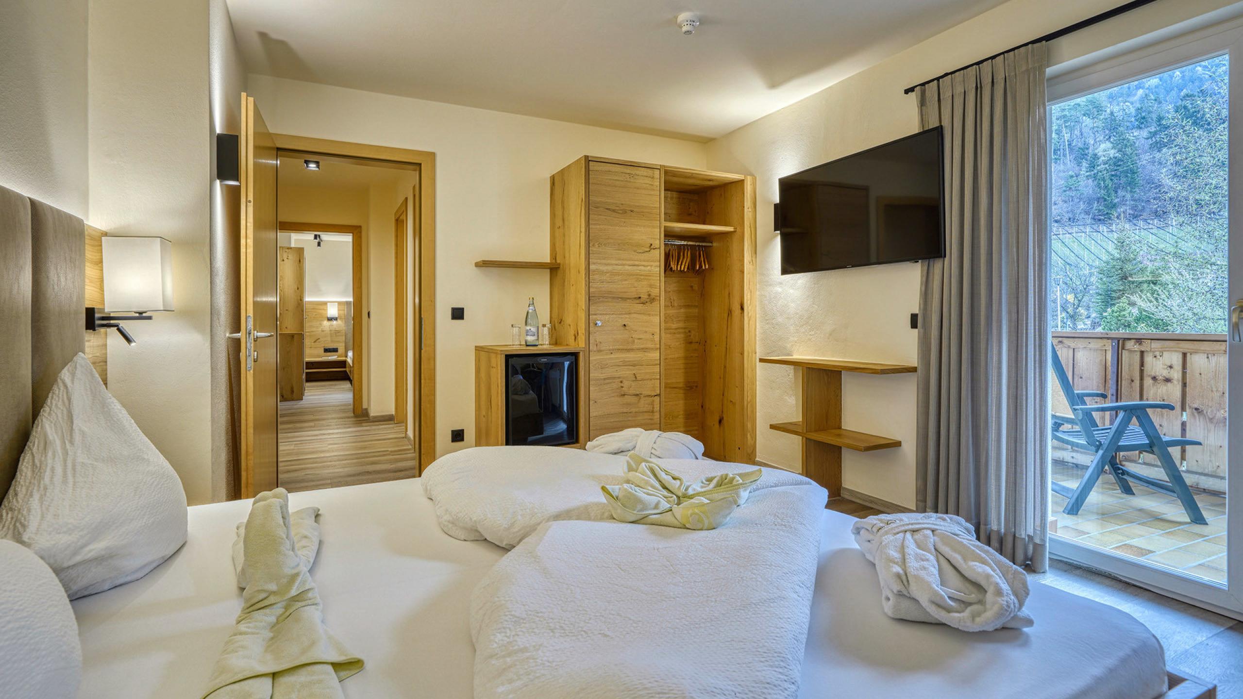 Family Suite Fox, new - approx. 44 sqm. Double bedroom couch and triple room, 2 TVs, safe, sitting area, fridge and WiFi. Bathroom with shower, hairdryer, separate WC, bidet and bathrobes. East balcony with panoramic view.