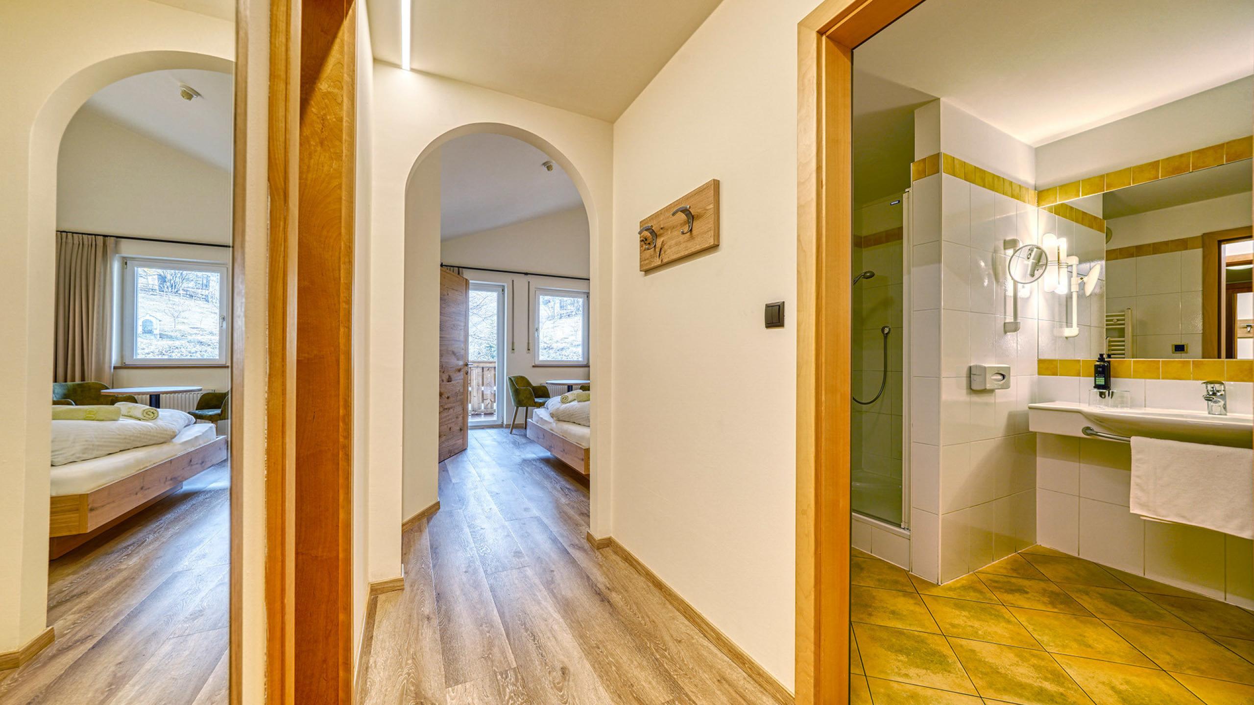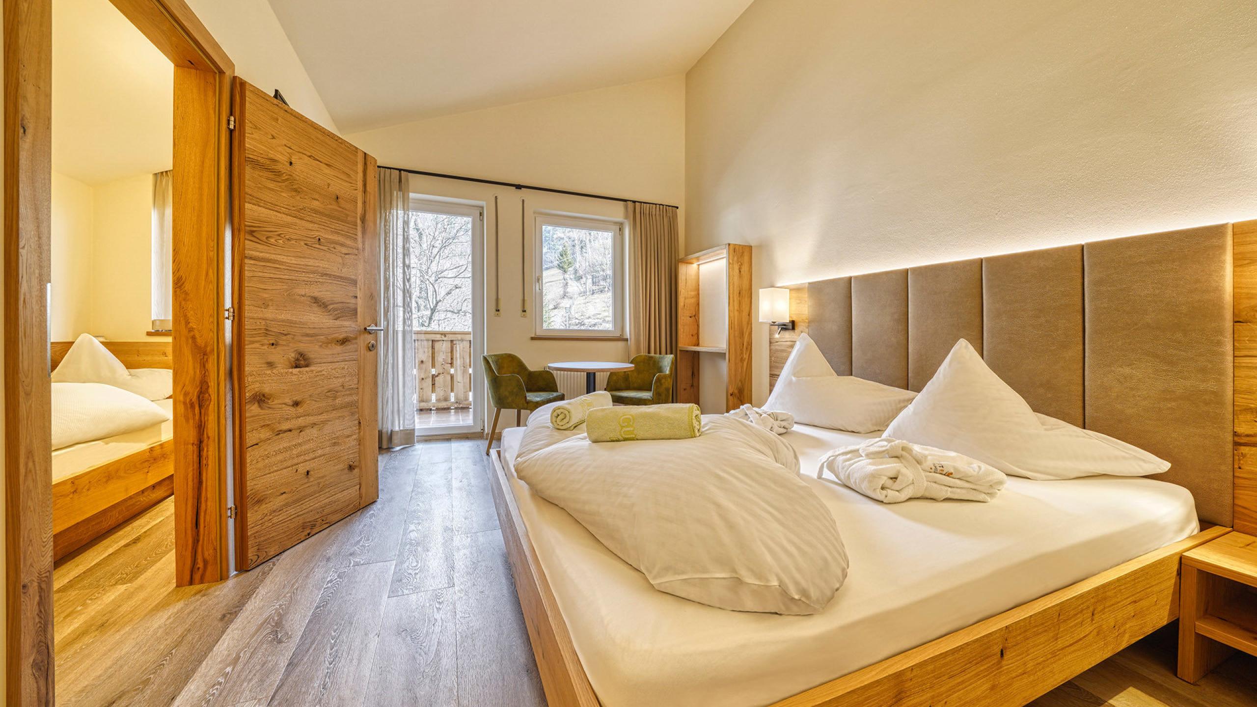 Family Suite Red Deer - approx. 40 sqm. Double room with separate children's room with 2 beds and window, sitting corner, TV, safe, fridge and WiFi. Bathroom with shower, hairdryer, WC, bidet and bathrobes. East balcony with panoramic view.