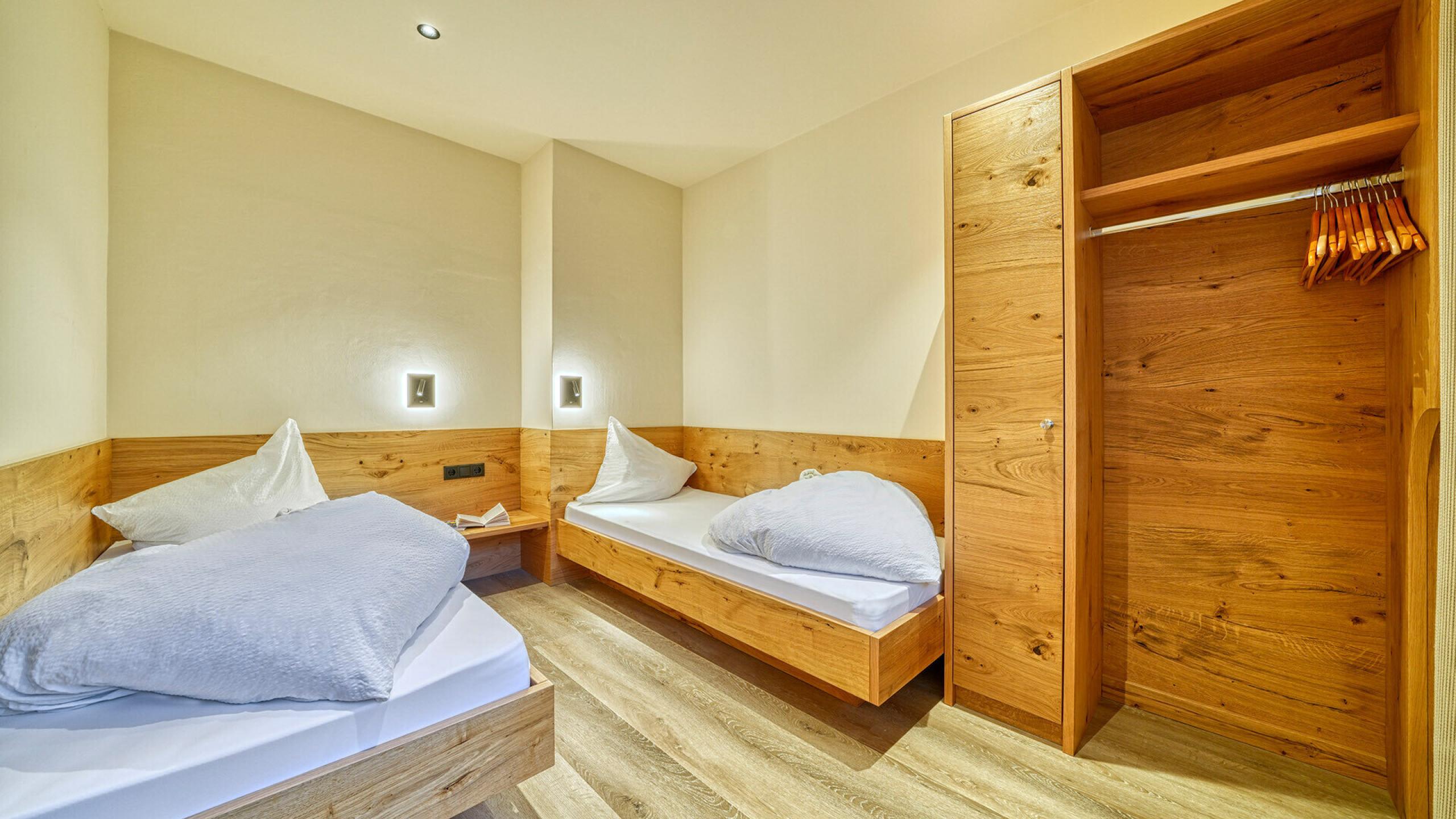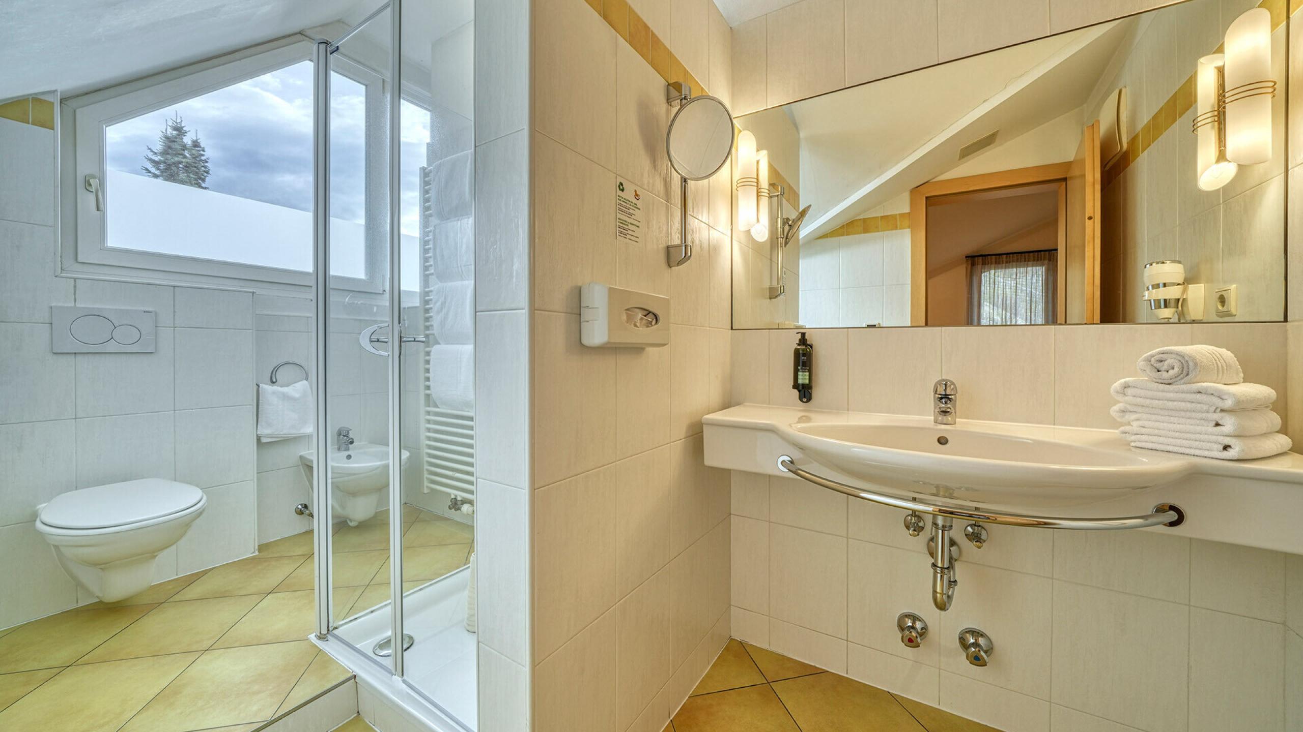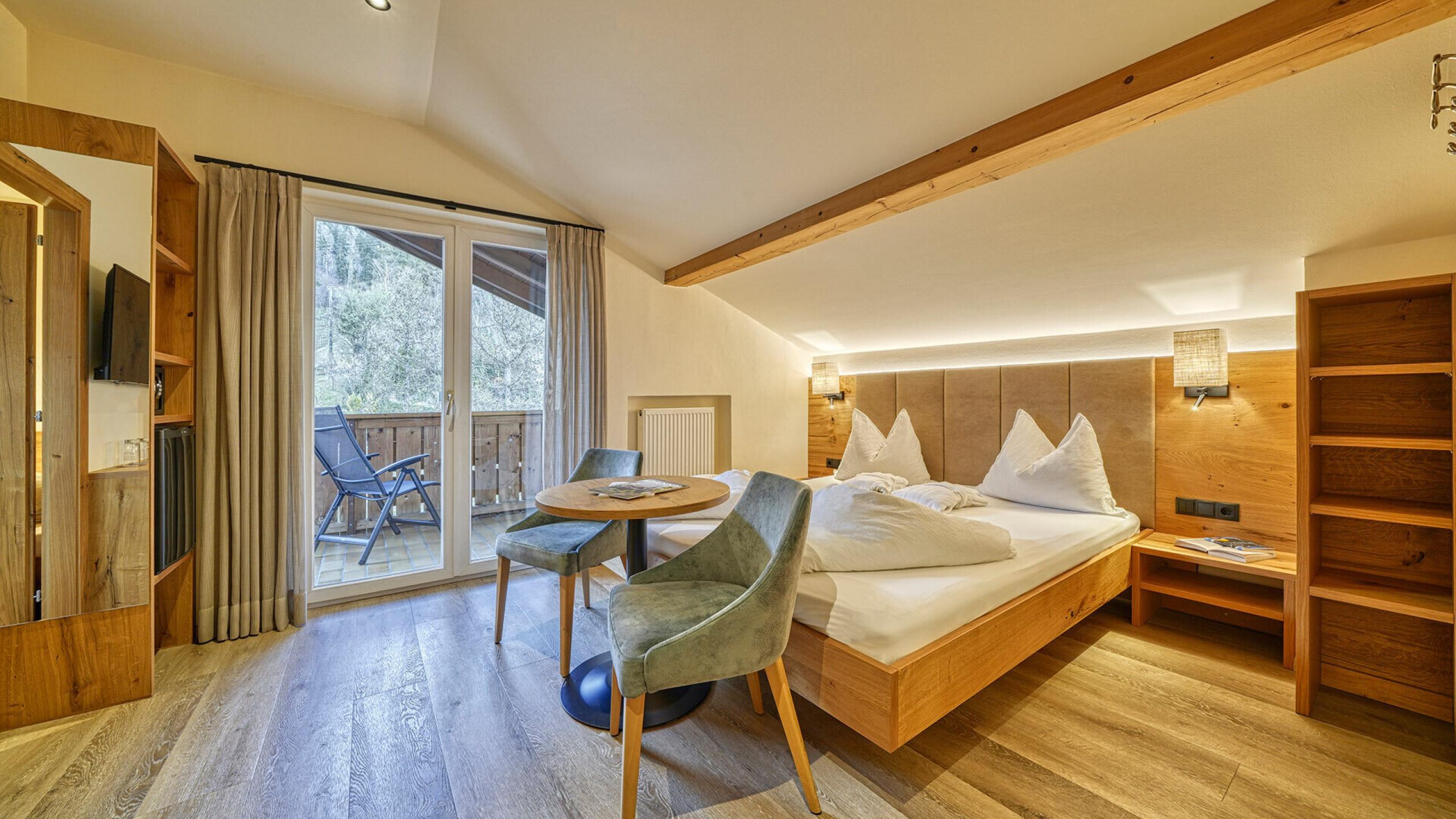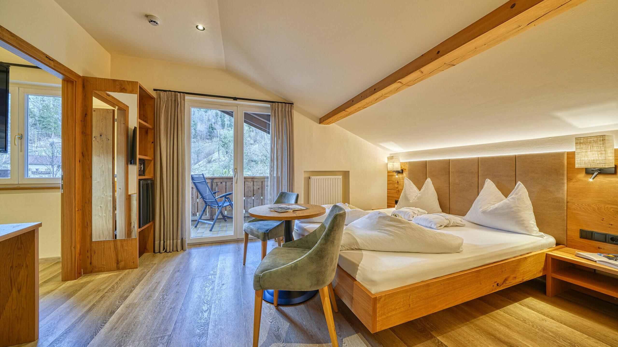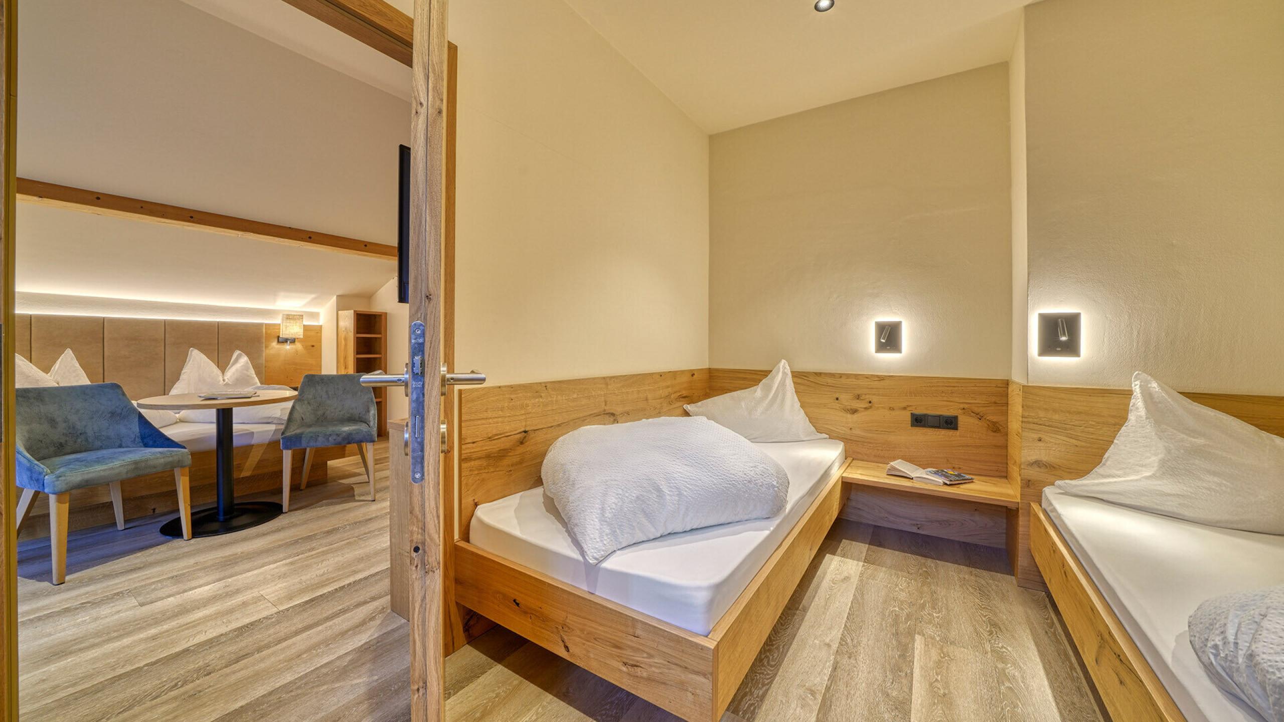 A beautyful renewedJunior Suite Badger - approx. 31 sqm. Double room with separate children`s room with 2 beds and window, sitting corner with table and 2 armchairs, TV, safe, fridge and WiFi. Bathroom with shower, hairdryer, WC, bidet and bathrobes. East balcony with panoramic view.