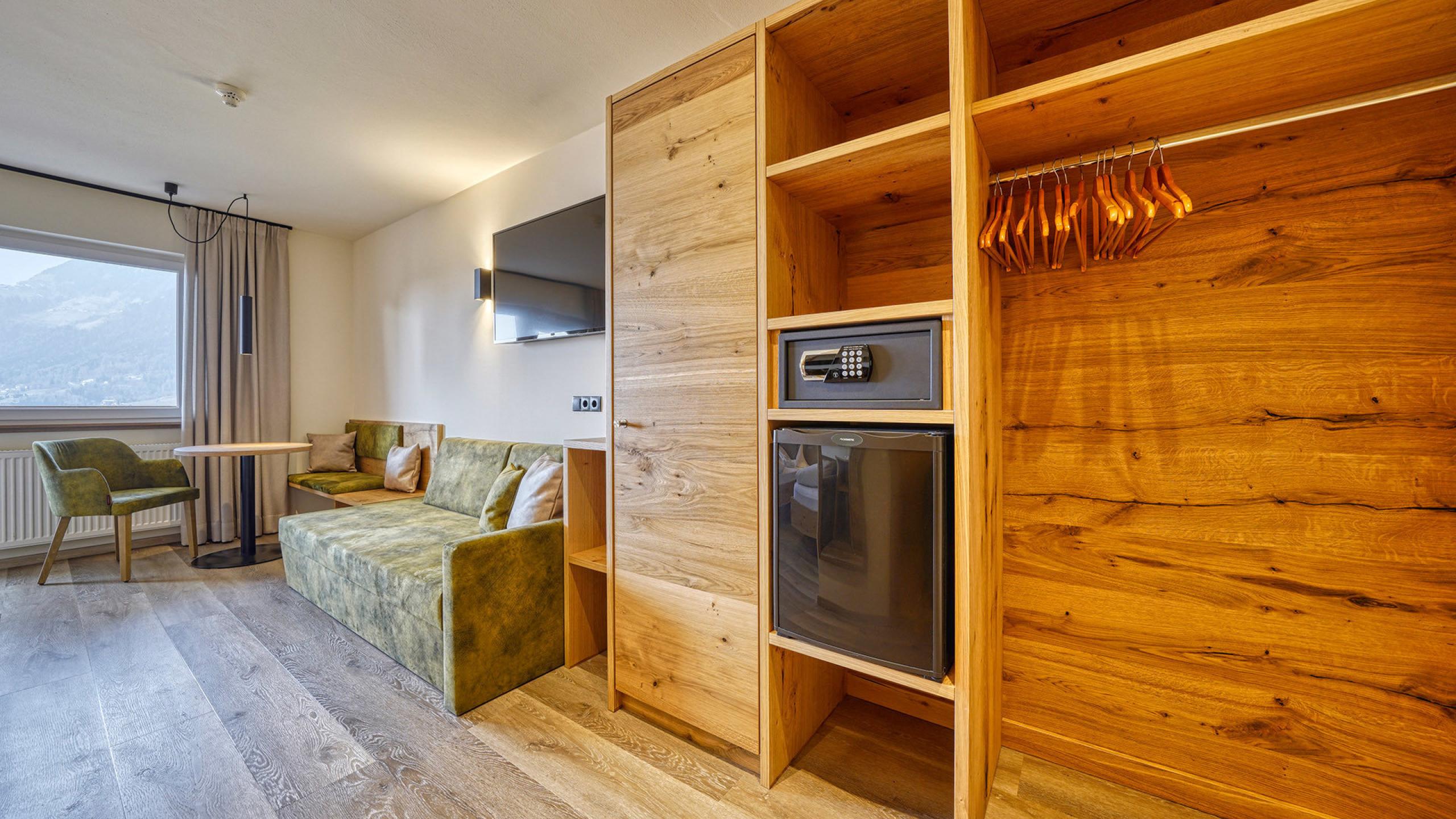 A beautiful renewed triple room "Panorama Falcon" (approx. 27 sqm) with balcony to the south-west side with a beautiful view of the Meran basin and mountains, double and single bed, sitting area, couch, refrigerator, safe, TV and Wi-Fi, bathroom with shower, toilet, bidet, hairdryer, and bathrobe.