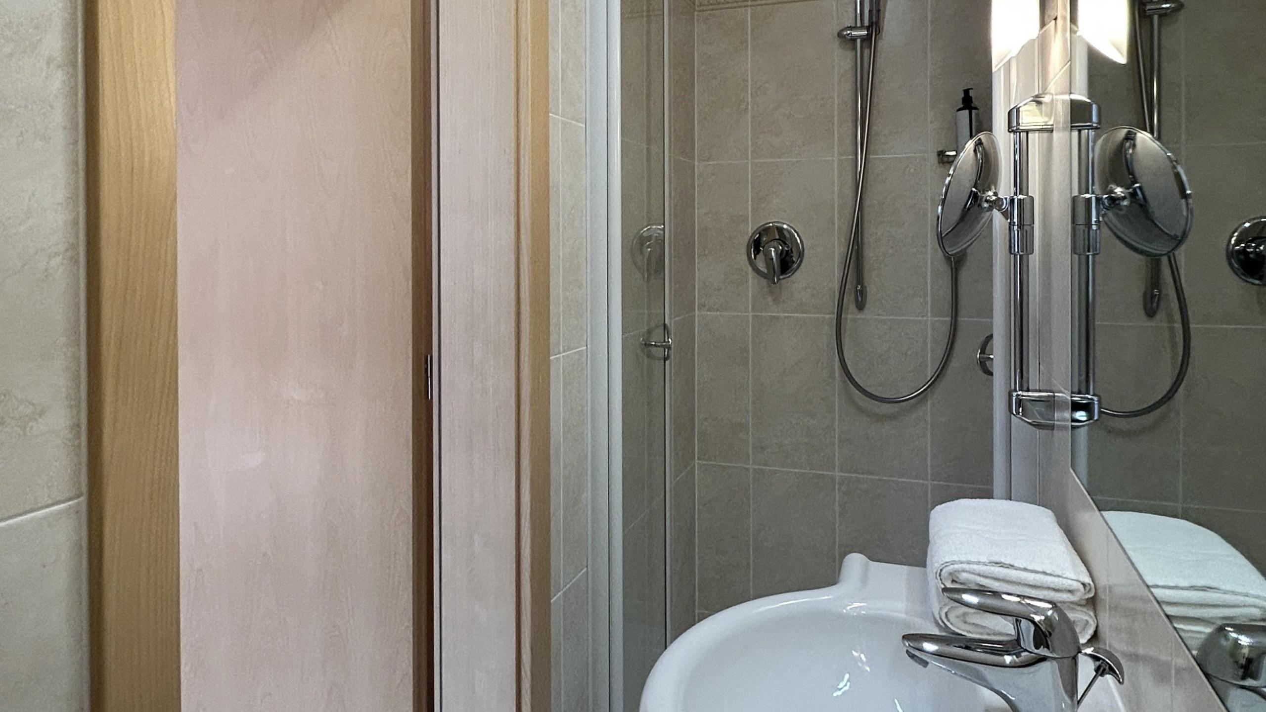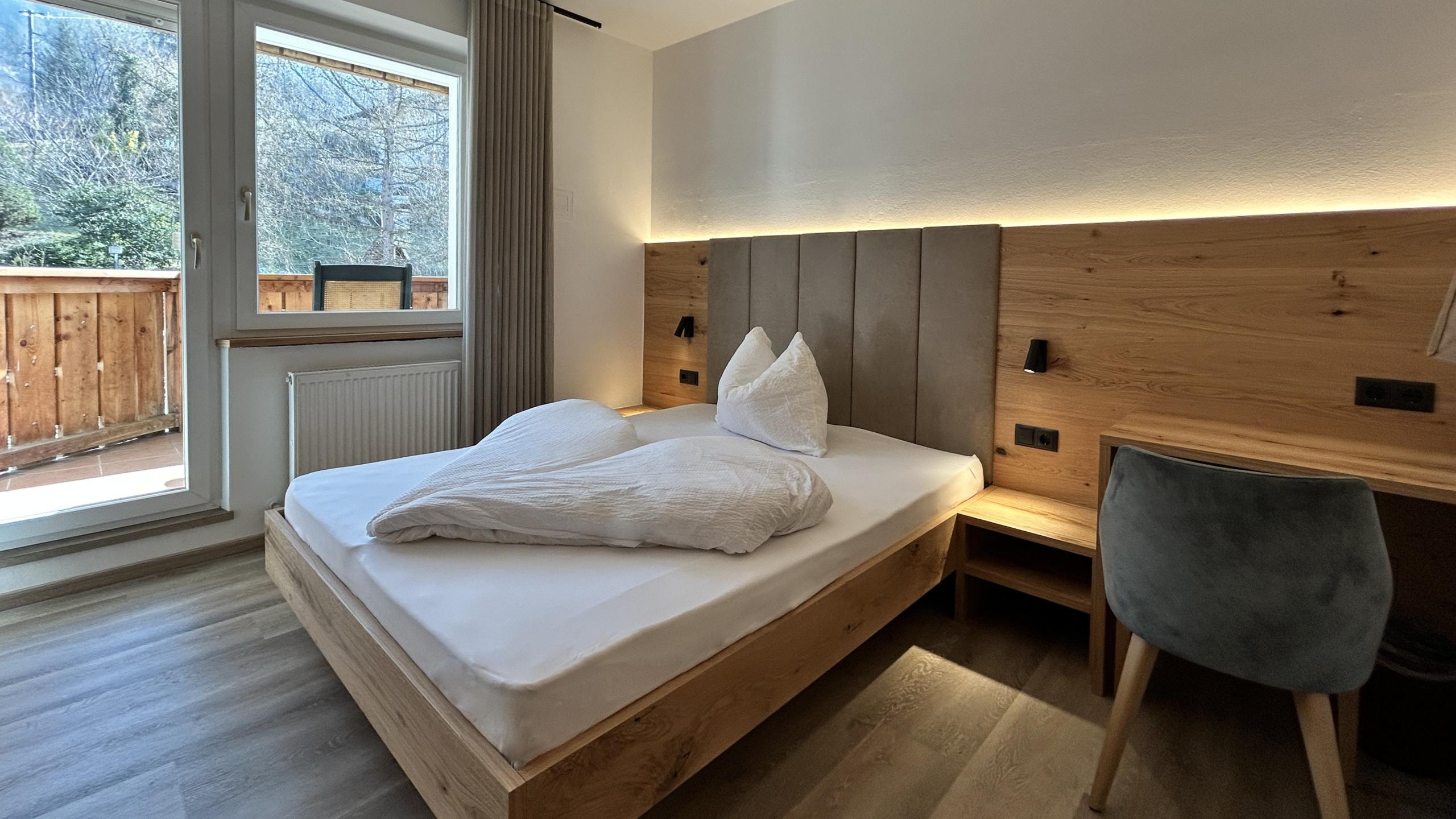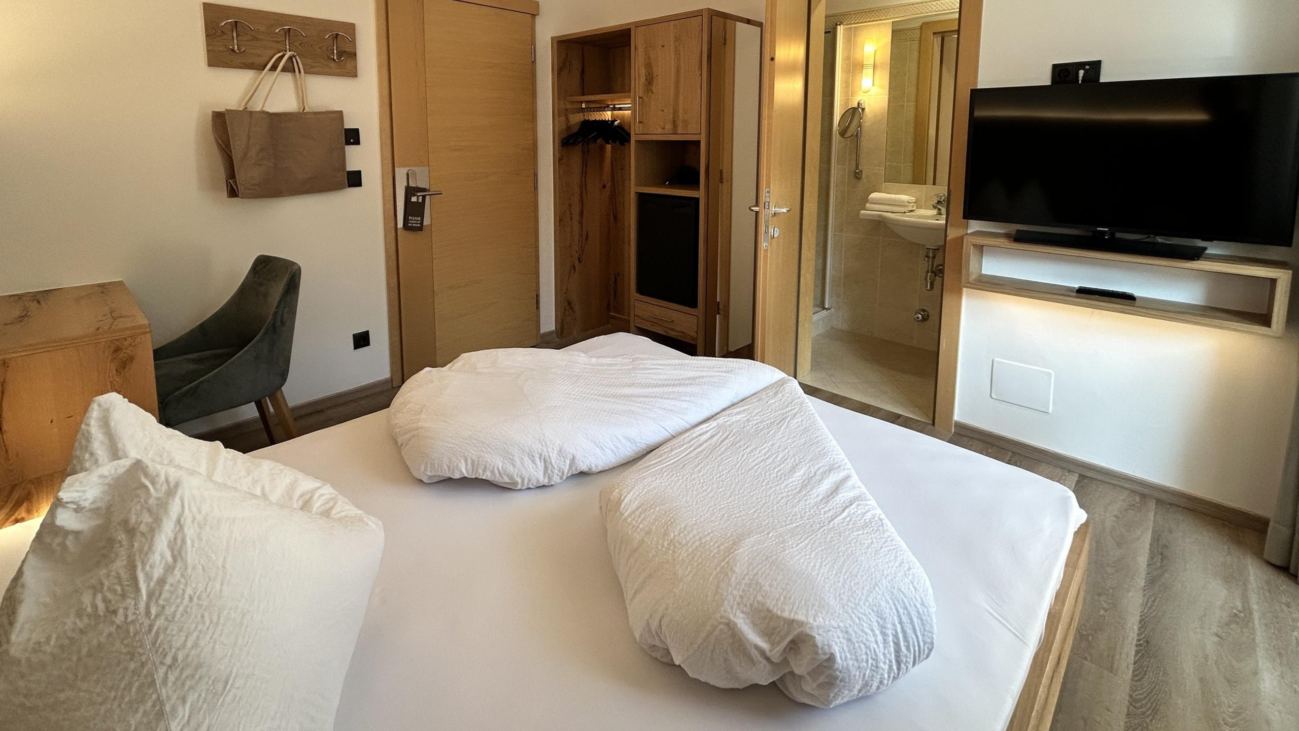 Single room - approx. 15 sqm. Single room new furnished with double bed, TV, safe, fridge and WiFi. Bathroom with shower, hairdryer, WC and bathrobes. East balcony