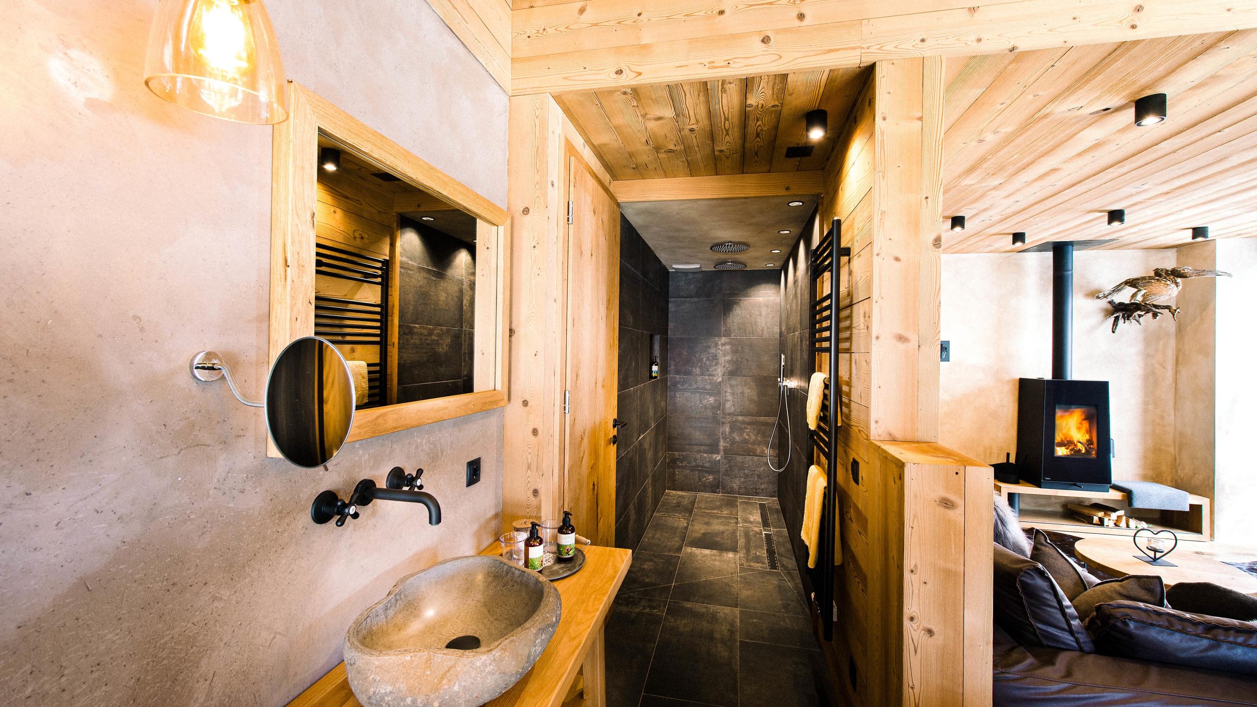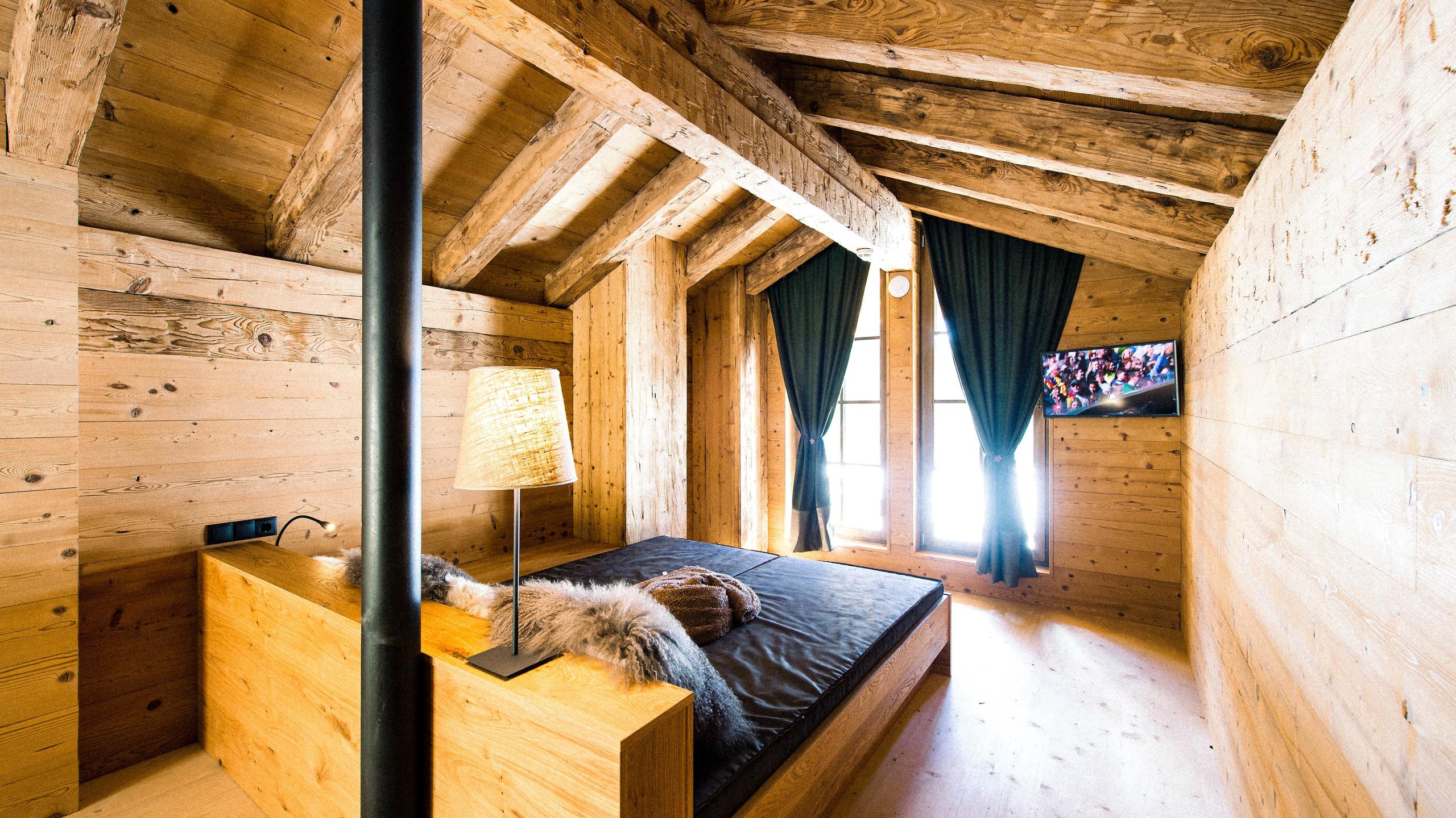 Cosy living and sleeping area with wooden floor, open wood fireplace, high-class health beds, walk in closet, open bathroom area, freestanding bathtub and separate toilet and shower area.