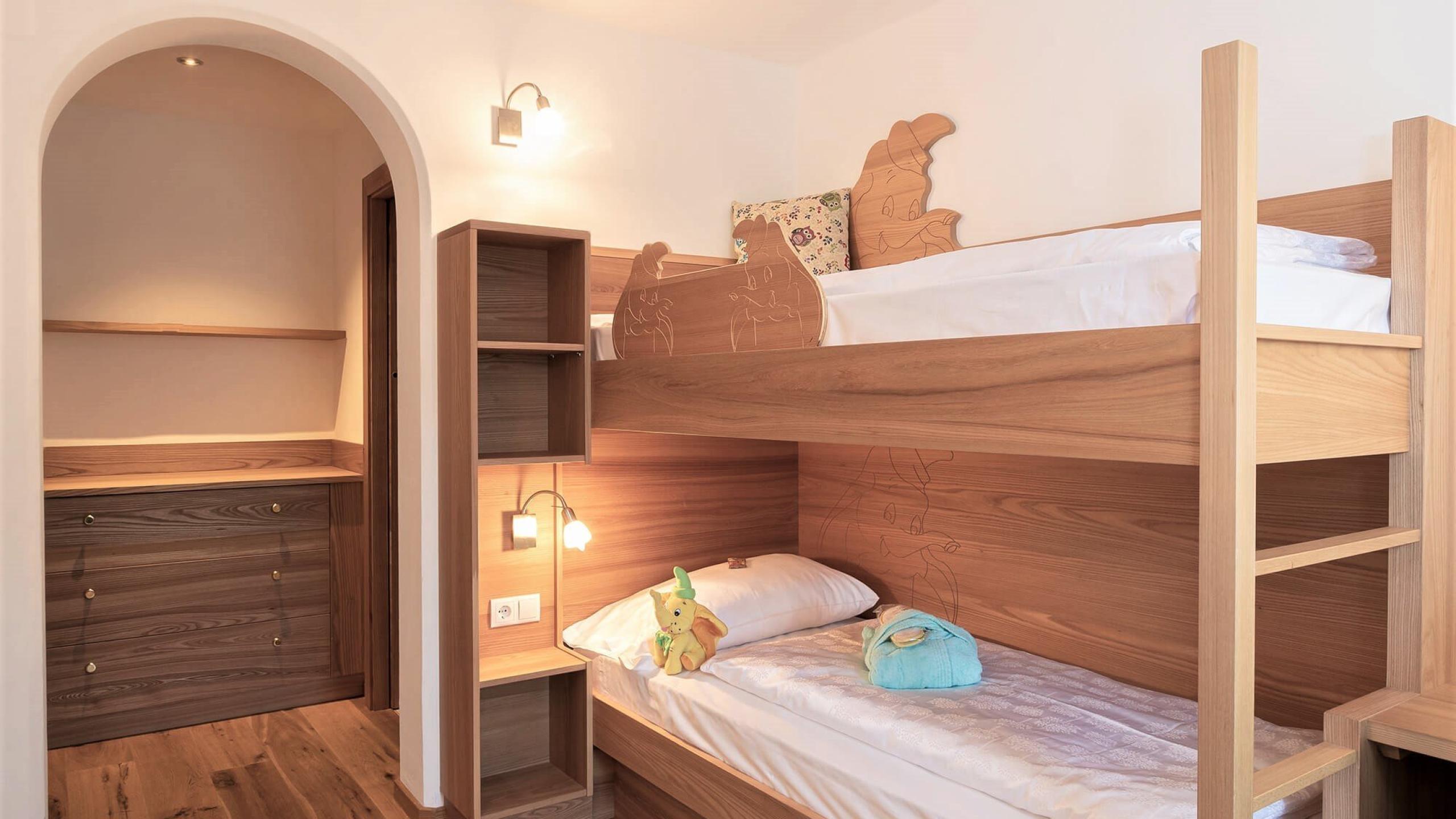 The room communicates with a second double room featuring either bunk beds or two twin beds and a bathroom with shower.