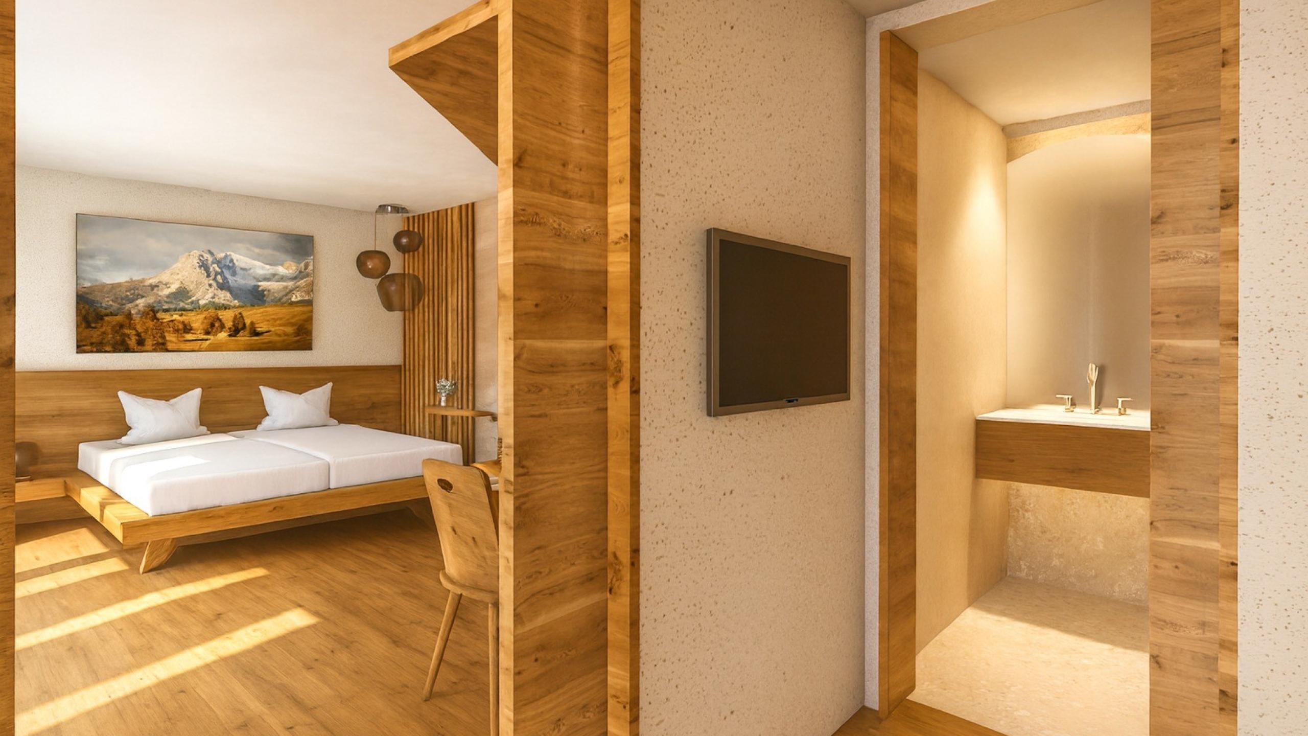The open living-sleeping area for the parents combines the traditional Stube sitting room and bedroom to a warm place for shared moments. The children enjoy their own space: a bedroom with a bunk bed and a single bed as well as a small private toilet with washbasin offer them their own privacy. There is also a large family bathroom with shower and separate toilet - perfect for the whole family.