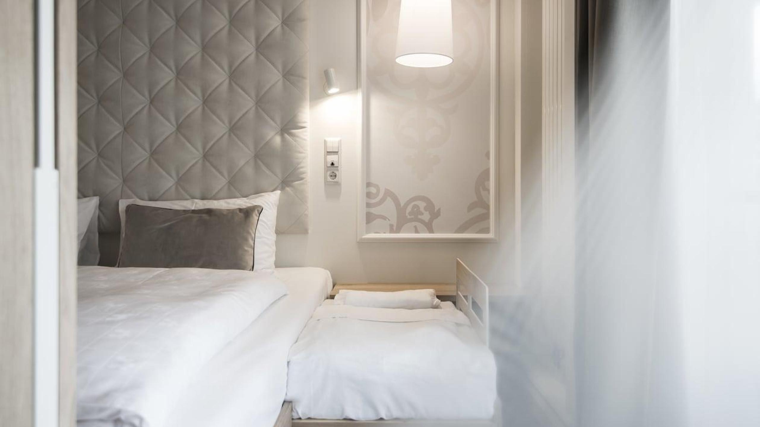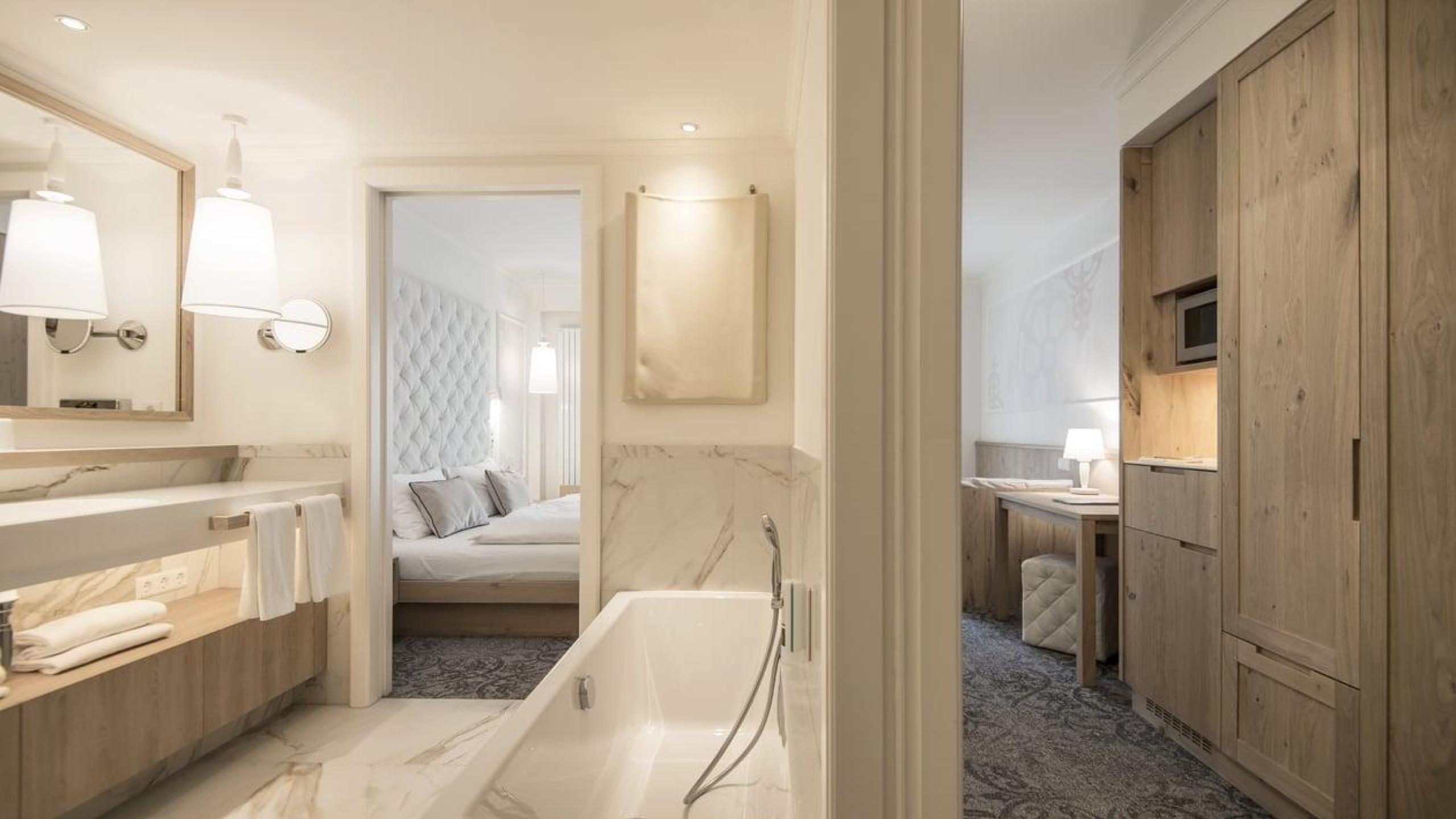 Vary spacious suite with separable sleeping area with double bed; single bed or cot, some with sofa-bunkbed and writing desk or truckle cot. Bathroom with double access, shower or bathtub, baby bath with changing mat, child’s washbasin, WC, and bidet. Wi-Fi, 2 TVs, safe, pantry with kettle, microwave, fridge, cutlery, and crockery. Individually adjustable air-conditioning and humidifier system.