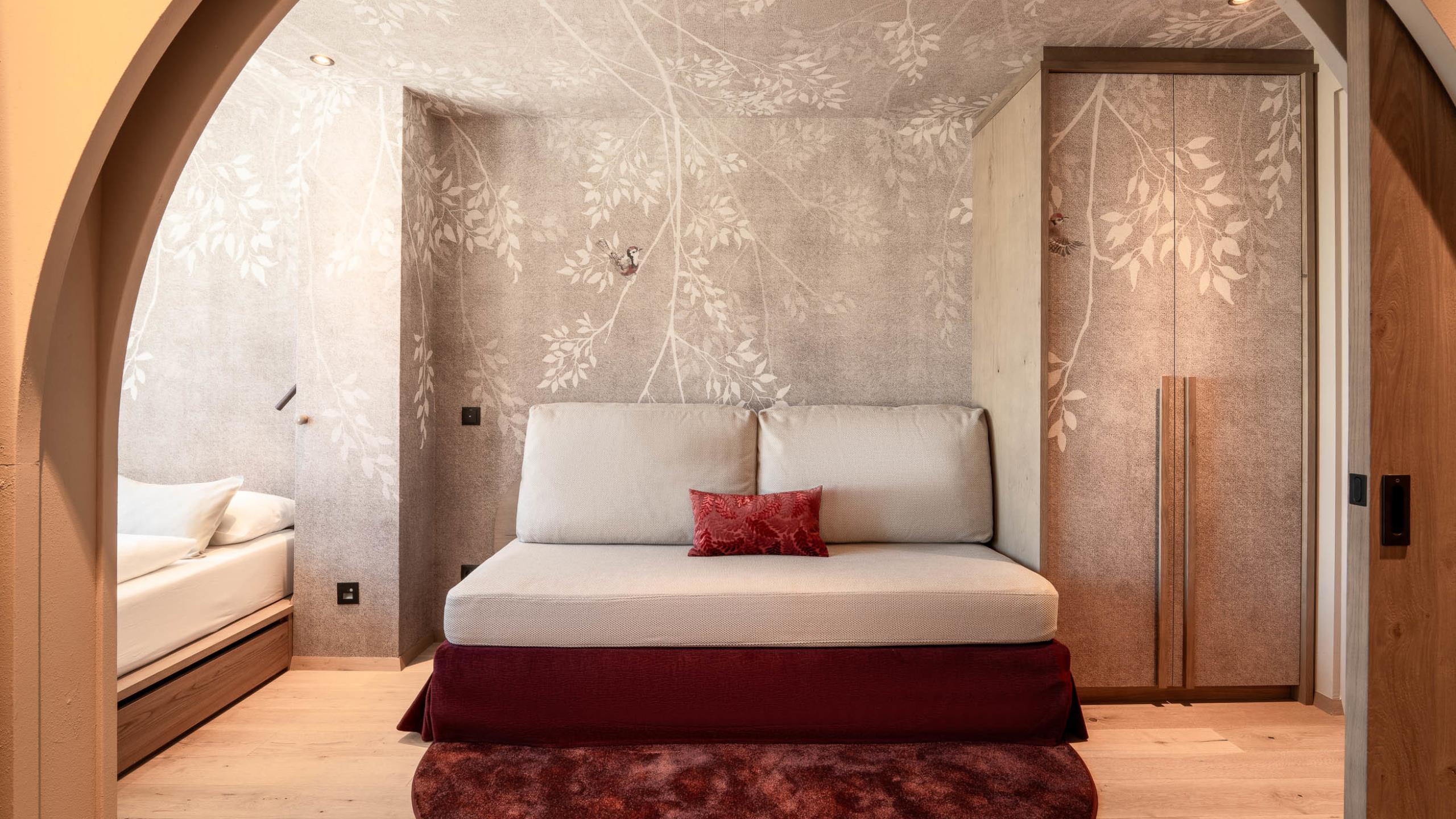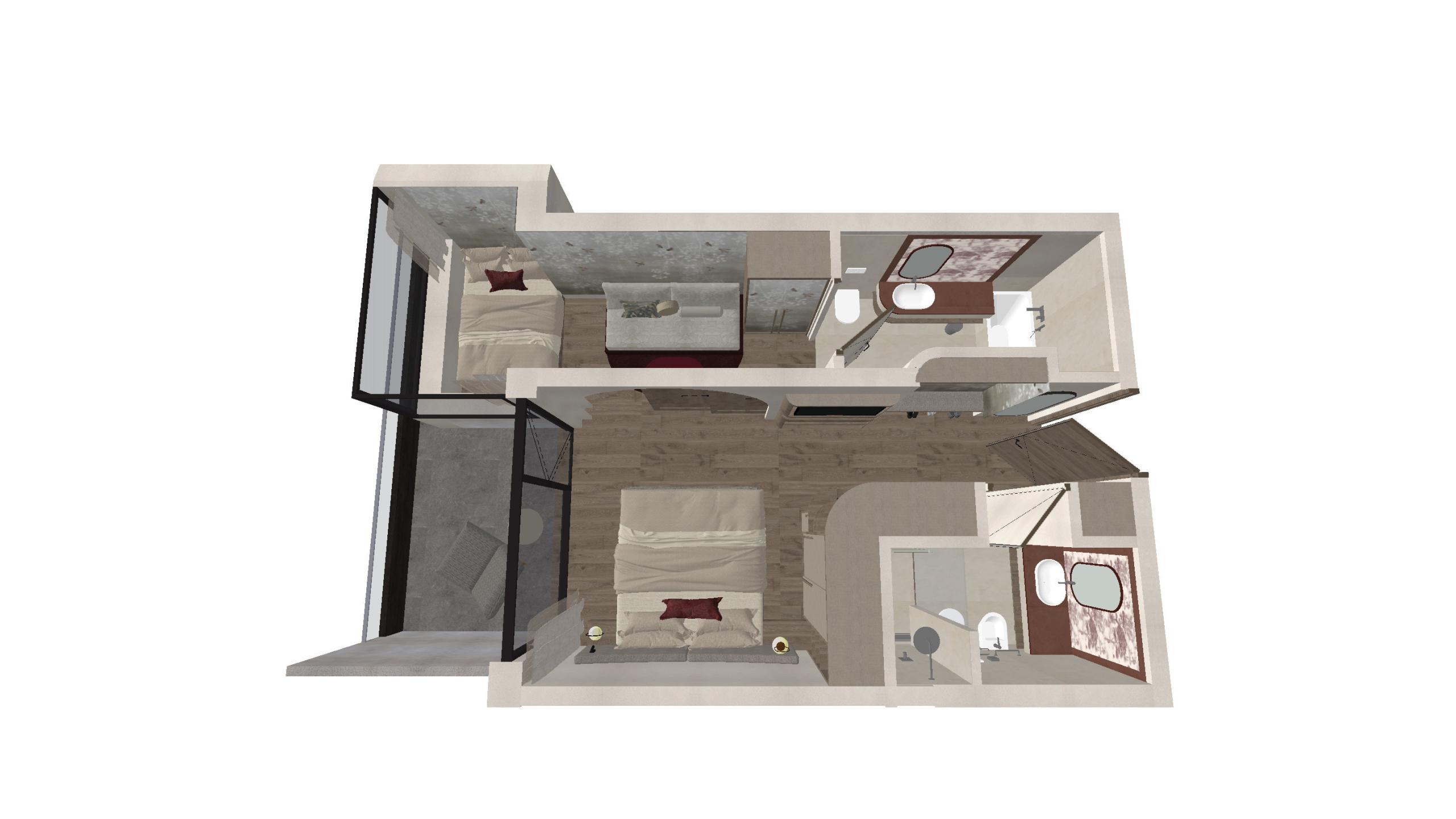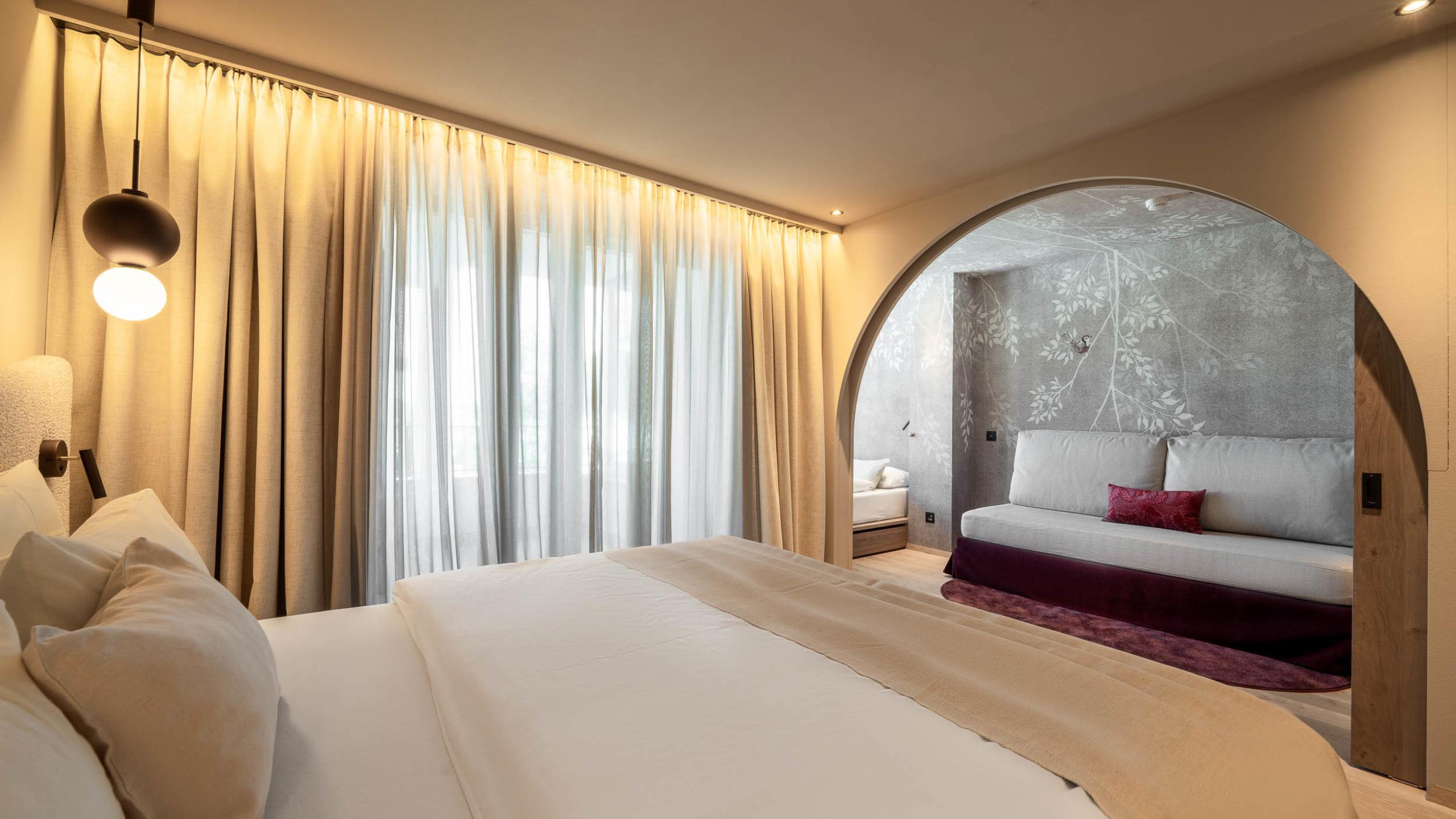 42 m² suite with panoramic view and balcony. Includes a double bedroom, separated by a sliding door from a space with a single bed and a cozy panoramic nook with a French bed, plus satellite TV. The suite has two bathrooms, both equipped with WC, washbasin, cosmetic mirror, hairdryer, and courtesy toiletries. One bathroom has a bathtub, the other a shower and bidet.