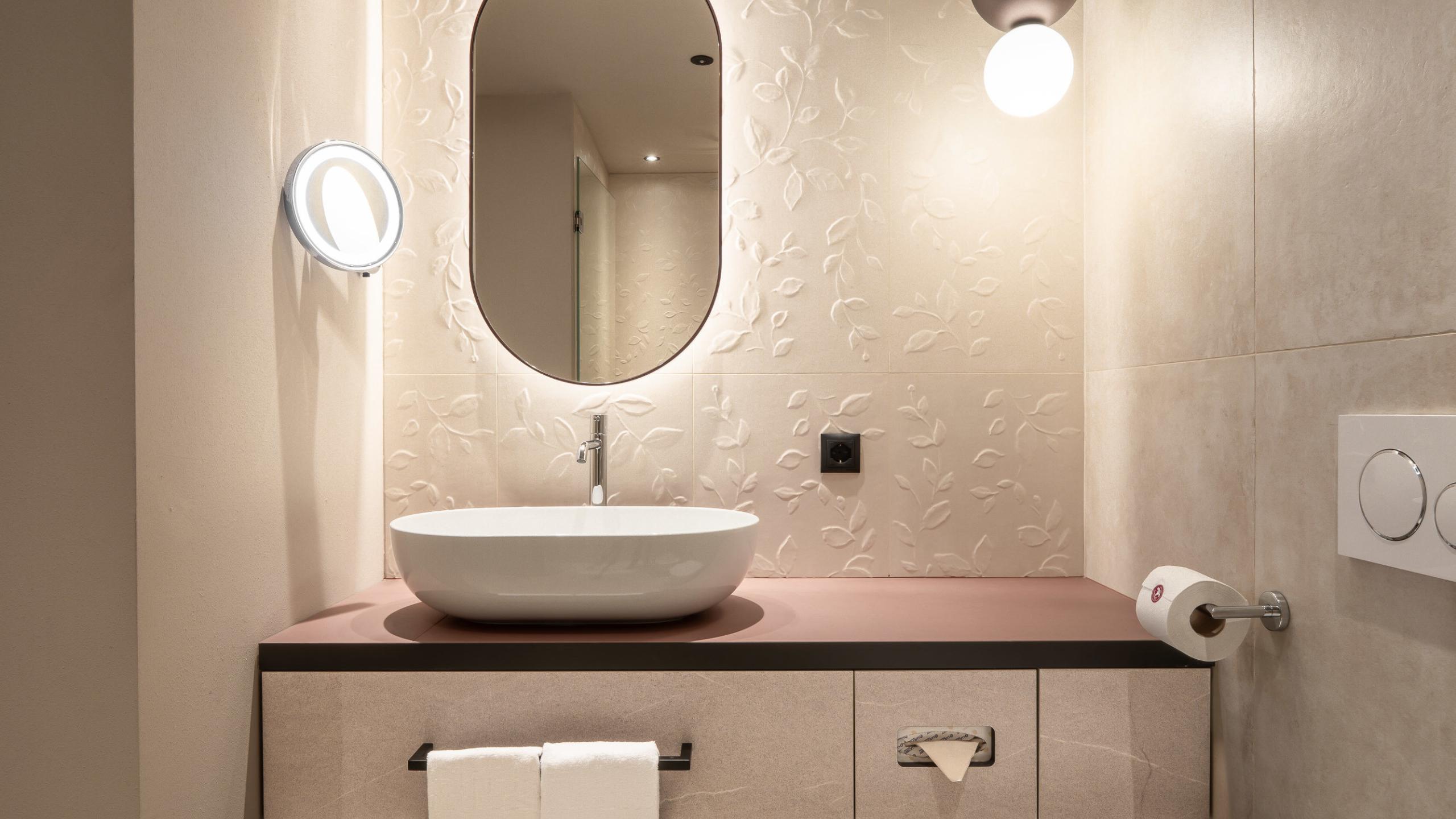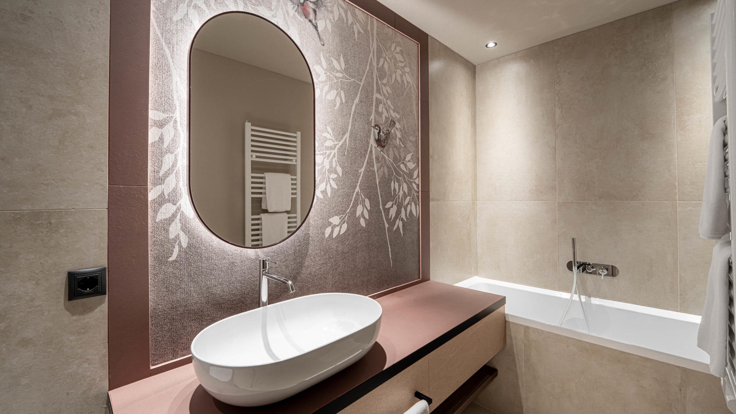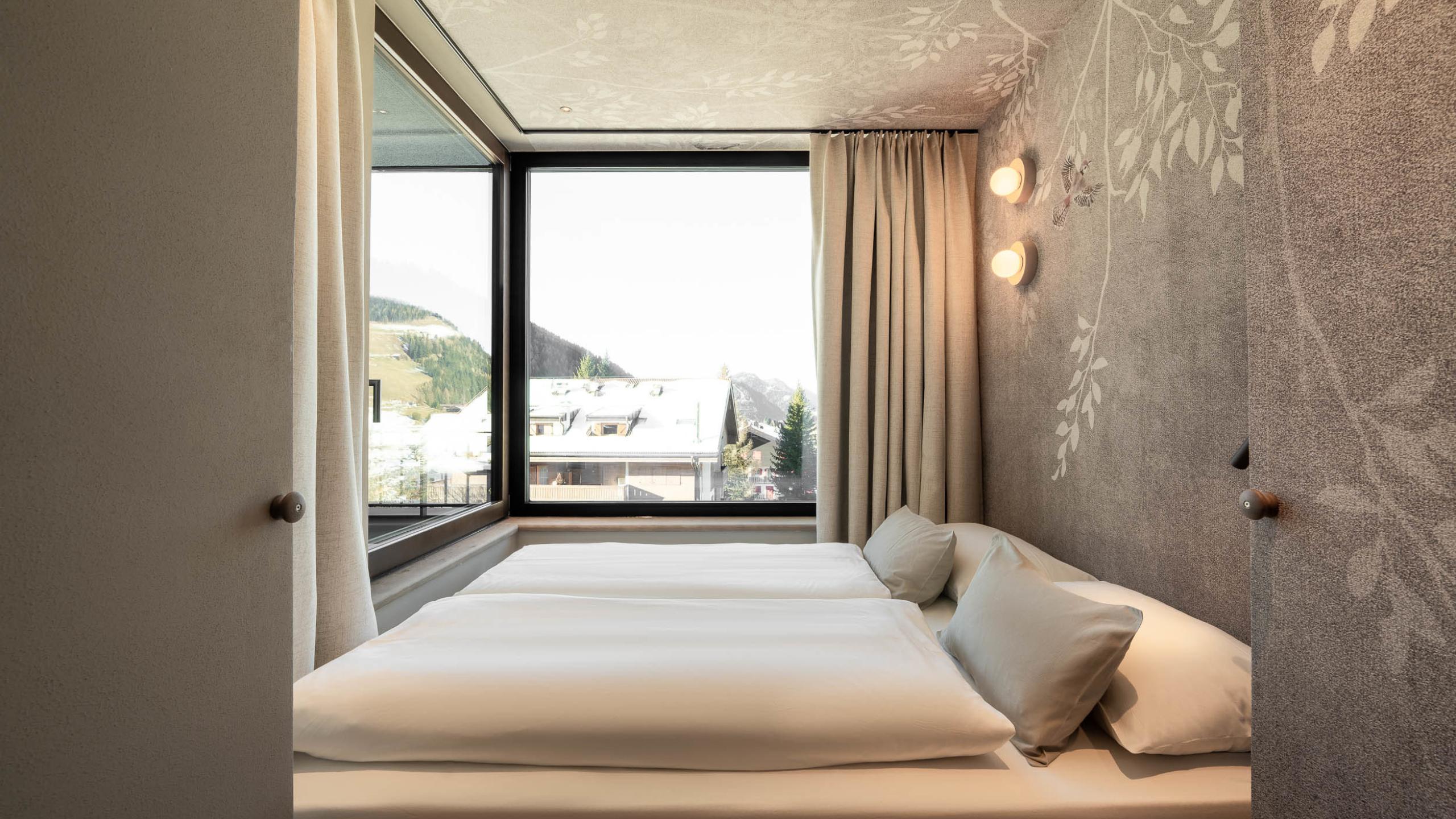 42 m² suite with panoramic view and balcony. Includes a double bedroom, separated by a sliding door from a space with a single bed and a cozy panoramic nook with a French bed, plus satellite TV. The suite has two bathrooms, both equipped with WC, washbasin, cosmetic mirror, hairdryer, and courtesy toiletries. One bathroom has a bathtub, the other a shower and bidet.