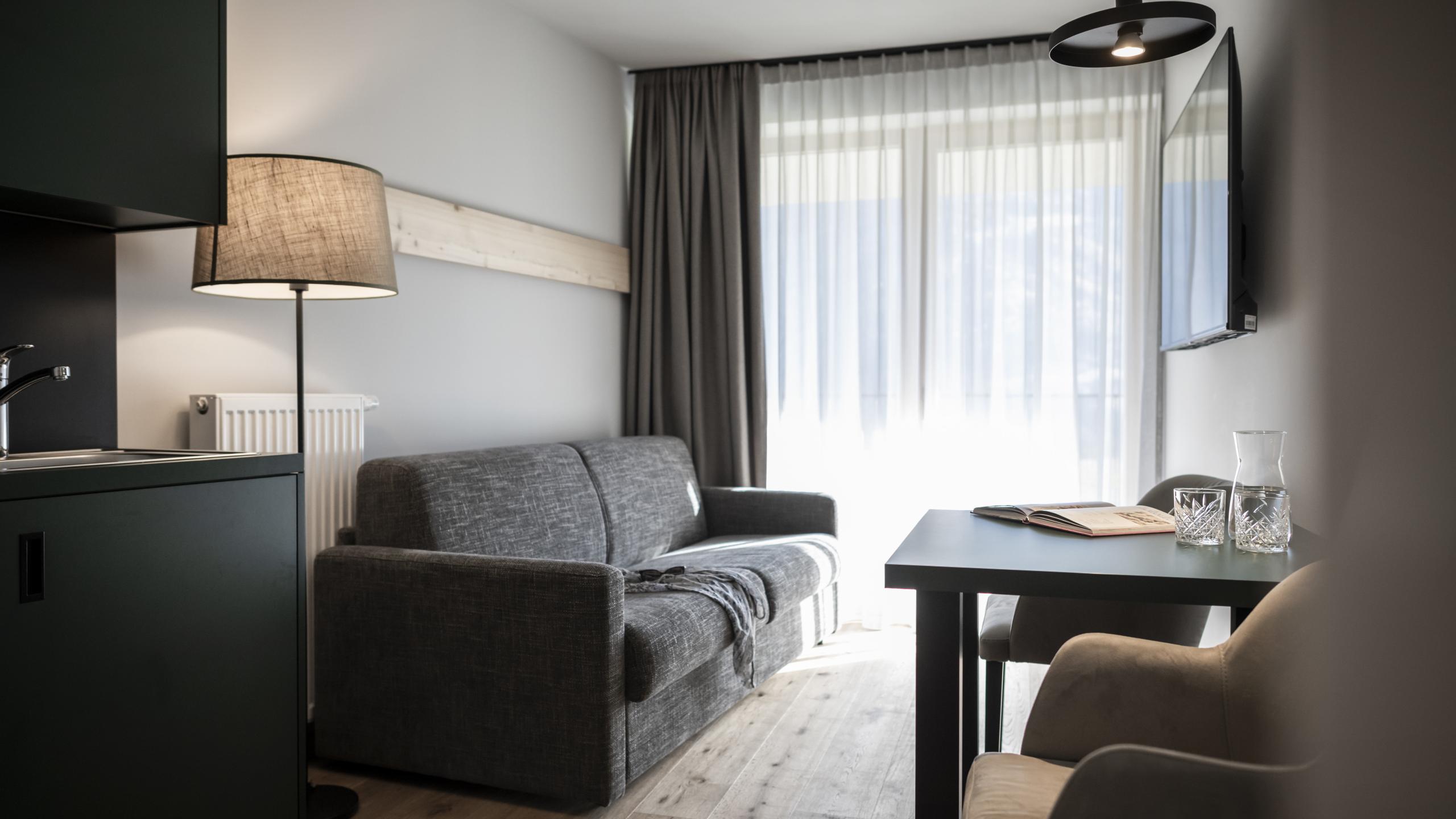 This lovely flat with natural oak wood floor, separate bathroom with only toilet and bidet, kitchenette, fridge, table with chairs, sofa bed with mattress, and terrace is ideal for those who like to be independent but still in the middle of it all.