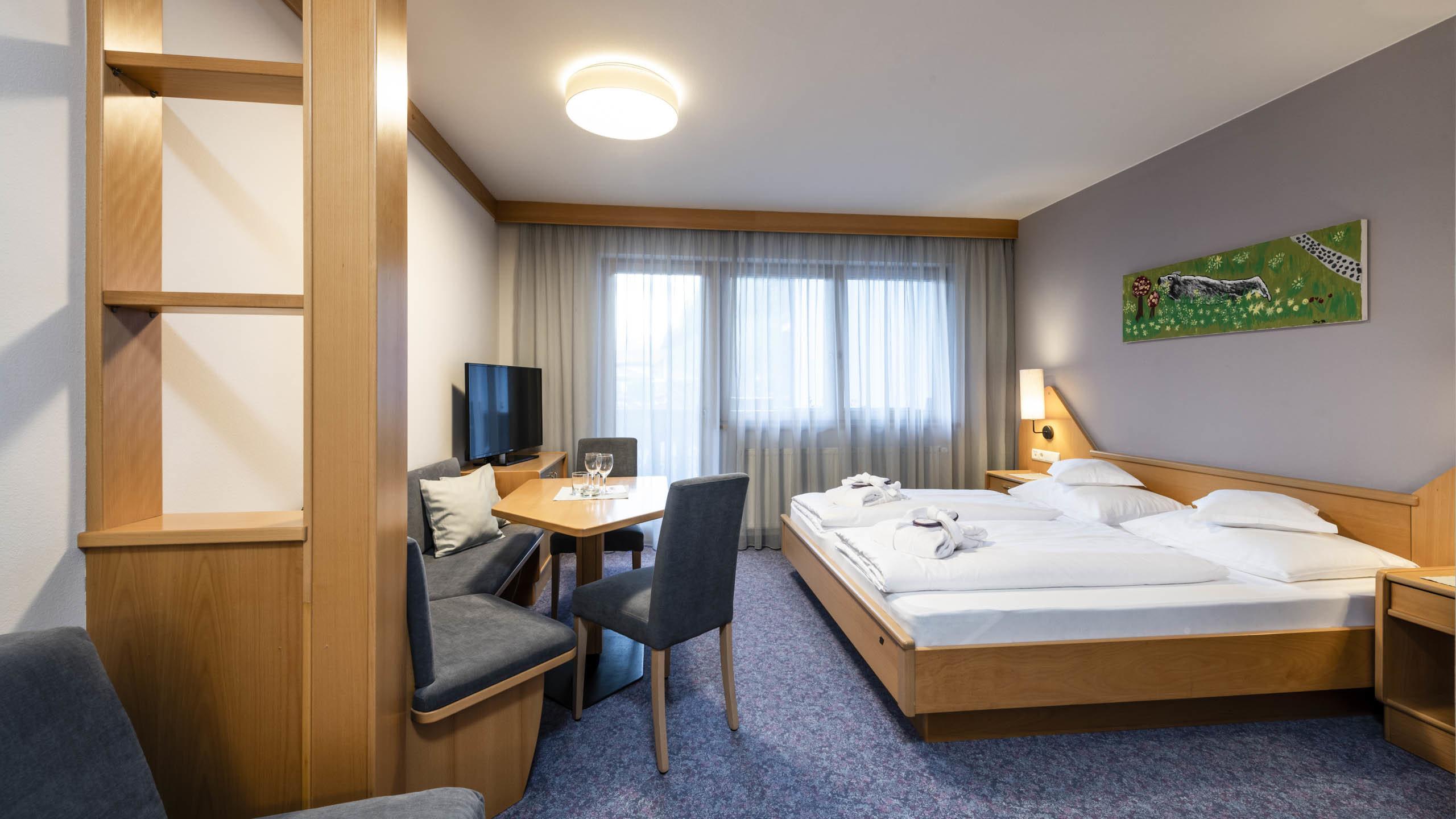 Room, 38 m², with double bed and with pull-out sofa bed, a comfortable sitting area (corner bench and table) bathtub/shower, WC, safe, SAT-TV, minibar, hairdryer.