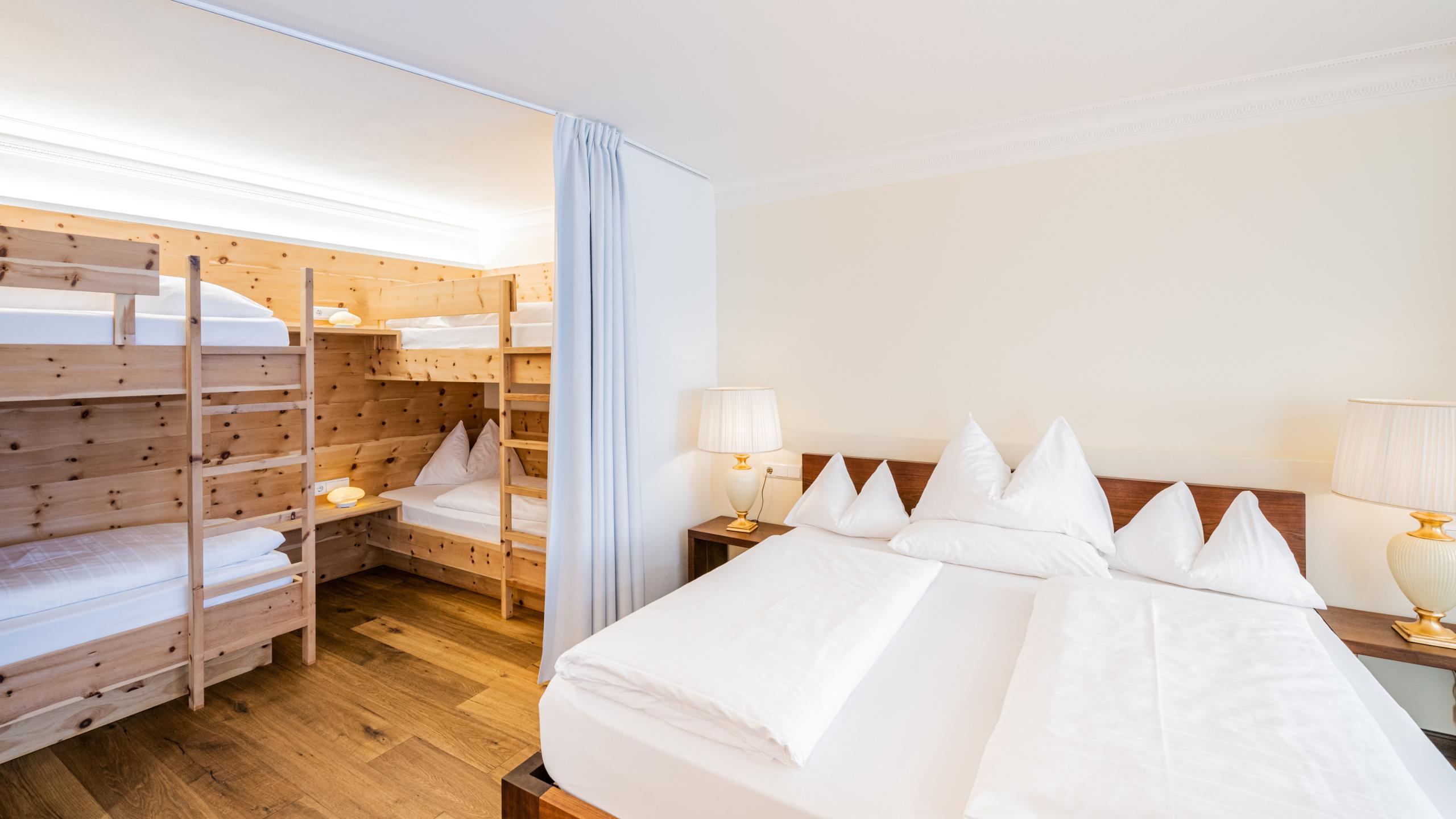 • Double bed and curtain-separated kid’s room with two bunk beds
