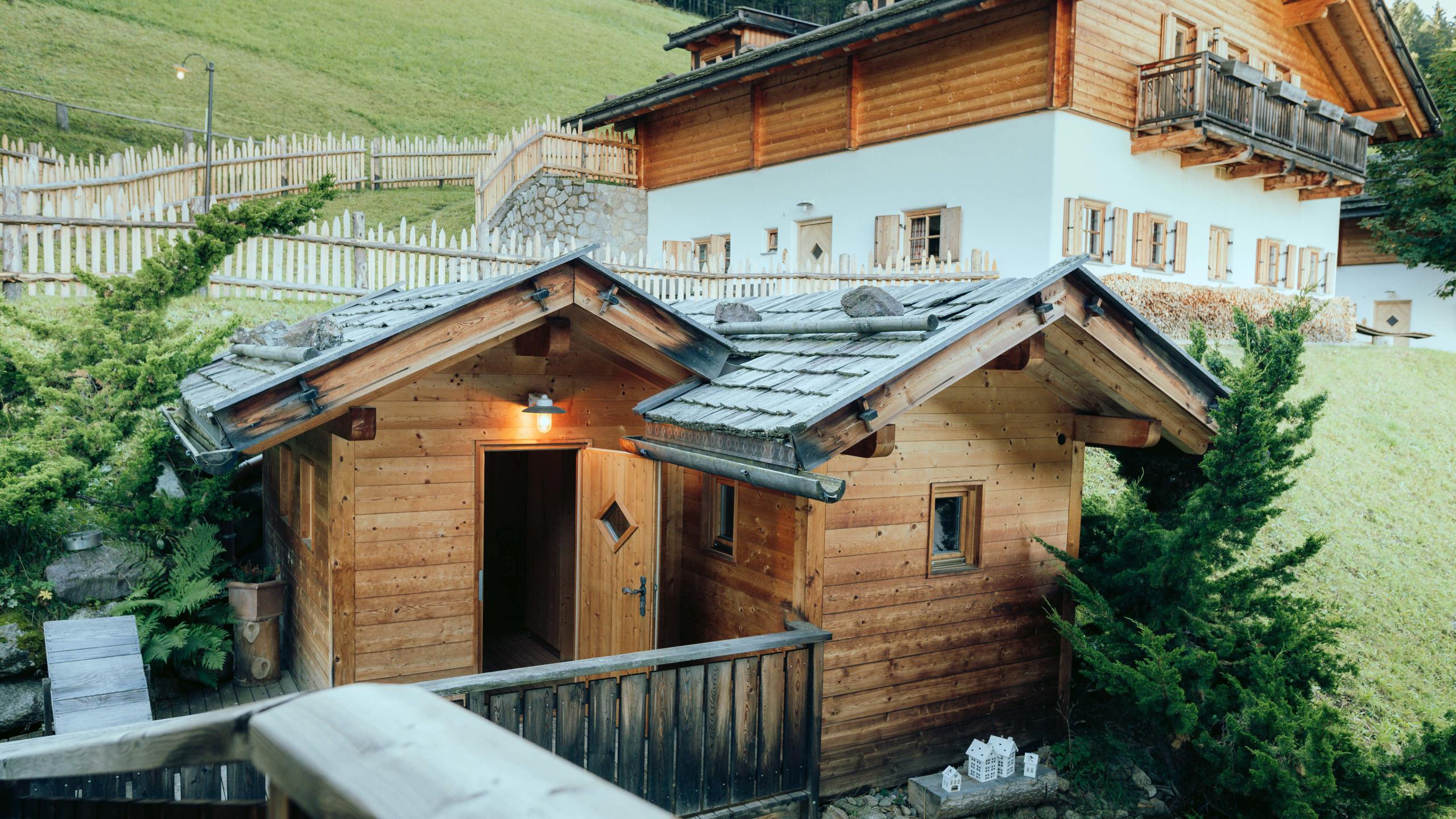 Almblocksauna im Freien mit Ruheräumen