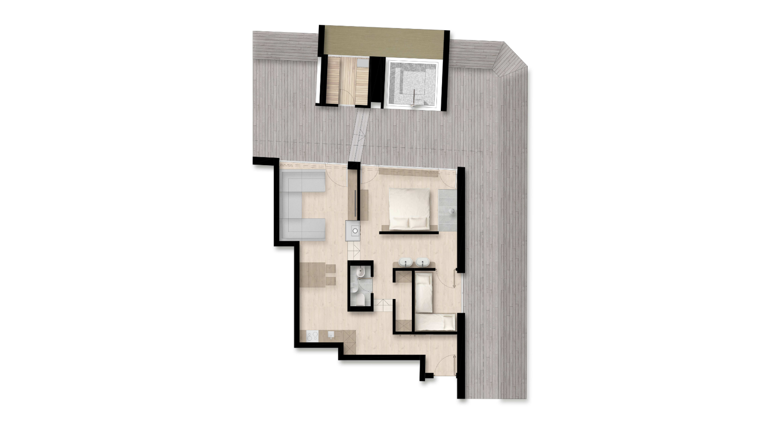 Luxuriöse, sehr offen gestaltete 2-Raum Penthouse Suite mit 70 m² Wohnfläche auf zwei Ebenen, große Dachterrasse, private Außensauna und Panorama Whirlpool, ideal für 2 - 5 Personen. Elternschlafzimmer mit TV, offenem Wohnzimmer, Holzboden, offenem Kamin, begehbarem Schrank, TV, Sofa, Telefon, Safe. Offener Badebereich mit großzügiger Dusche und Doppelwaschbecken, getrenntes WC mit Bidet. Eigenes Kinderzimmer mit Stockbett und Einzelbett, TV. Offene Küche mit Herd, Weinkühlschrank, Kaffee - und Teebar, Mikrowelle, und gemütlicher Essbereich. Alle Zimmer sind perfekt für einen erholsamen Schlaf mit hochwertigen Gesundheitsbetten ausgestattet.