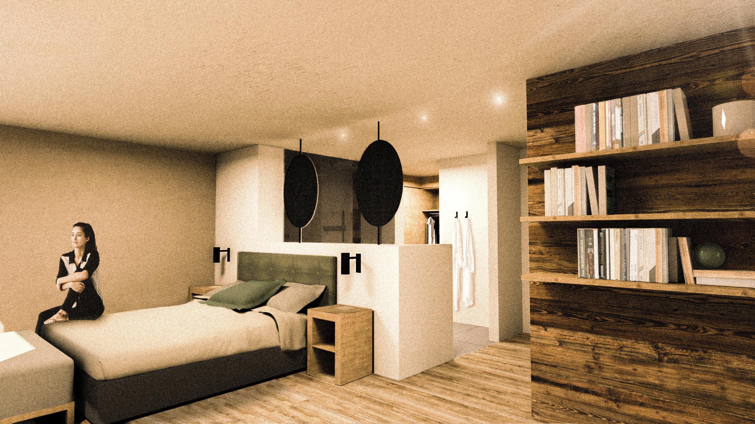 Südseite, 3-Raum-Suite: Kinderzimmer mit Stockbett, Einzelbett und TV, abgetrennter Wohnraum mit Sofa, Daybad, offenem Kamin, Whirlpool mit Panoramablick und TV, getrenntes Elternschlafzimmer, TV, Telefon, Safe, Minikühlschrank mit Kaffee - und Teebar, Mikrowelle, begehbarer Schrank. Alle Zimmer haben Zugang zum Balkon. Elternbadezimmer mit großzügiger Dusche, getrenntes WC mit Bidet, Kinderbadezimmer mit Dusche, WC und Bidet. Belegung 2 – 7 Personen