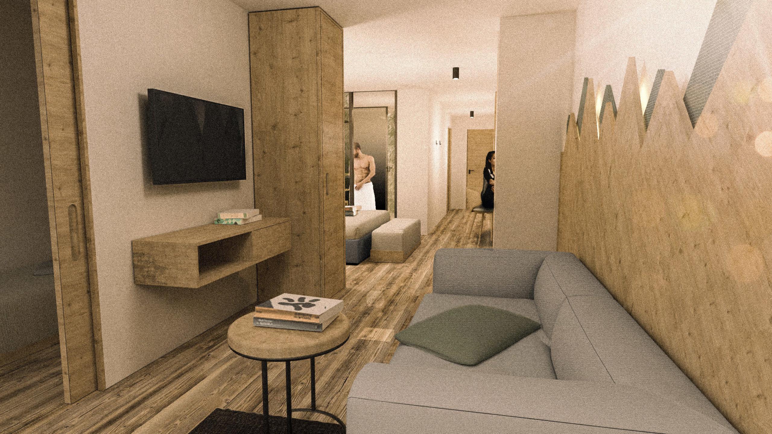 Südseite, 2-Raum-Suite: Kinderzimmer mit Stockbetten, TV, getrenntes Elternschlafzimmer mit offenem Wohnzimmer, TV, Sofa, Minikühlschrank mit Kaffee - und Teebar, Mikrowelle, Telefon, Safe, Balkon. Badezimmer mit großzügiger Dusche, getrenntes WC mit Bidet. Eine Treppe führt zum lichtdurchfluteten Rooftop-Raum mit Daybad, Dusche, Ausgang zur privaten Dachterrasse zur Südseite mit privater Sauna und Panorama-Whirlpool. Direkter Zugang zum öffentlichen Rooftop-Poolbereich.