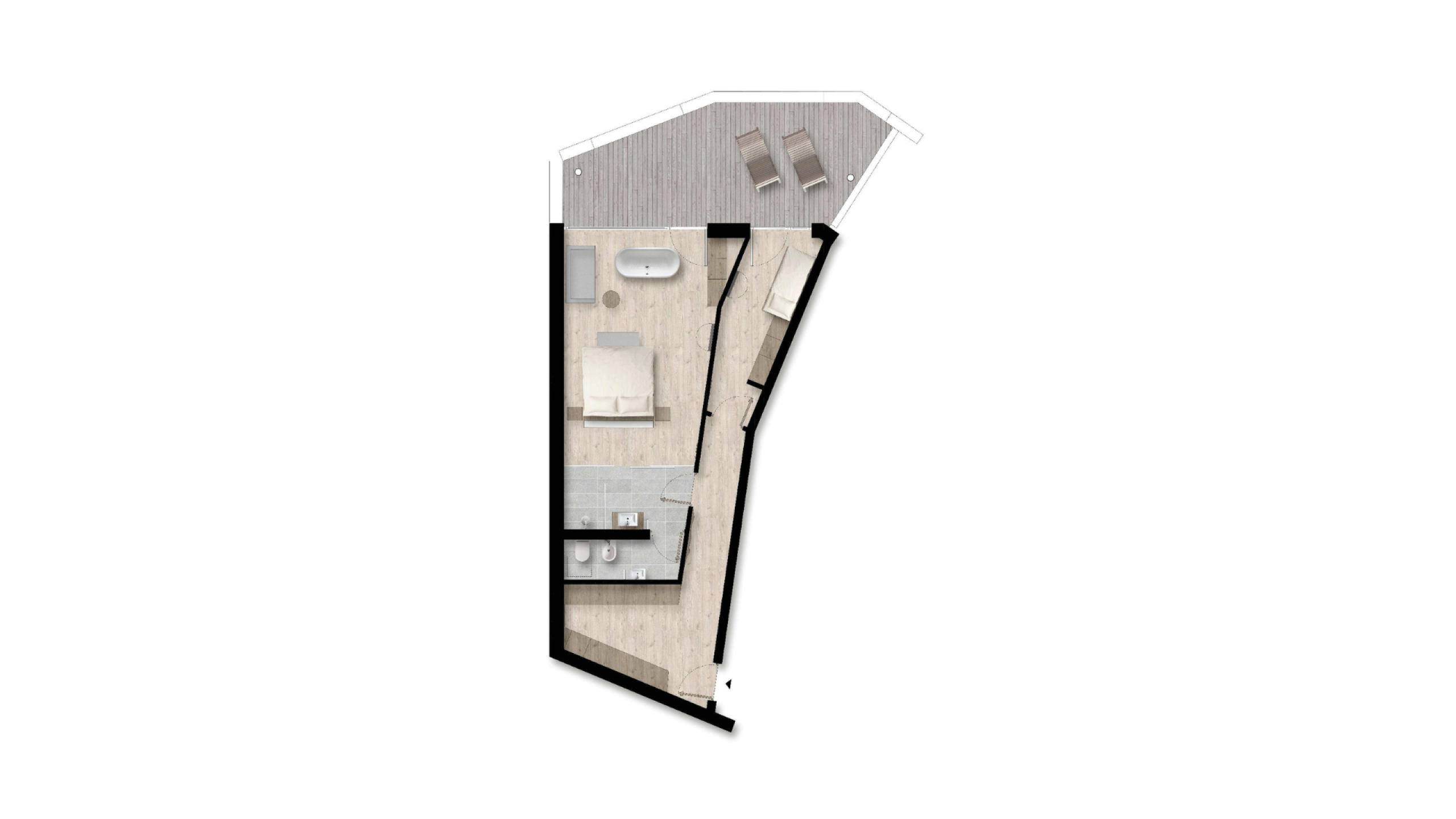 Südseite, 2-Raum-Suite mit ca. 40 - 60 m²: Kinderzimmer mit Stockbett und TV, Elternschlafzimmer mit offenem Wohnraum, Sofa, TV, frei stehender Badewanne, Telefon, Minikühlschrank mit Kaffee - und Teebar, Mikrowelle, begehbarer Schrank. Alle Zimmer haben Zugang zum Balkon. Badezimmer mit großzügiger Dusche, getrenntes WC mit Bidet.