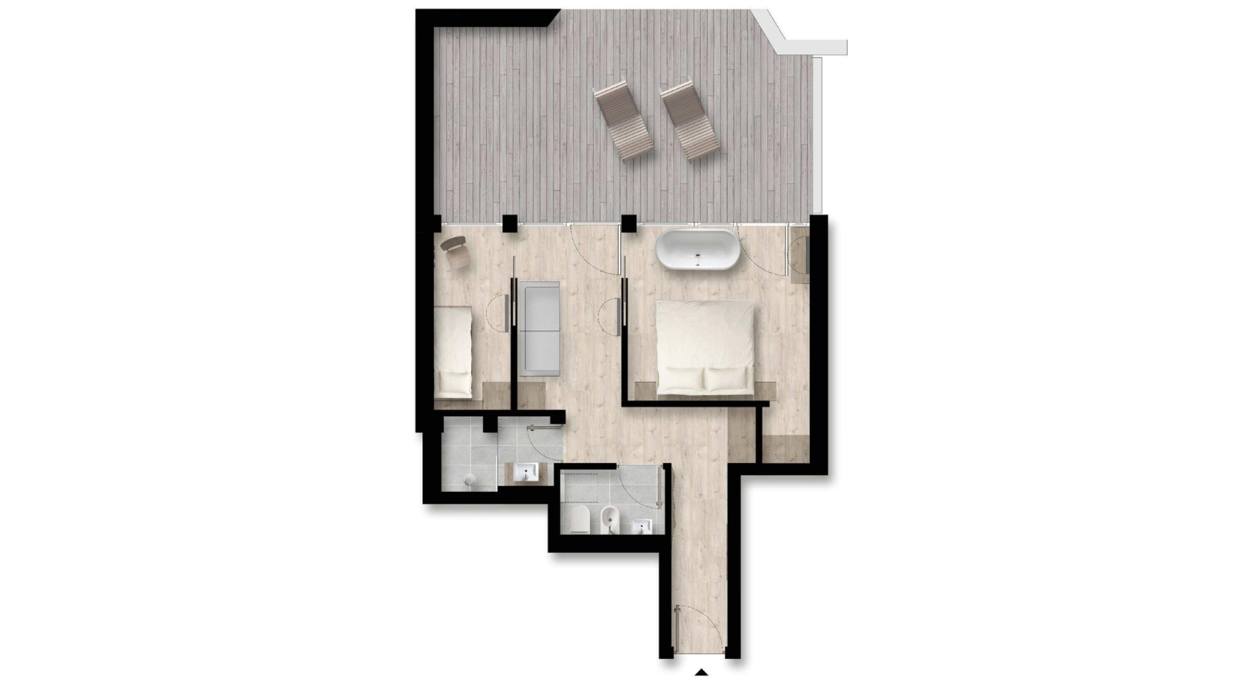 Nordseite, 3-Raum-Suite: Kinderzimmer mit Stockbett oder 2 Einzelbetten und TV, abgetrennter Wohnraum mit Sofa und TV, Elternschlafzimmer mit frei stehender Badewanne, TV, Telefon, Safe, Minikühlschrank mit Kaffee - und Teebar, Mikrowelle, begehbarer Schrank. Alle drei Räume haben Zugang zum Balkon. Badezimmer mit großzügiger Dusche, getrenntes WC mit Bidet,