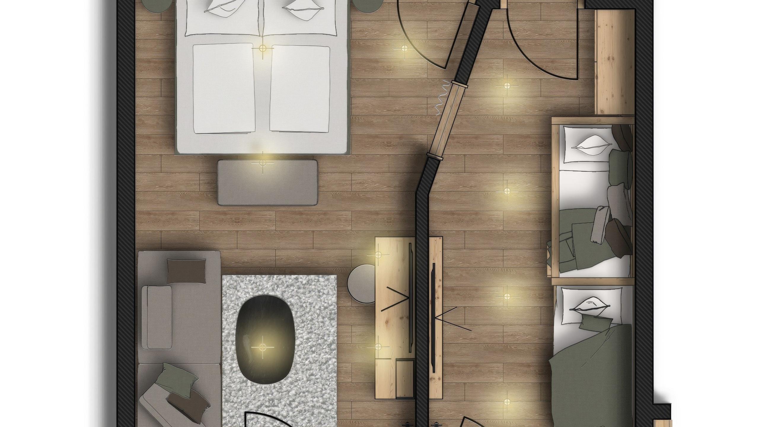 • Getrenntes Kinderzimmer mit Stockbett und Schlafcouch oder mit Einzelbett und Schlafcouch