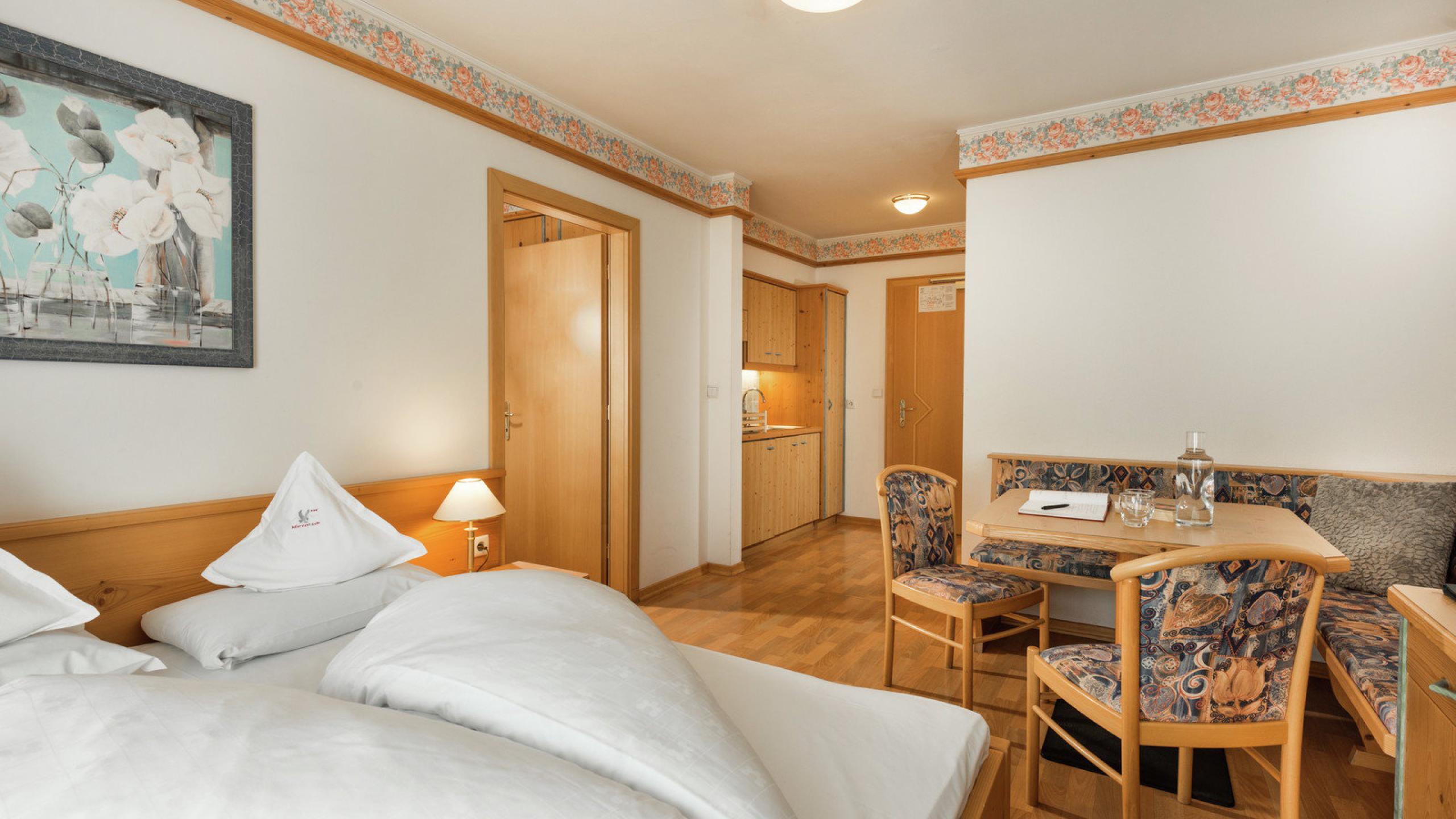 Diese helle Familiensuite 38m², bestehend aus einem Elternschlafzimmer und einem Wohn- bzw. Schlafraum mit zwei Extrabetten, ist der ideale Rückzugsort für deine Family. Neben der voll ausgestatteten Küchenecke und dem großzügigen Badezimmer punktet dieses Appartement auch mit einem Balkon.