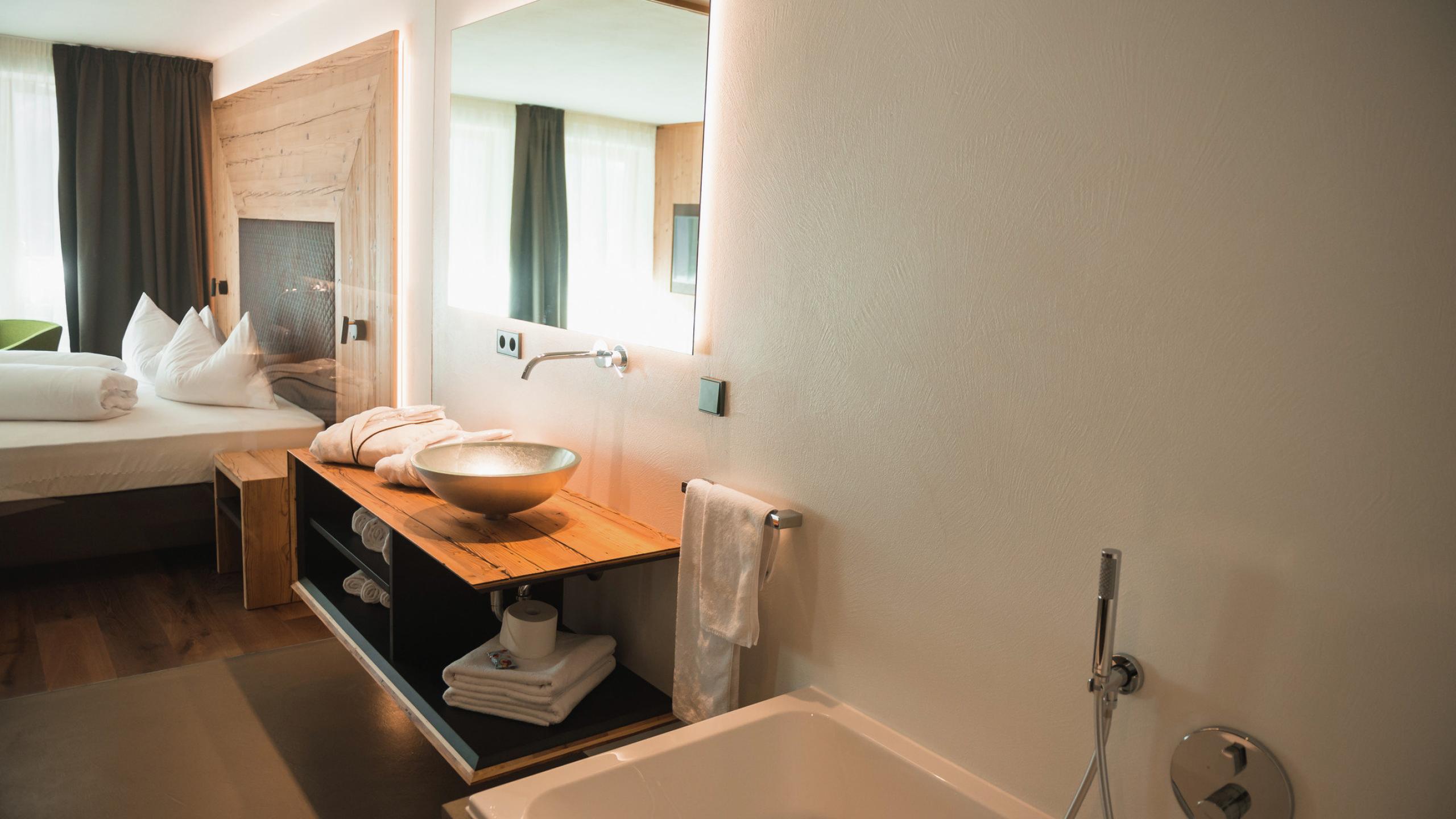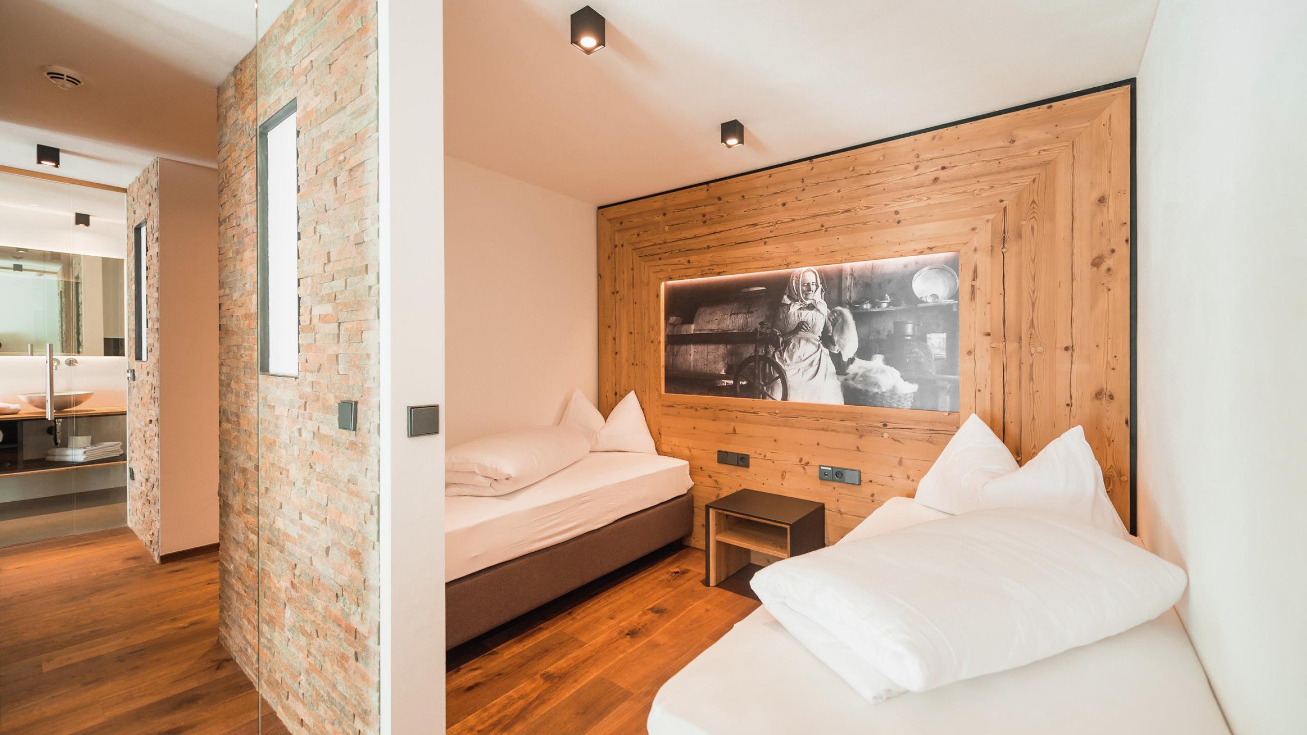 Diese großzügige Familiensuite 63m², bestehend aus einem Elternschlafzimmer und einem getrennten Kinderzimmer, gewährt einen einmaligen Blick auf die Gipfel des Schnalstals. Im Inneren punktet sie mit hellen Holzmöbeln, die Gemütlichkeit vermitteln, sowie mit jede Menge Platz zum Verweilen.