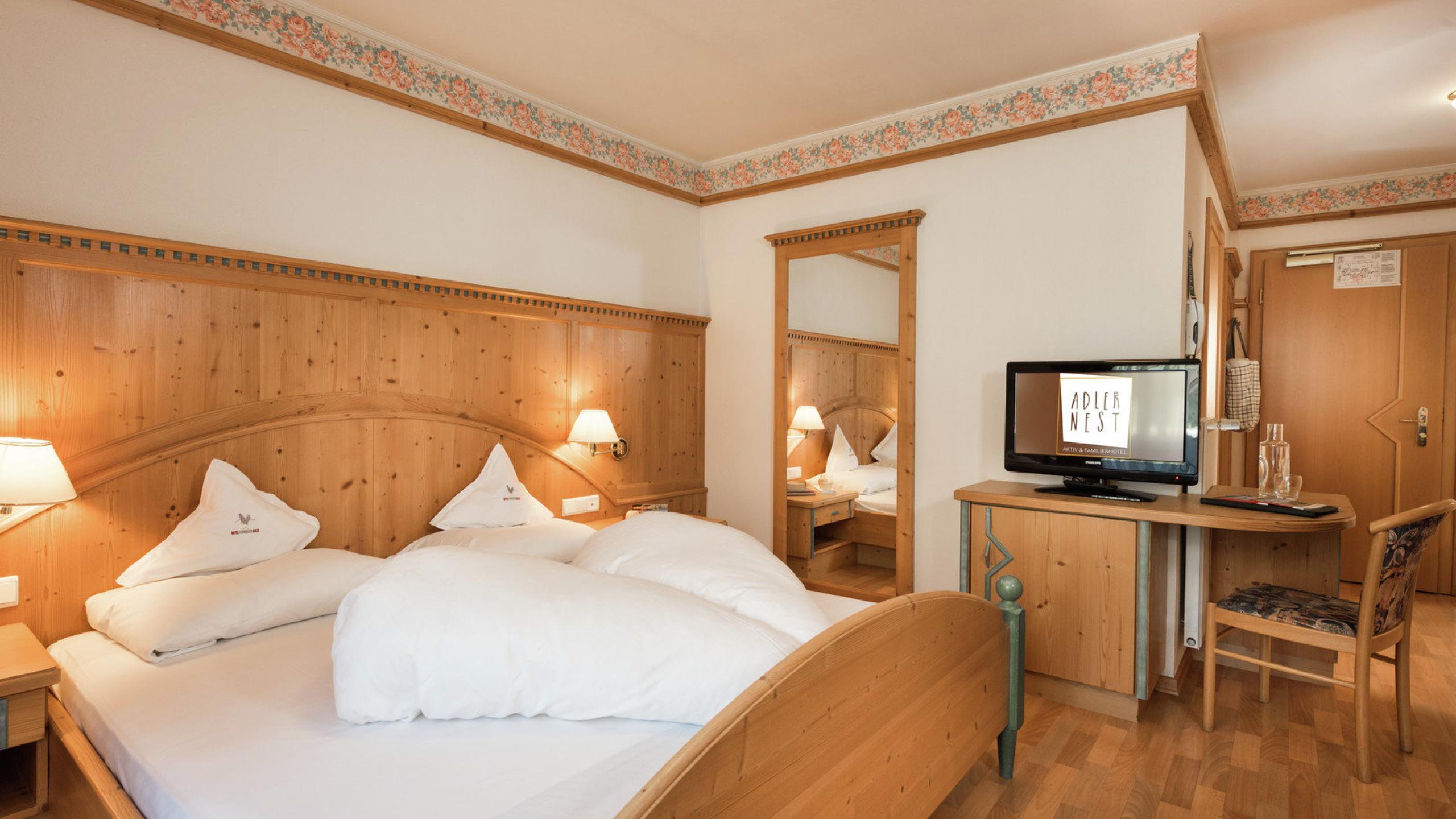 Dieses helle Zimmer 30 m² mit Doppelbett ist der ideale Rückzugsort für Pärchen sowie für Familien mit Kleinkind. Helle Holzmöbel, eine Küchenecke sowie ein voll ausgestattetes Badezimmer und einem großzügigen Balkon runden das Wohnerlebnis ab.