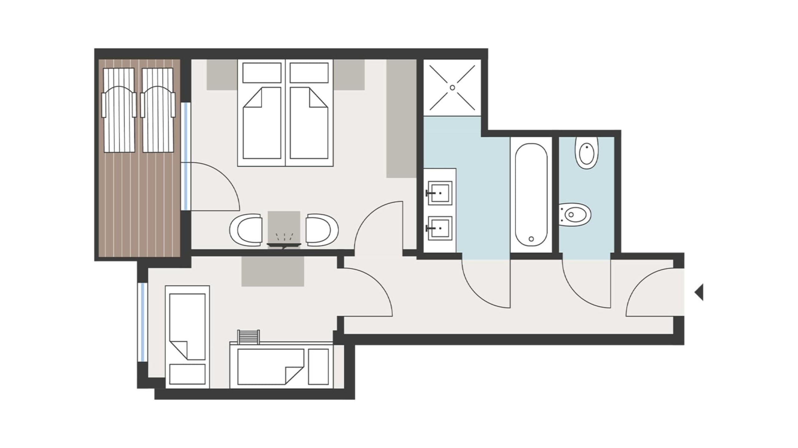 Große Familiensuite mit Wohn-Schlafbereich, getrenntem Kinder-Schlafzimmer (Stockbett und weiteres Kinderbett), Badezimmer mit Doppelwaschbecken, Badewanne und Dusche, getrenntem WC und Bidet, großer Süd-Balkon