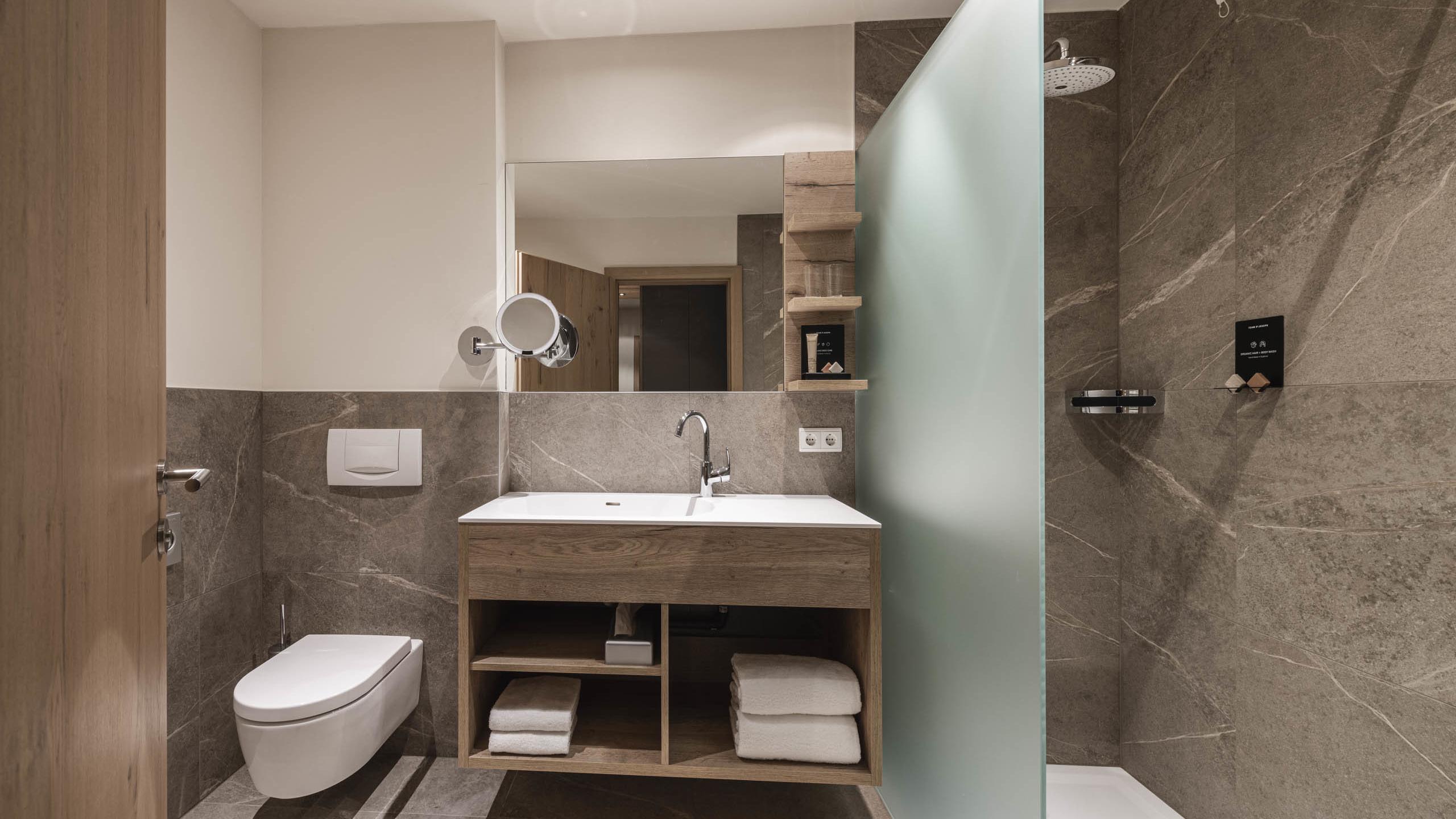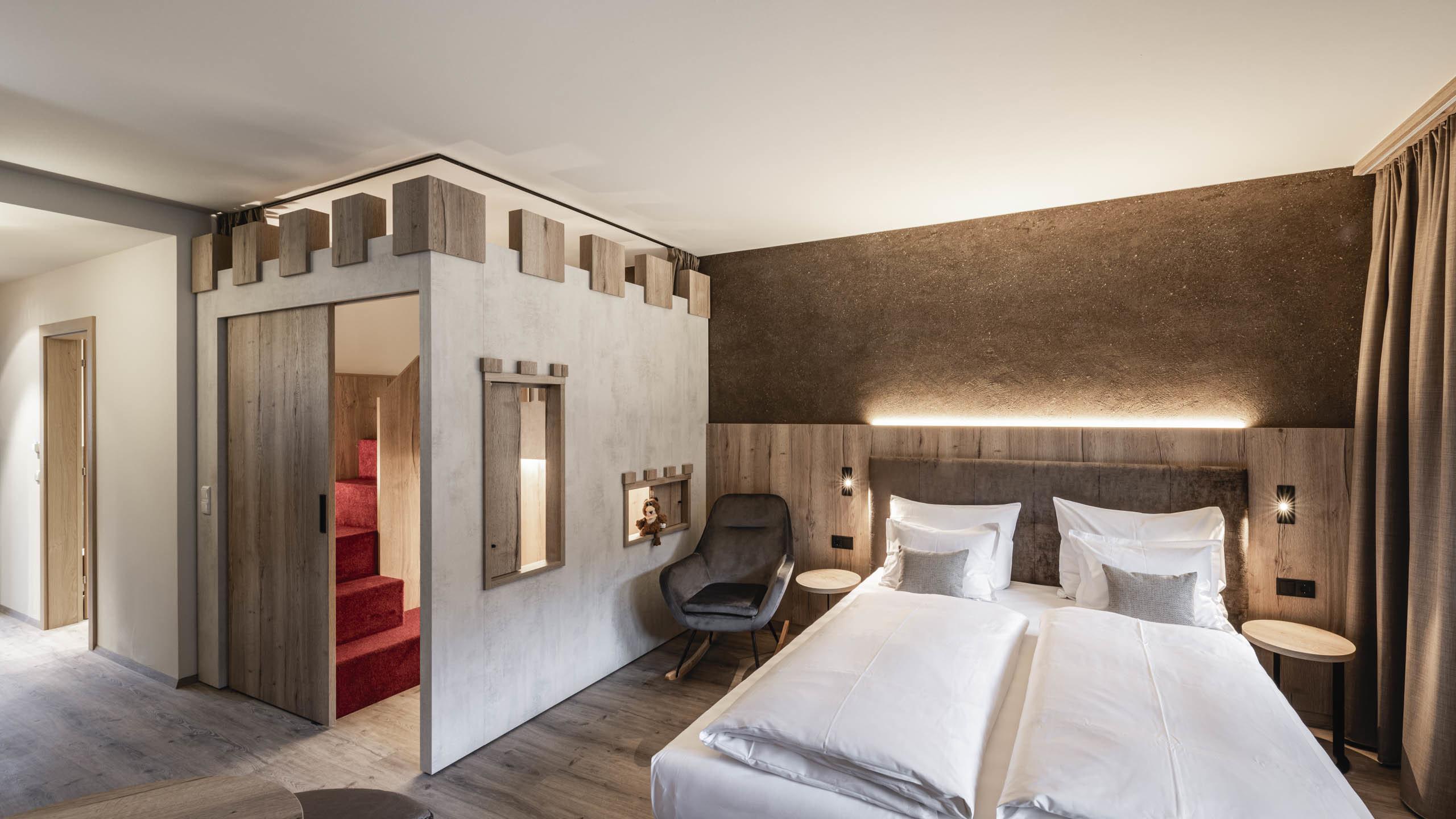 Ein herrlich gemütliches und lauschiges Zimmer für Kleinfamilien mit einem einzigartigen Highlight: einer Schlaf-Burg für das Kind. Getrennt durch eine Schiebetür und mit einem Fensterchen zum Boxspring-Doppelbett der Eltern ist es ein ganz besonderes Erlebenis für Ihren Liebling. Zudem bietet das Zimmer ausreichend Platz für ein Extra-Gitterbett für ein kleines Geschwisterchen.