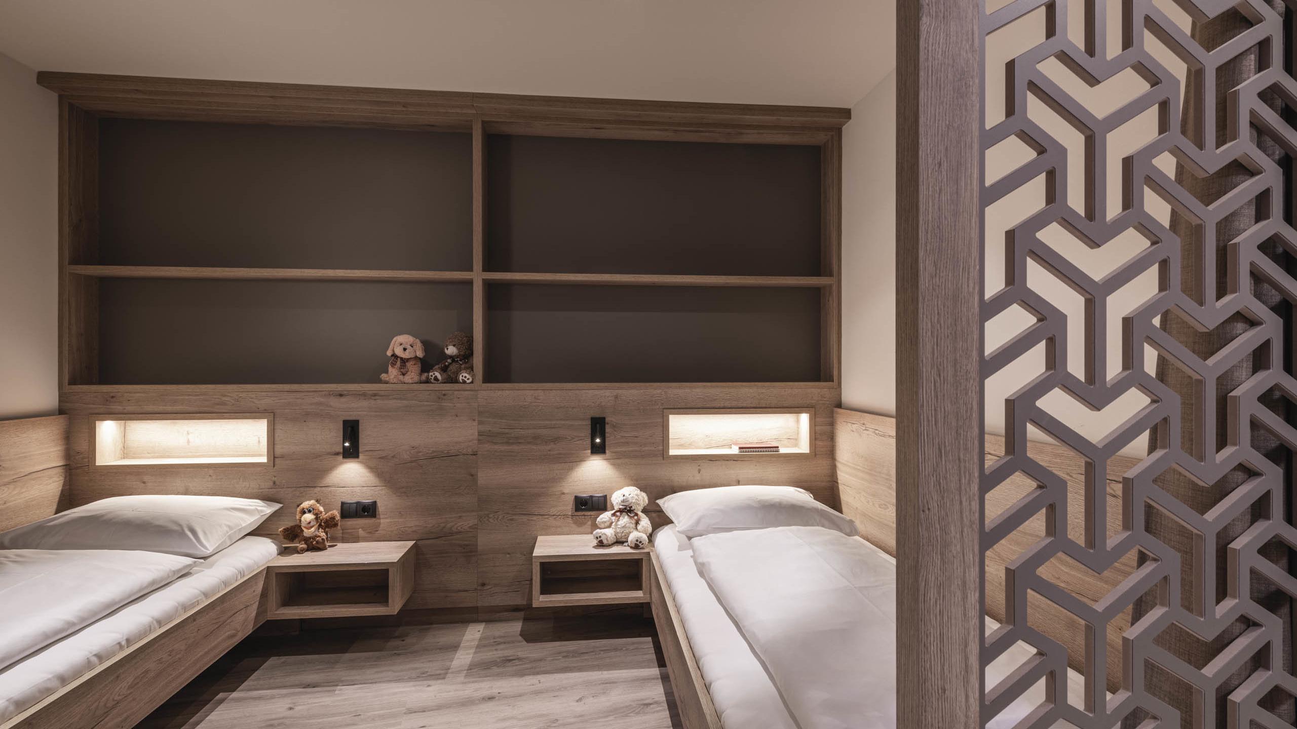 Mit Vorhang abgetrenntes Kinderzimmer mit zwei Einzelbetten