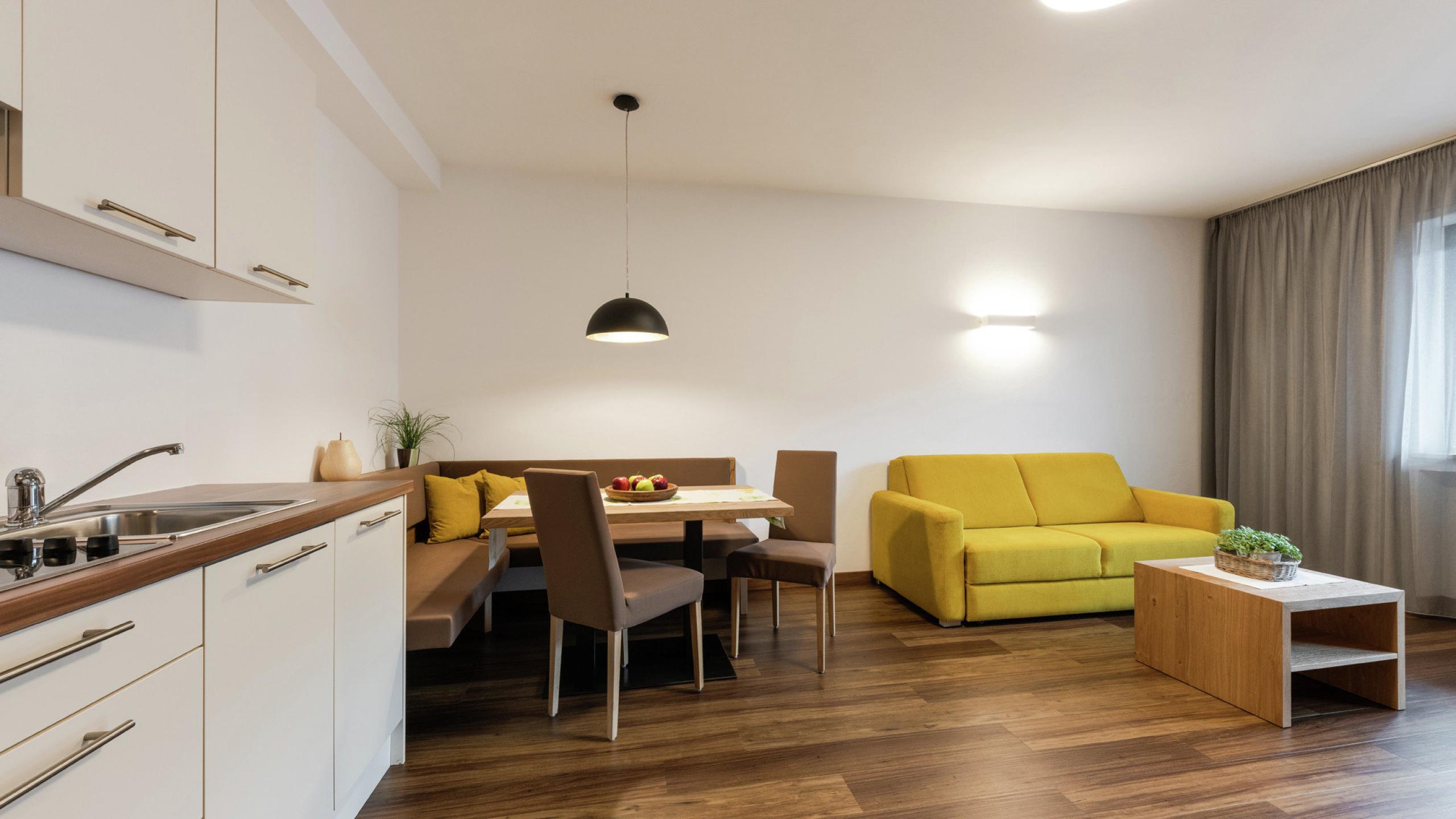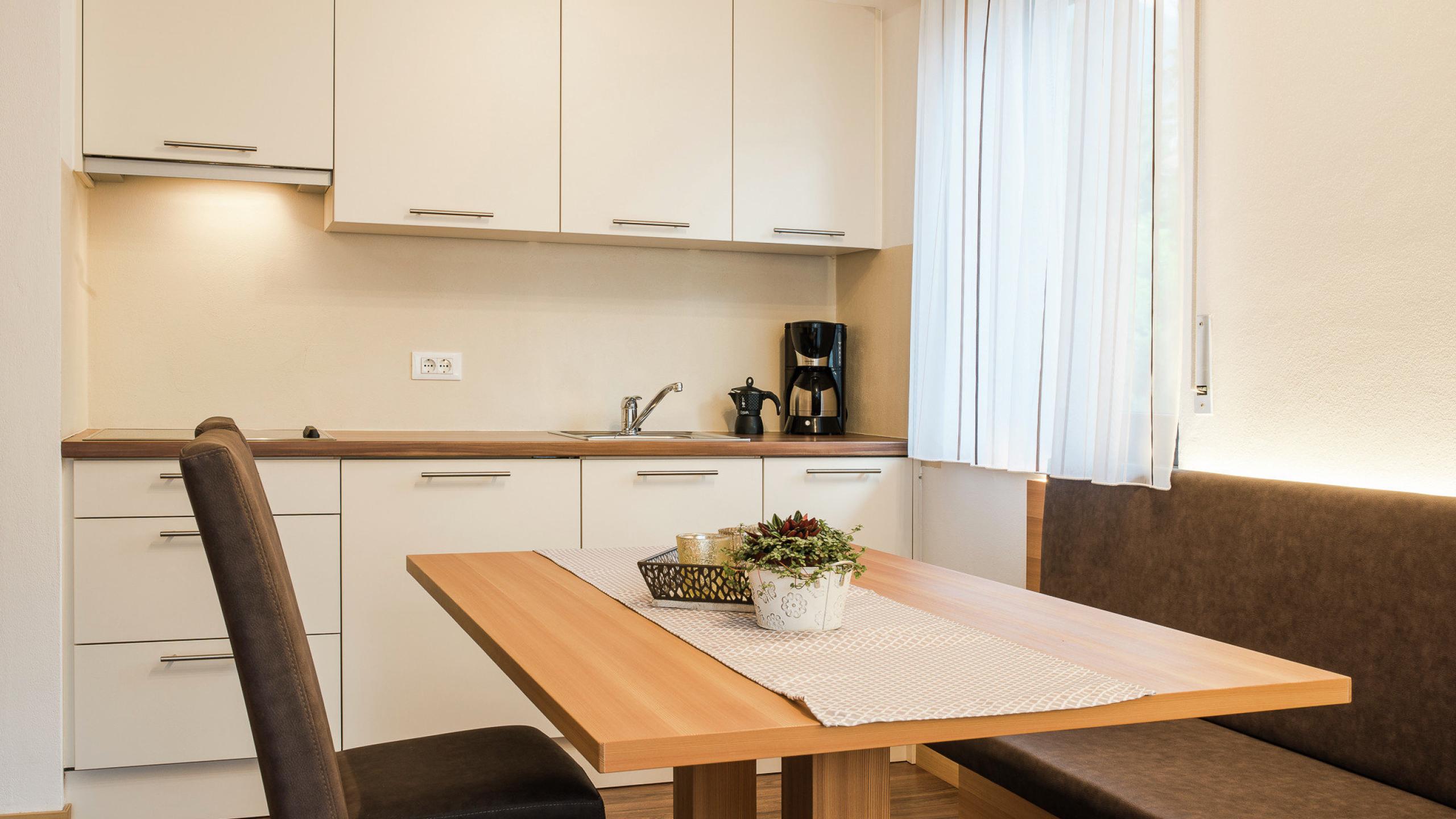 Wohnküche mit Sitzecke und Tisch, Mikrowelle, Nespressomaschine, Wasserkocher, Spühlmaschine, Schlafcouch, Safe, 1 Sat-TV, W-Lan kostenlos, Bademantel, Handtücher, Wellnesstasche mit Badetüchern, Bad mit Dusche, WC, Bidet, Waschbecken, Haarföhn, Schlafzimmer mit Doppelbett, Balkon Südblick