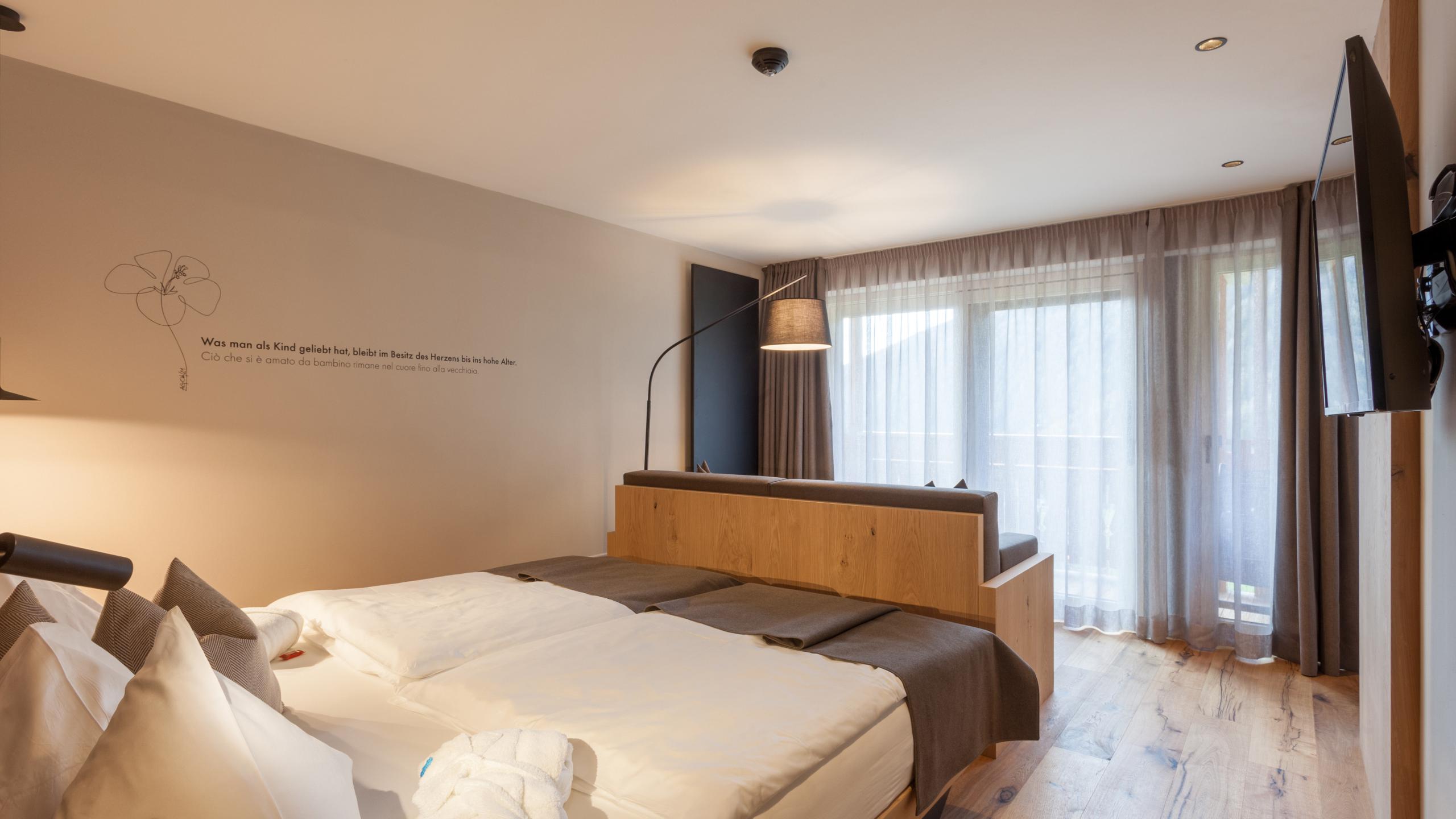 Suite mit eigenem Kinderzimmer auf der Südseite, ca. 36 m², Naturholzboden, Stockbett, großzügiges Bad mit Badewanne, WC, Bidet, Flat- TV, W-LAN Zugang, Safe, Haarfön, Kosmetikspiegel, Telefon, Balkon, flauschiger Bademantel