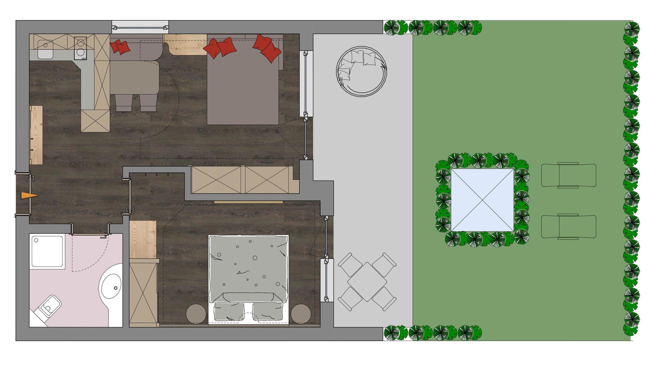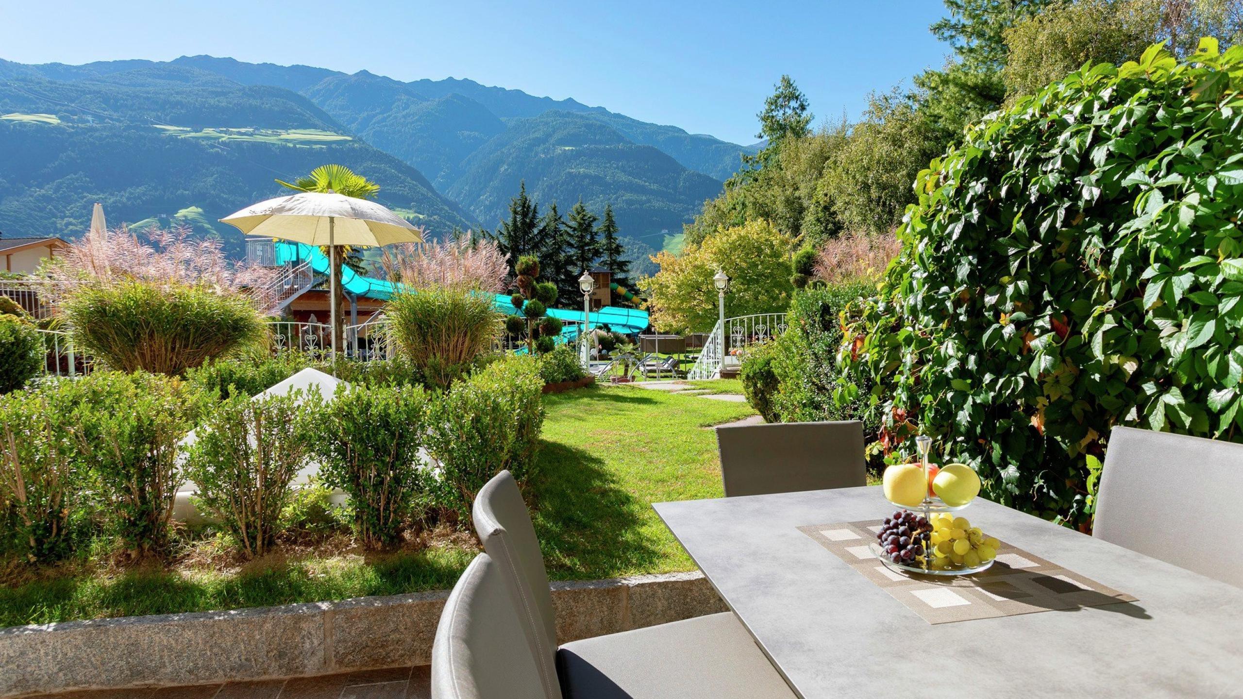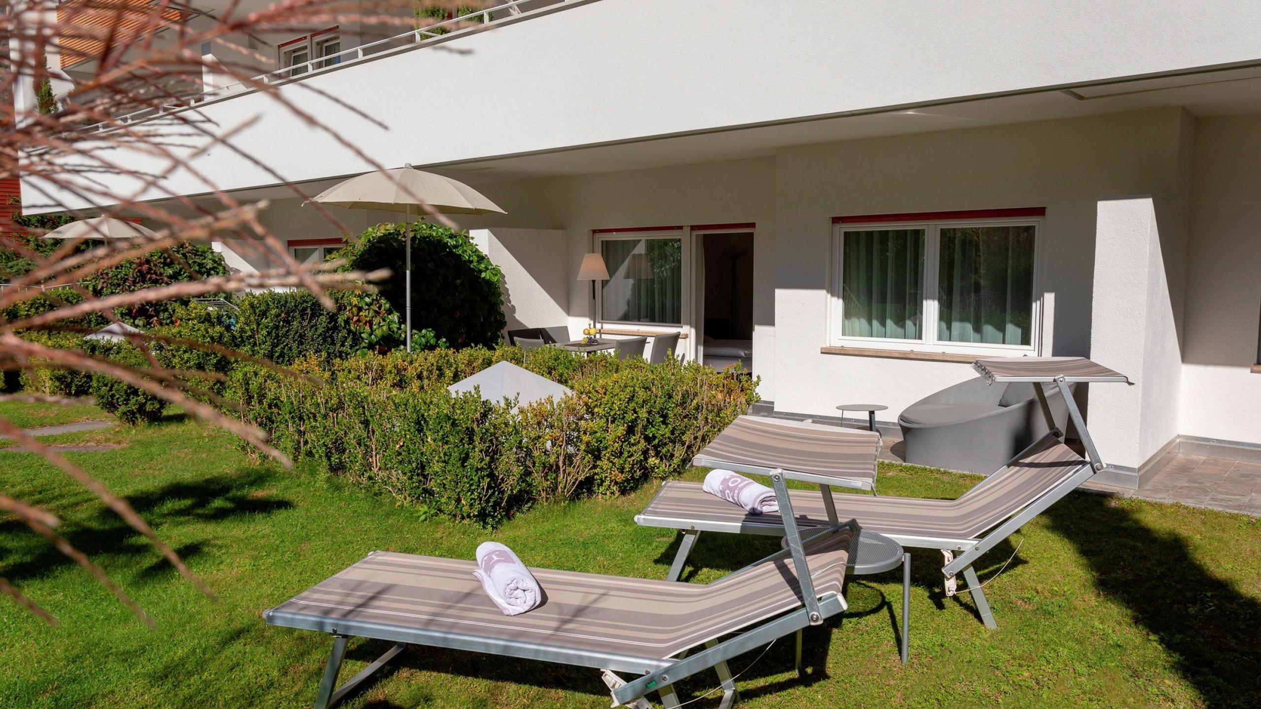 • 30m² privater Gartenbereich zur Südseite mit Elektro-Markise, Liegestühlen und Gartenmöbeln und direktem Zugang zum Außenpool