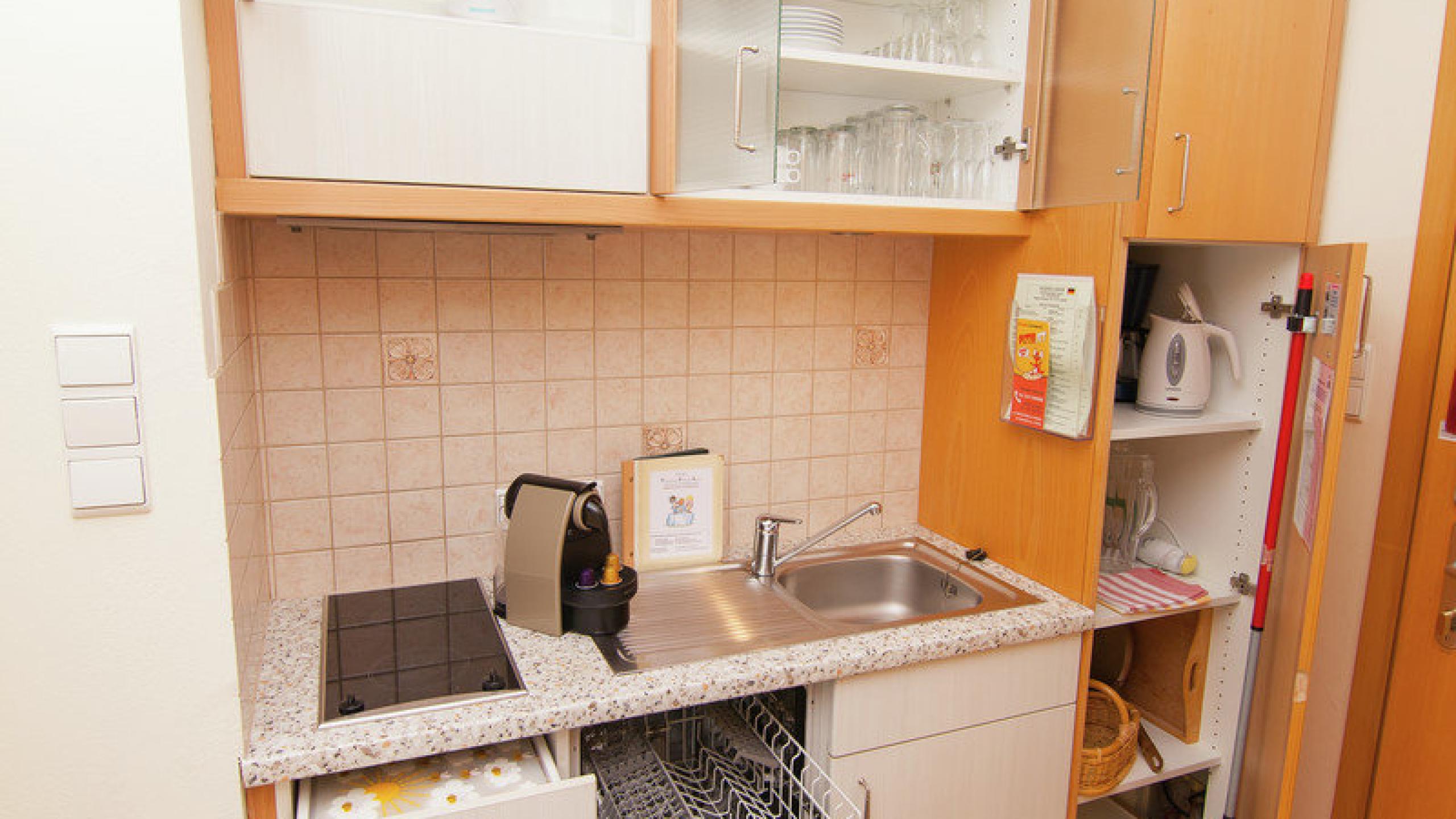 • 1 kleine Kochnische (mit 2er Ceran-Herdplatte) und komplette Kücheneinrichtung