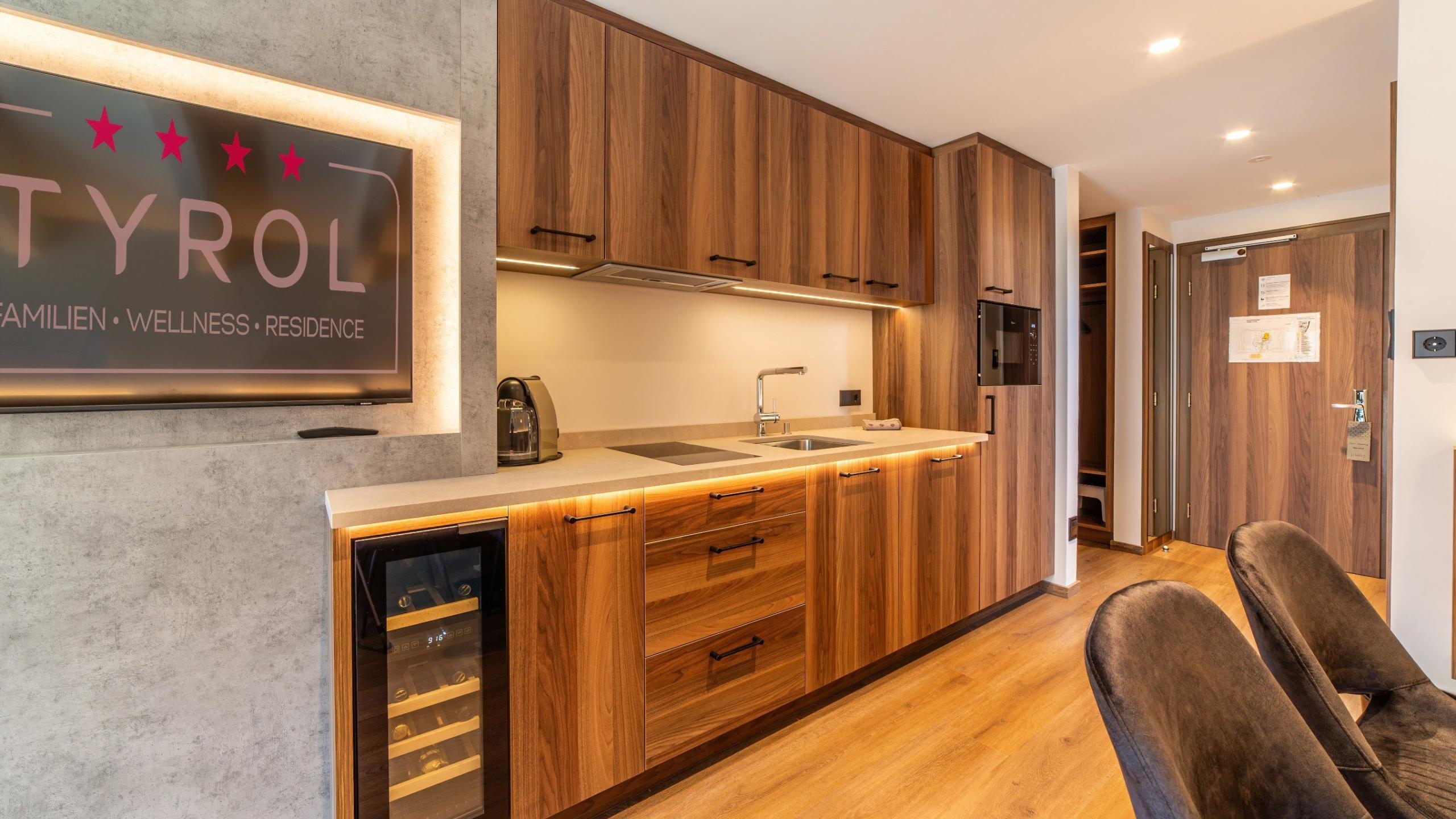 • 1 kleine Kochnische (mit 2er Ceran Herdplatte), komplette Kücheneinrichtung und eigenem Weinklimaschrank