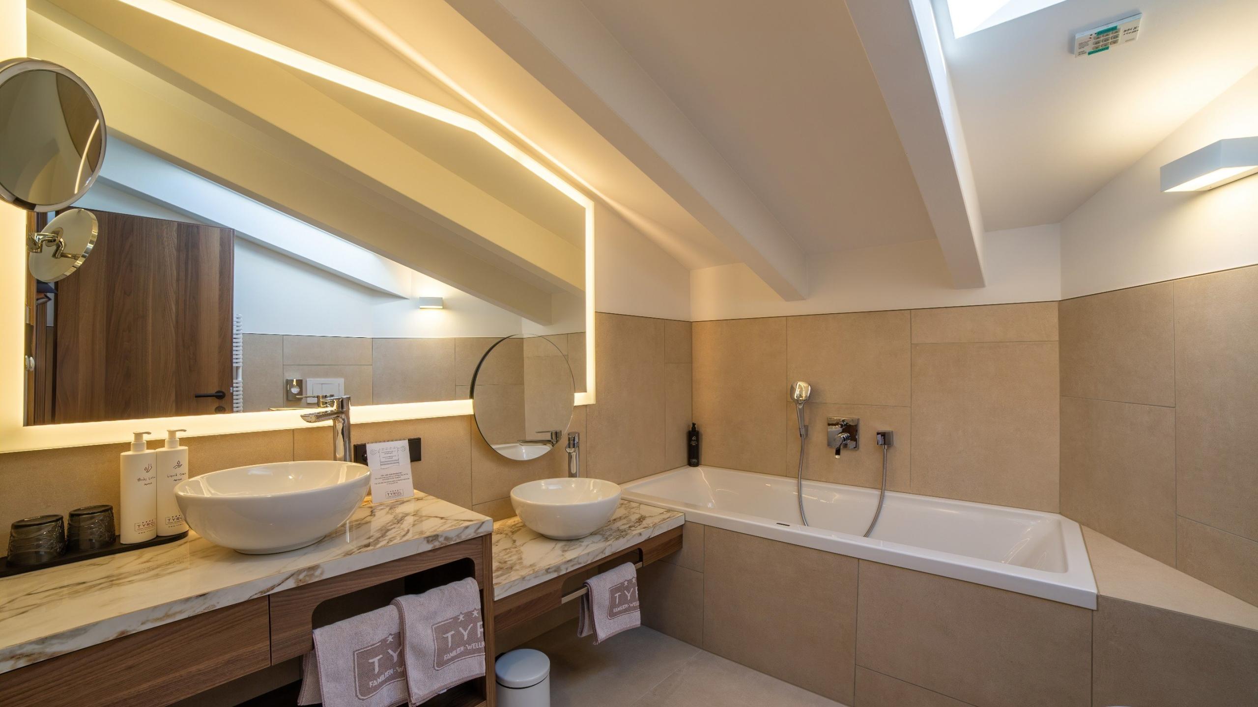 • 1 Badezimmer mit Badewanne, WC, Waschbecken und separates Kinderwaschbecken