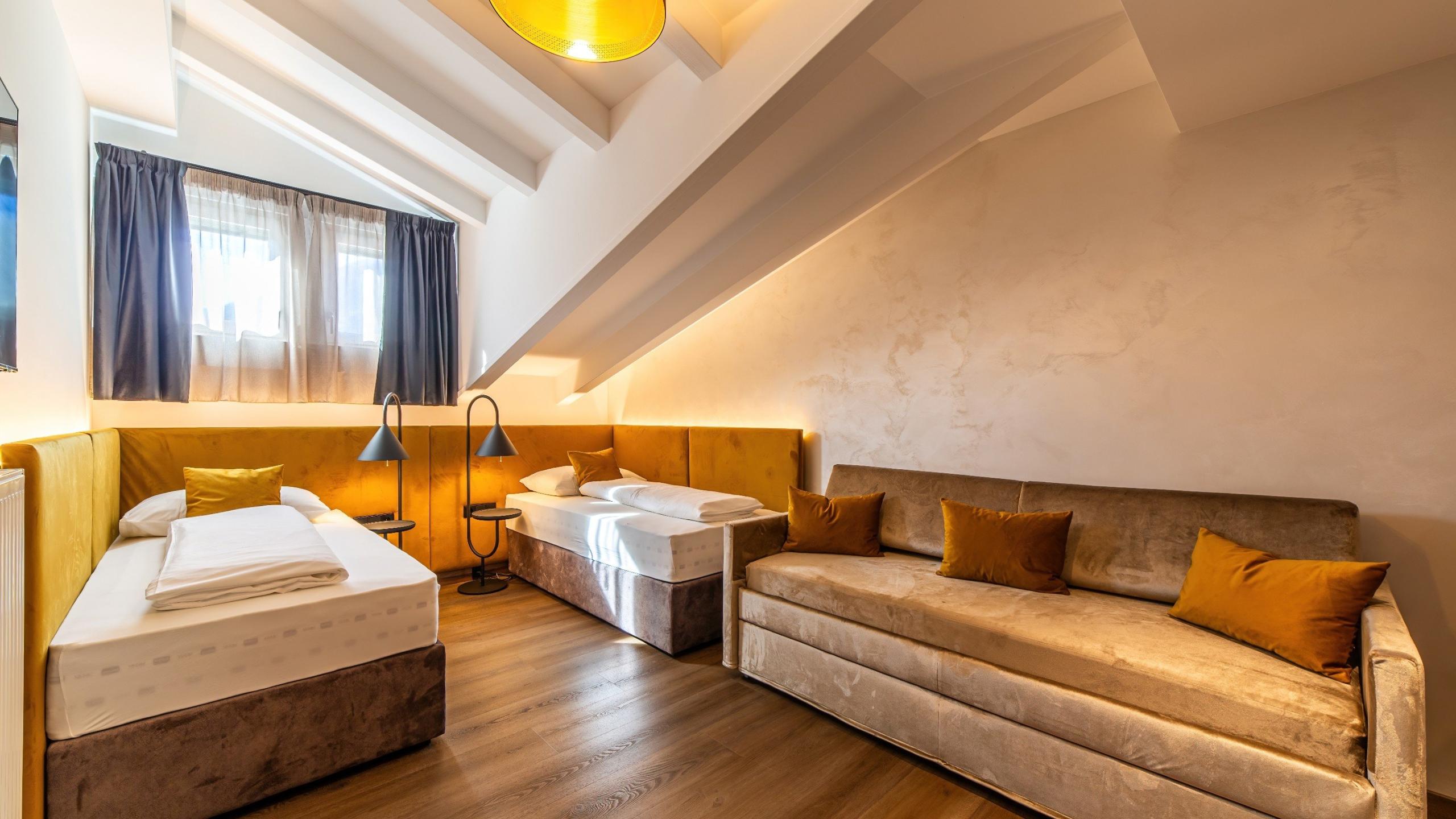 • 1 Schlafzimmer mit 2 Einzelbetten (auch als Doppelbett zusammenschiebbar) und einer Couch mit Stockbettfunktion für max. 2 Kinder und Sternenhimmel