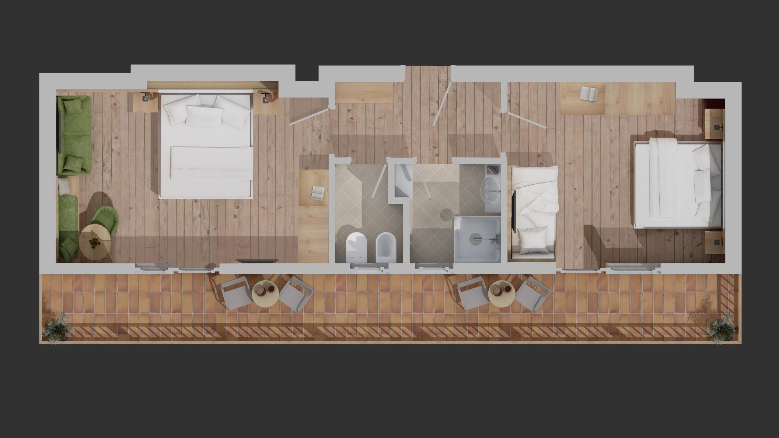 Family Suite Fuchs, neu - ca. 44 m². Doppelbettzimmer mit Couch und Dreibettzimmer, 2 Sat-TV, Safe, Sitzecke, Kühlschrank und WiFi. Badezimmer mit Dusche, getrenntes WC, Bidet, Föhn, und Bademäntel. Ostbalkon mit Panoramablick.