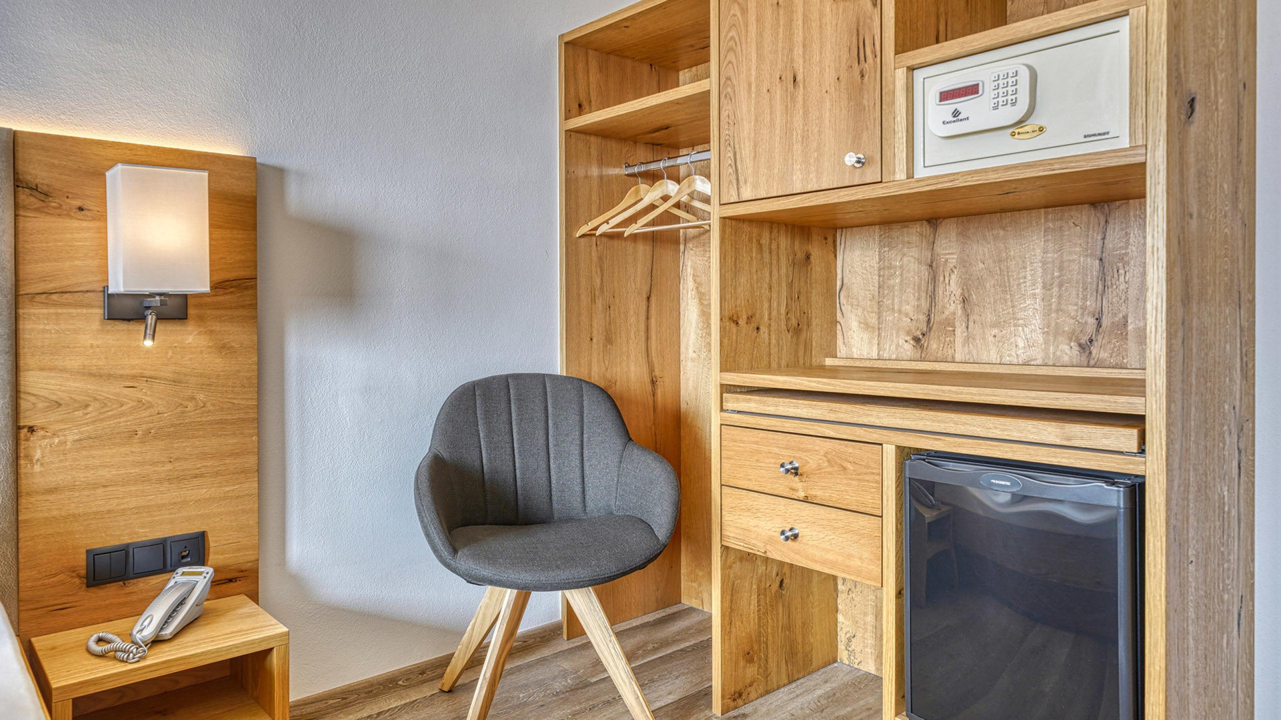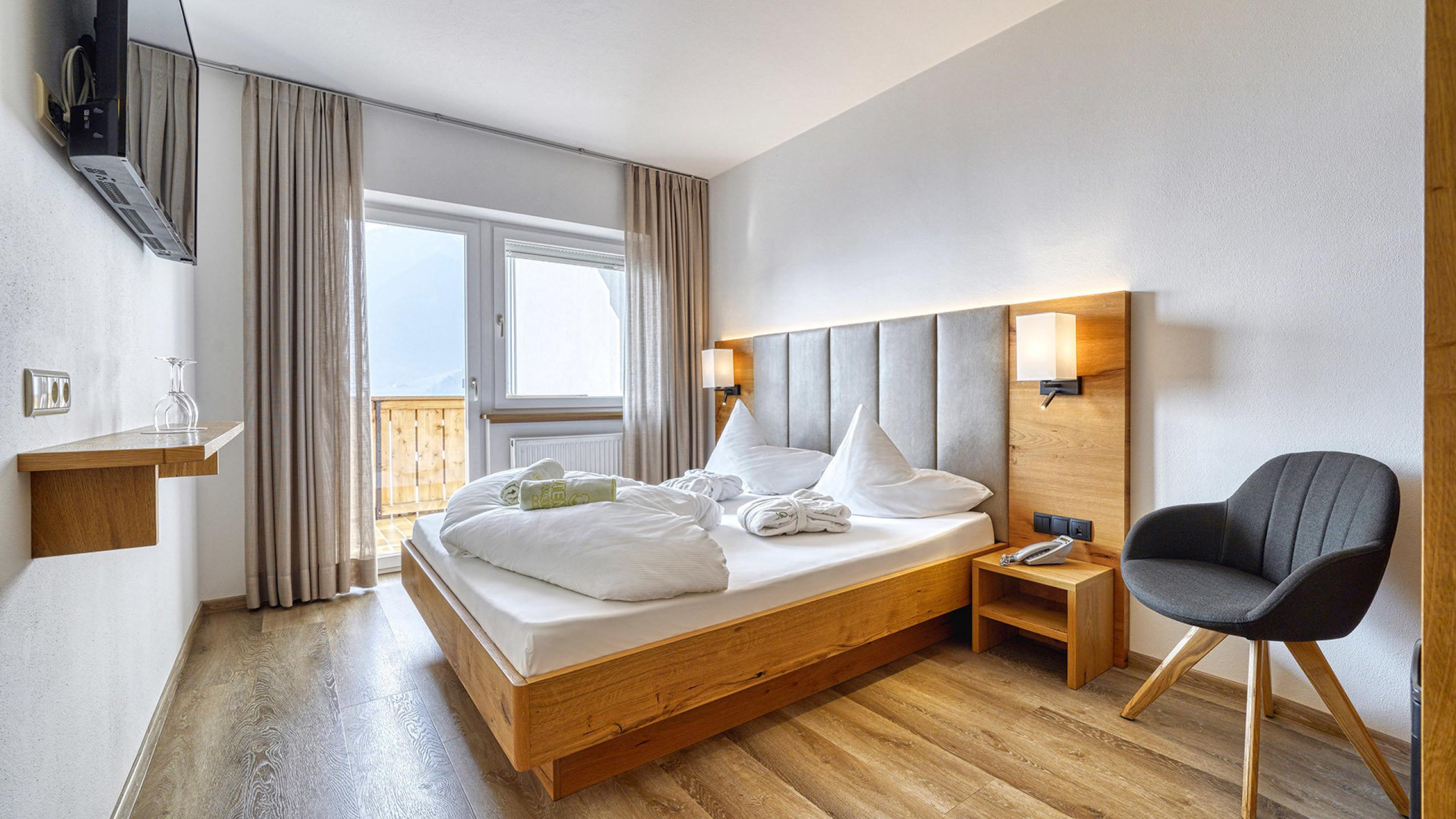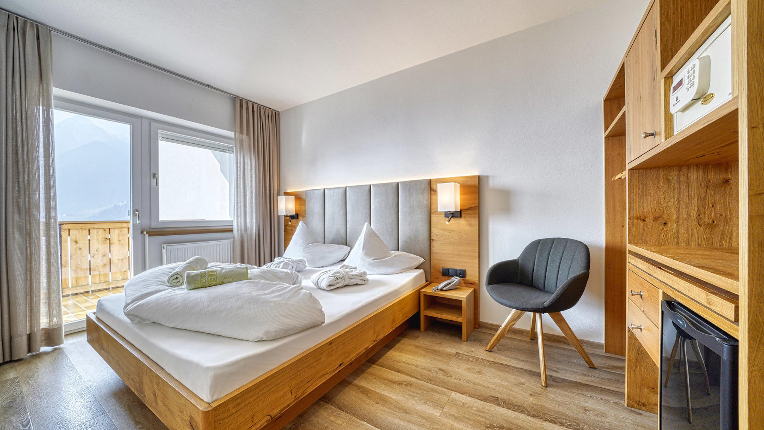 Panorama Hermelin Einbettzimmer - ca. 18 m². Einbettzimmer mit Doppelbett, Sat-TV, Safe, Kühlschrank und WiFi. Badezimmer mit Dusche, WC, Föhn und Bademäntel. Süd-Westbalkon mit Panoramablick auf die Berge.qm