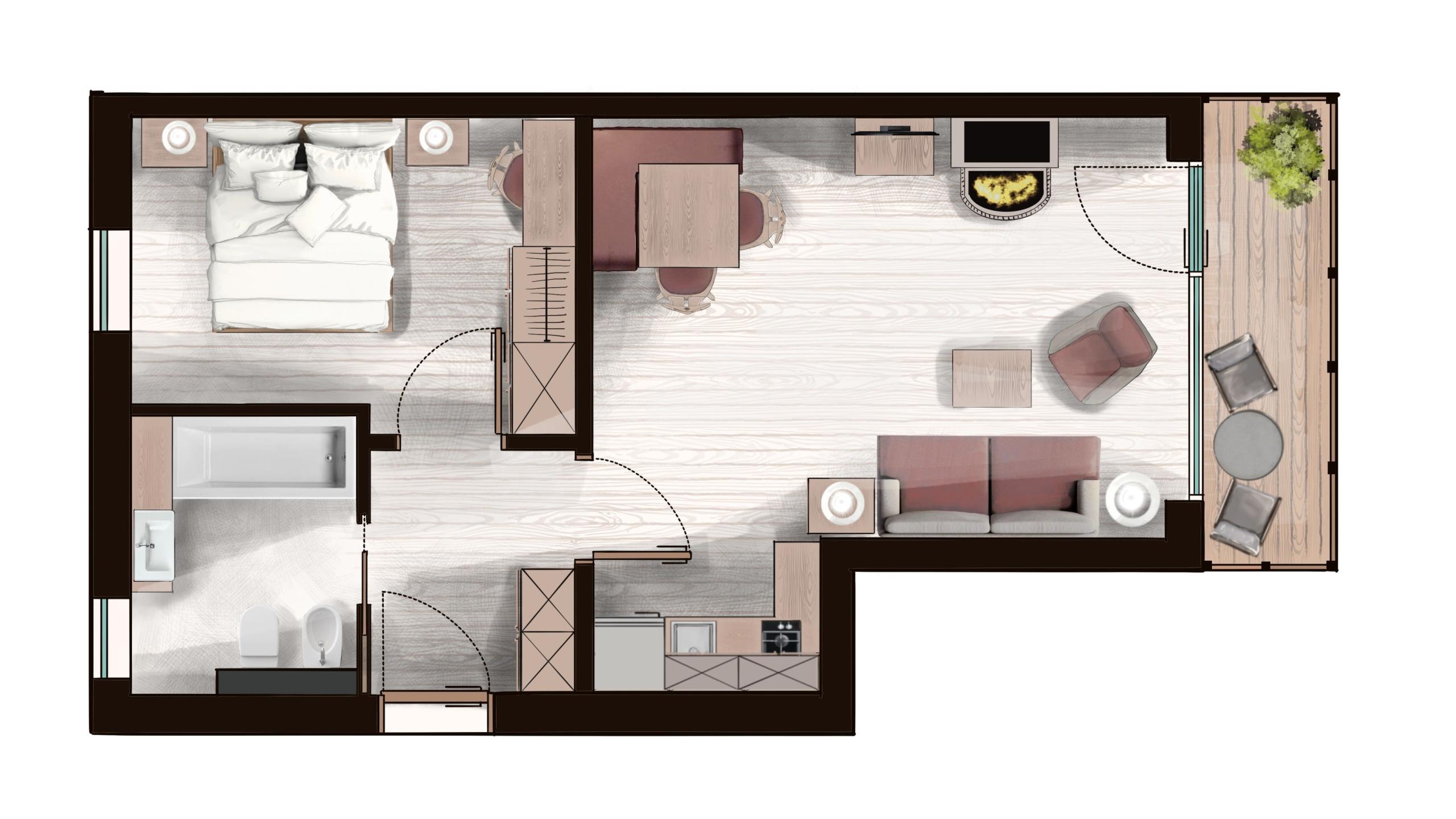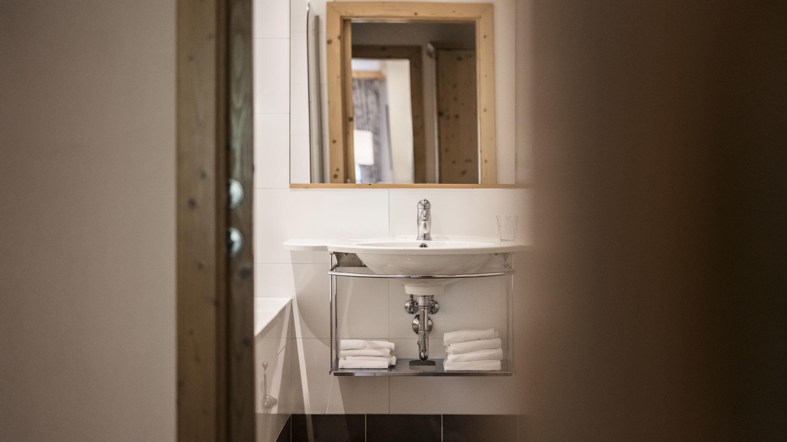 Das Chalet Dolomit mit 41 m² verfügt über einen Wohnraum mit offenem Kamin und Kochnische, Balkon, ein getrenntes Schlafzimmer und Bad mit Wanne oder Dusche. Es ist besonders geeignet für 2 Personen.