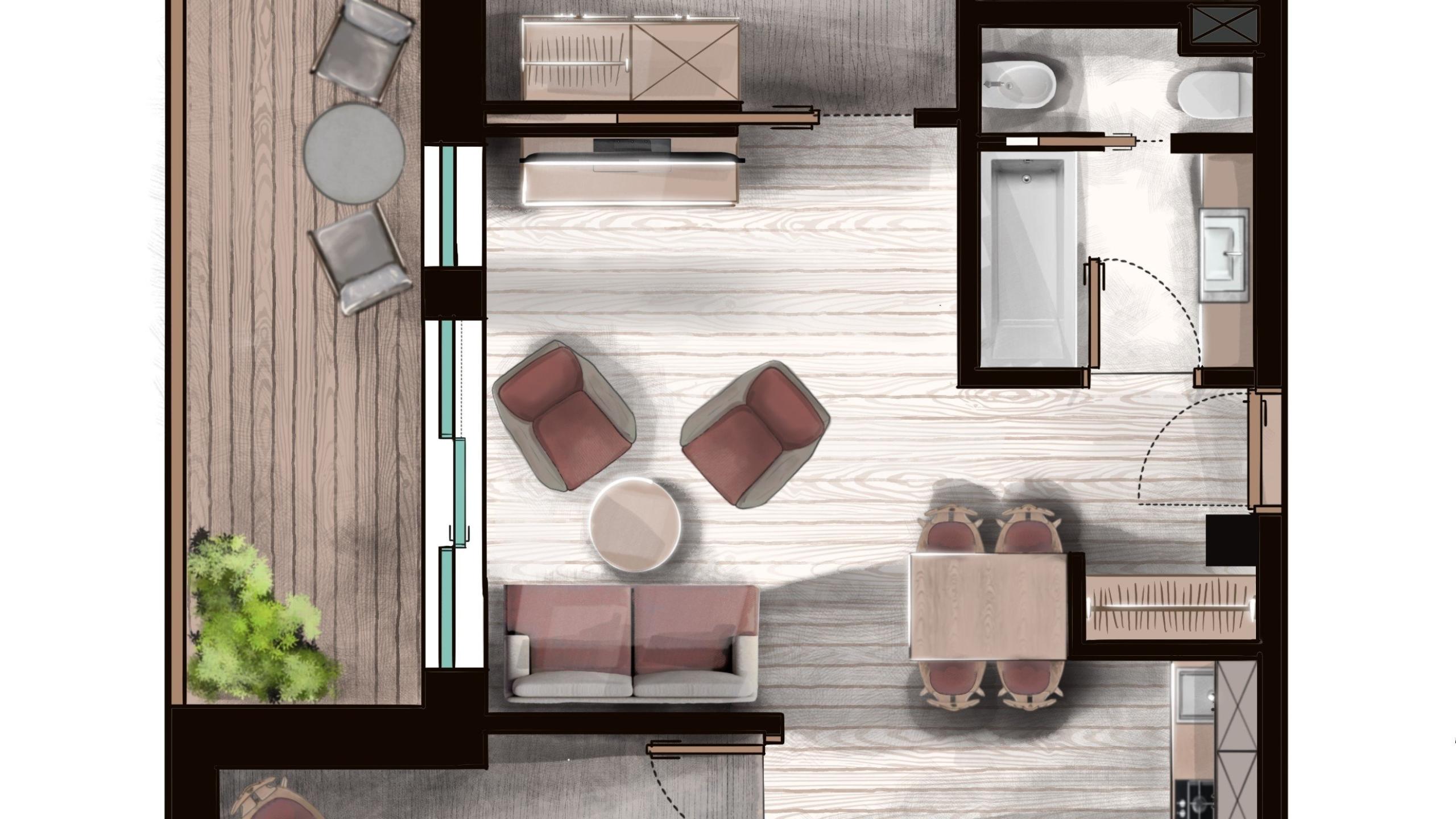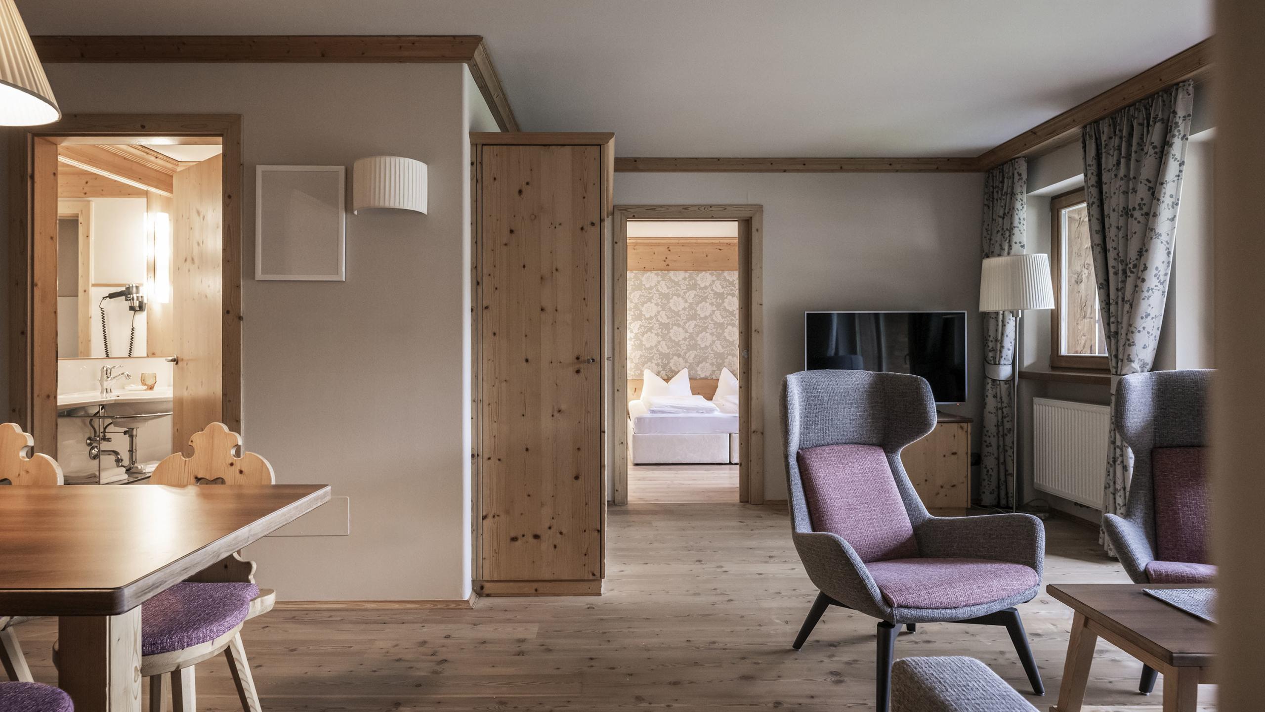 Erleben Sie einen Familienurlaub im Siebten Himmel. Wie der Name schon sagt befindet sich das Wohnparadies Settimo Cielo im dritten Geschoss des Haupthauses. In den wunderschönen Suiten mit einer Größe von 65 m² hat man in der Tat das Gefühl, sich im siebten Himmel zu befinden, wenn man rundum ausblickt in die alpine Gartenlandschaft, in der das Post Alpina weidet.