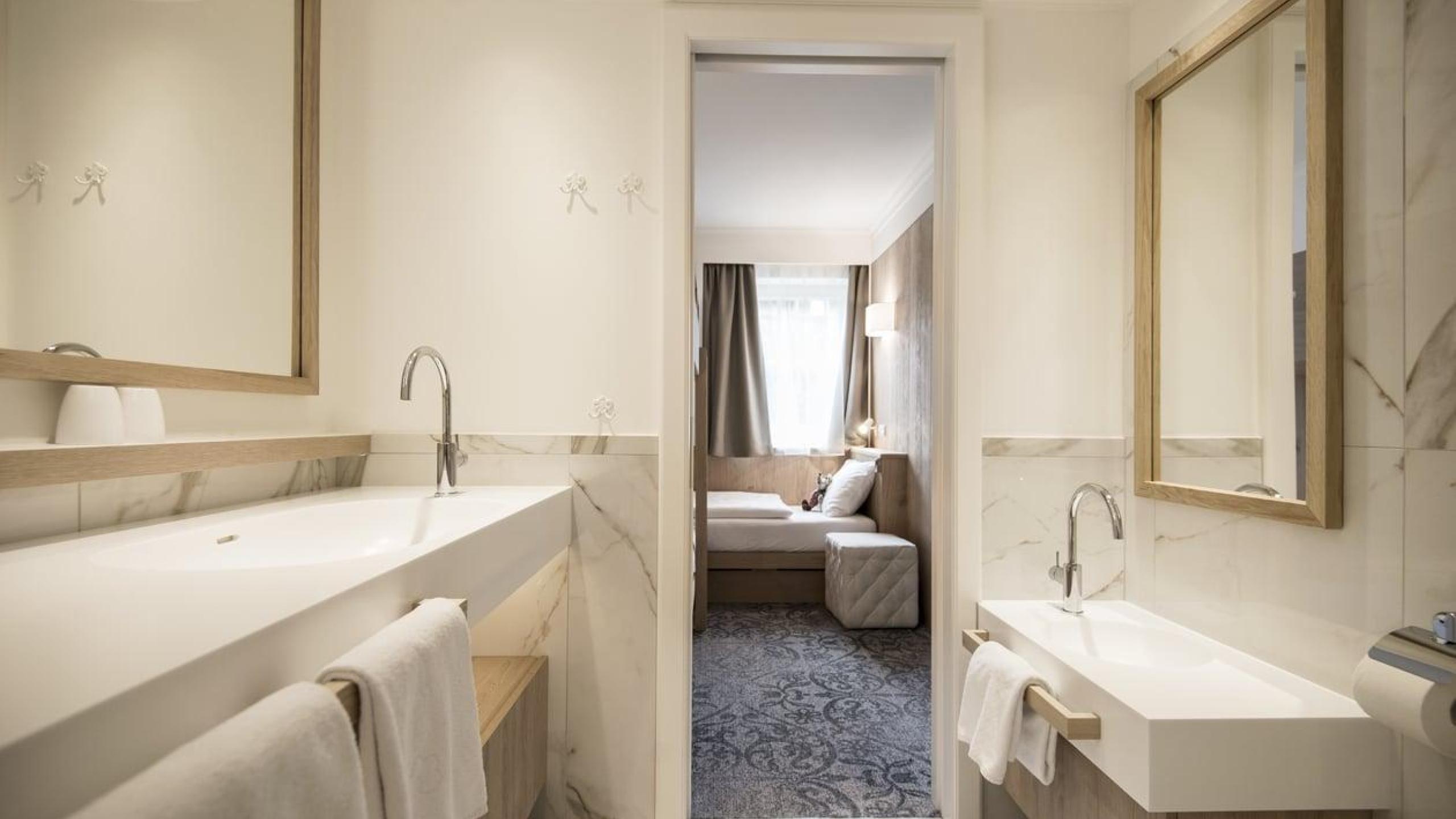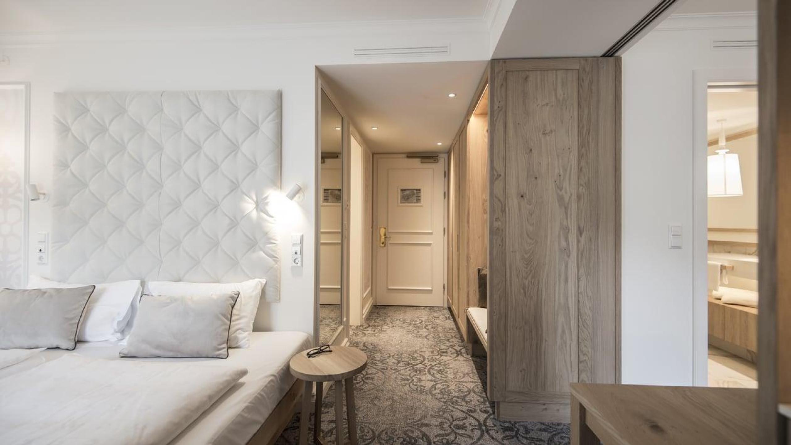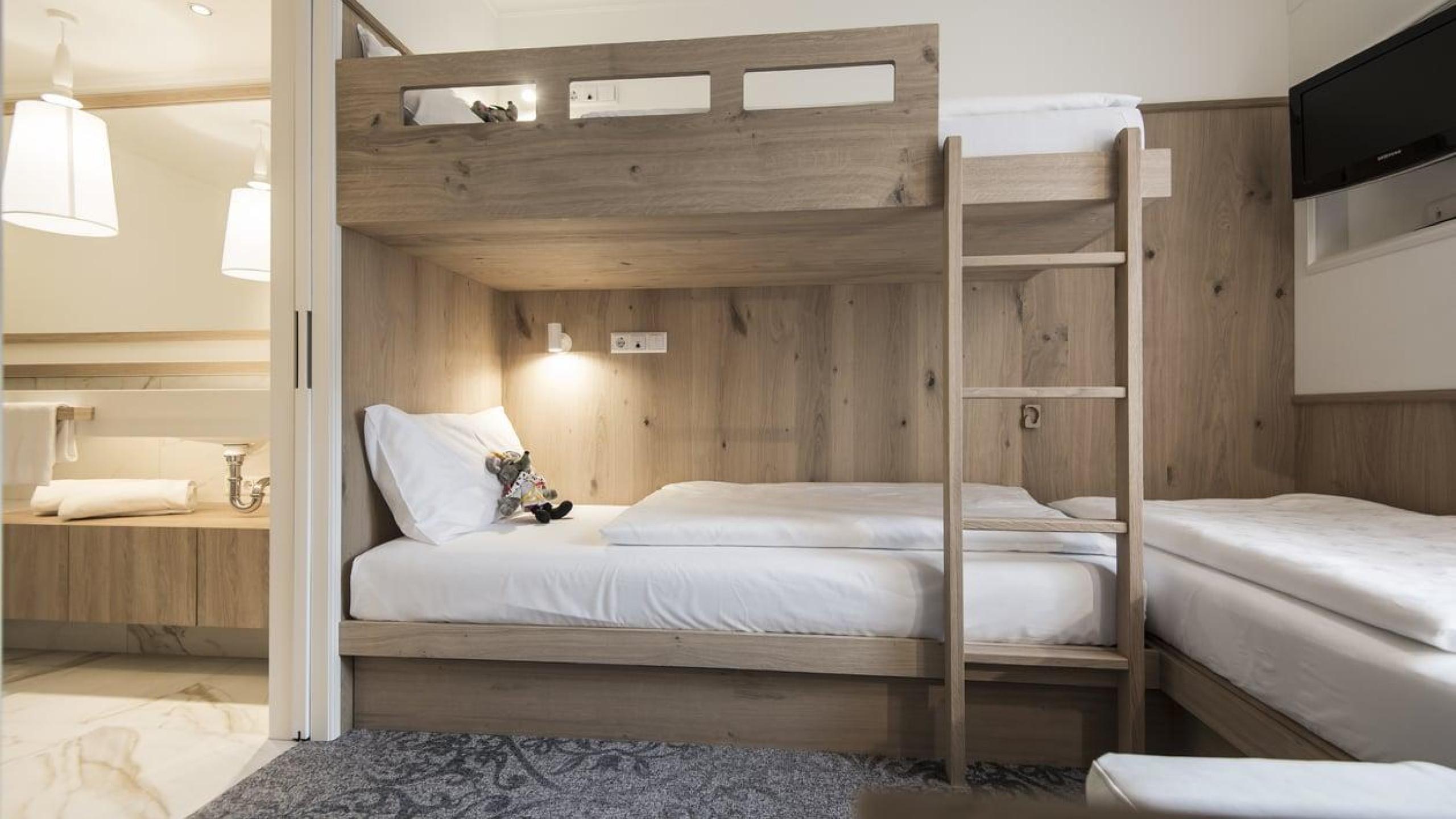 Doppelzimmer mit ausklappbarem Babybettchen, Wohnbereich, Badezimmer mit Dusche, WC und Bidet. Zimmer mit 2 Einzelbetten/Babybetten und zusätzlichem Klappbett. Badezimmer mit Badewanne, Babybadewanne mit Wickeltisch, Kinder WC und Waschbecken. Wi-Fi, 2 TVs, Safe, Pantry mit Wasserkocher, Mikrowelle, Kühlschrank, Geschirr und Besteck. Nach Nordosten ausgerichteter Balkon mit Bergblick.
