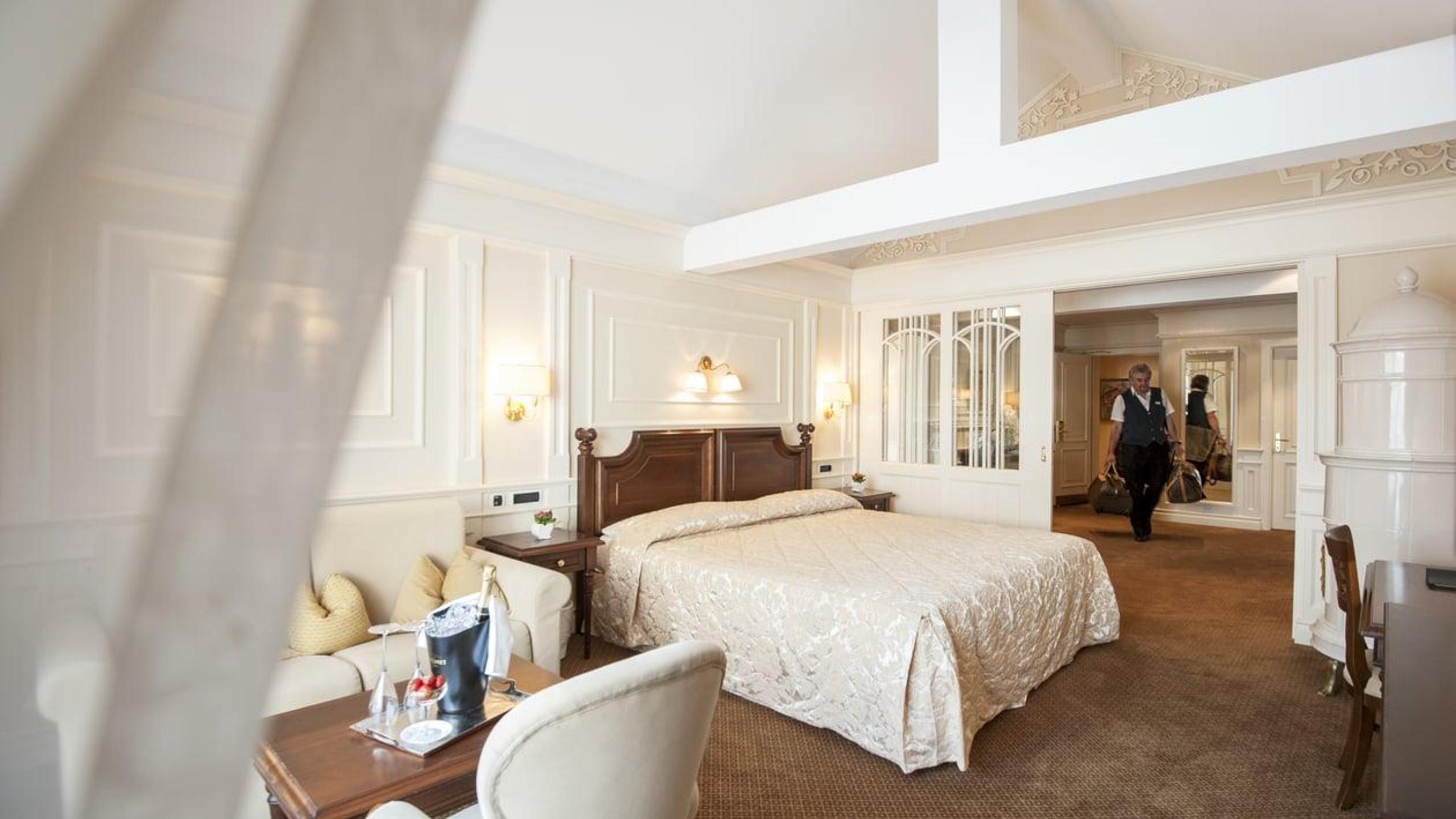 Wohn-Schlafraum mit Sitzecke und Balkon, zusätzliches separates Schlafzimmer für 1 bis 2 Kinder (keine Stockbetten). Bad mit Badewanne und Dusche bzw. Duschwand, Bademäntel, Föhn, Schminkspiegel, separates WC mit Bidet, Wickeltisch. Teilweise mit Kachelofen. 32" LCD TV, Telefon, Internet-Anschluss, Safe, Minibar.