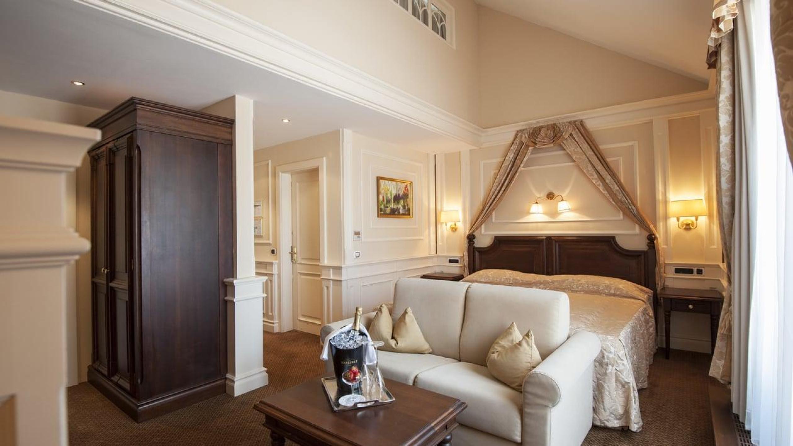 Wohn-Schlafraum mit Sitzecke und Balkon, im Obergeschoss zusätzliches Schlafzimmer für 1 bis 2 Kinder (keine Stockbetten), Bad mit Badewanne und Duschwand, Bademäntel, Föhn, Schminkspiegel, getrenntes WC mit Bidet, Wickeltisch, 32” LCD-TV, Telefon, Internet-Anschluss, Safe, Minibar. Empfohlen für Familien mit Kindern ab 8 Jahren.