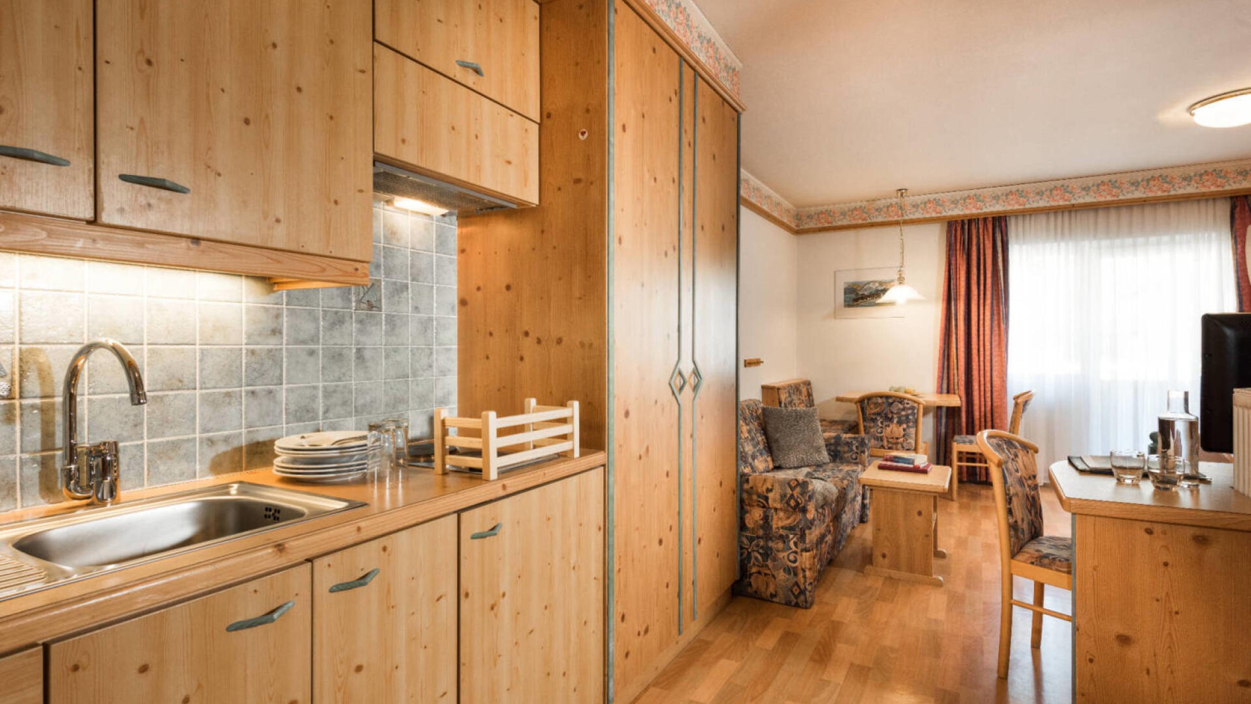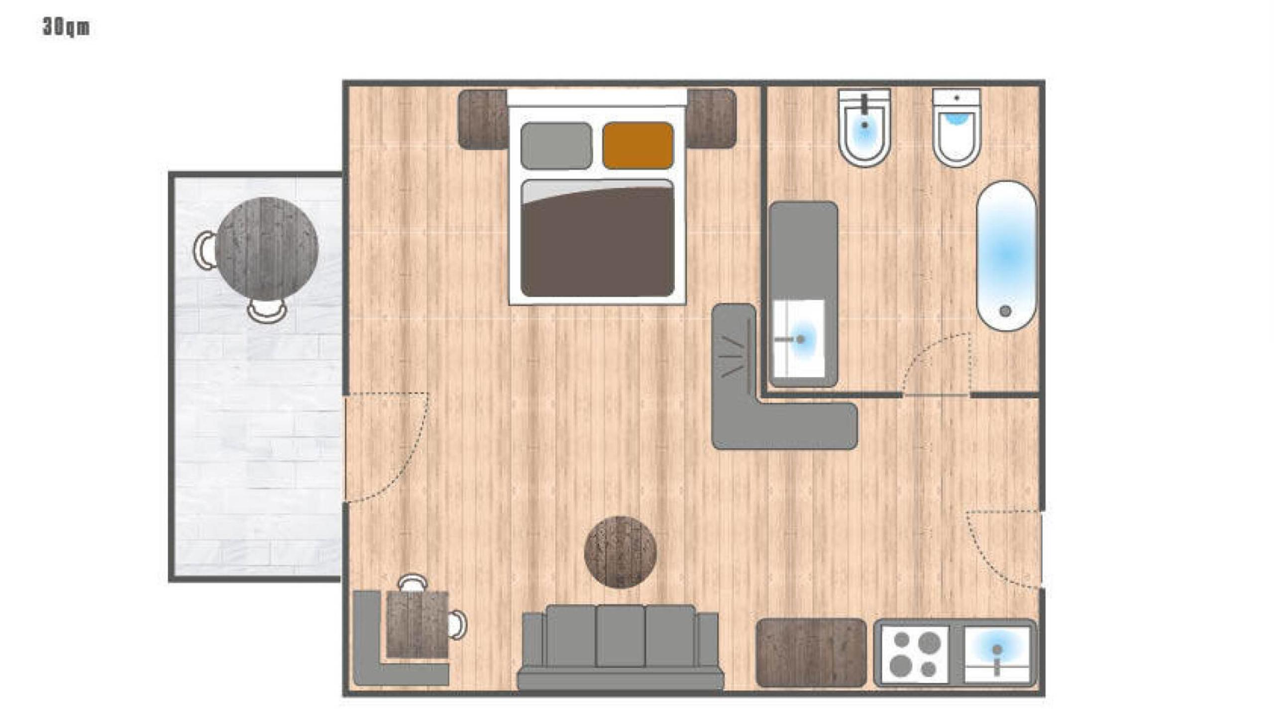 30 m²Questa luminosa camera con letto matrimoniale è il rifugio ideale per le famiglie con un bambino piccolo. Mobili in legno chiaro, un angolo cottura, un bagno completamente attrezzato e un balcone completano l’esperienza abitativa.
